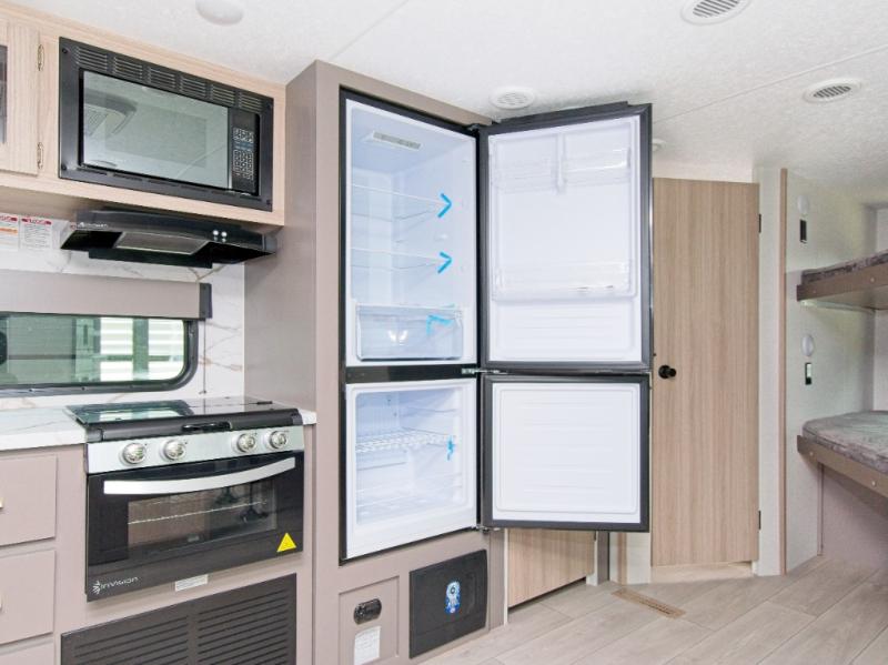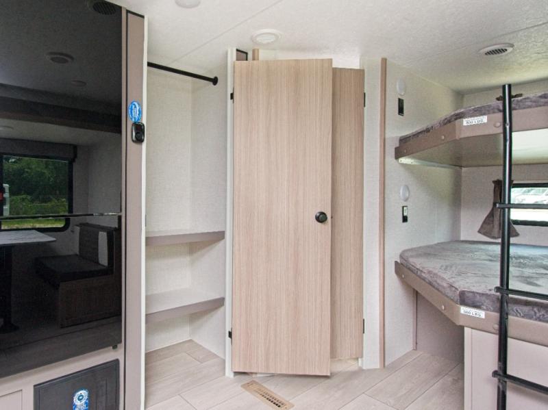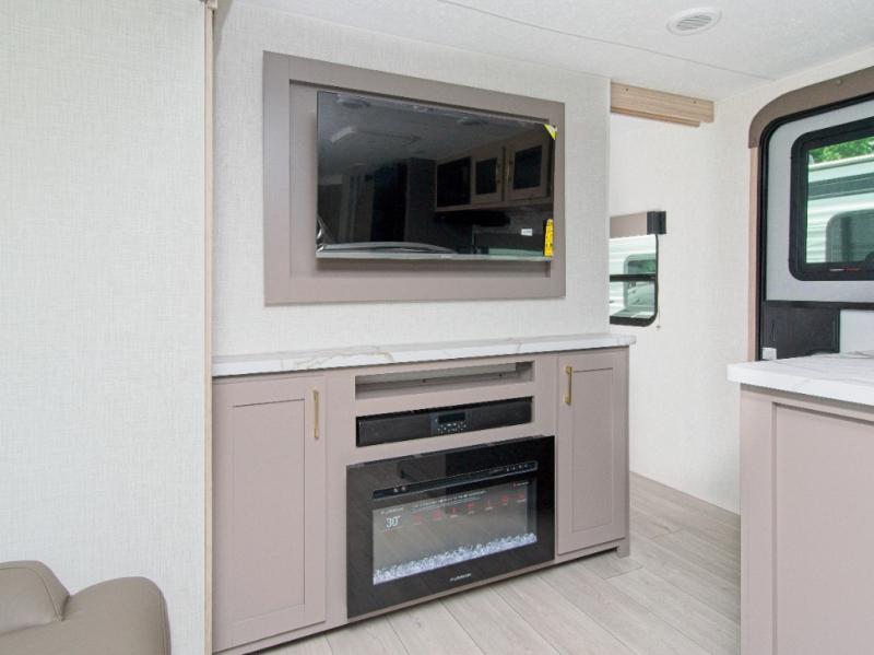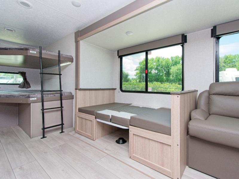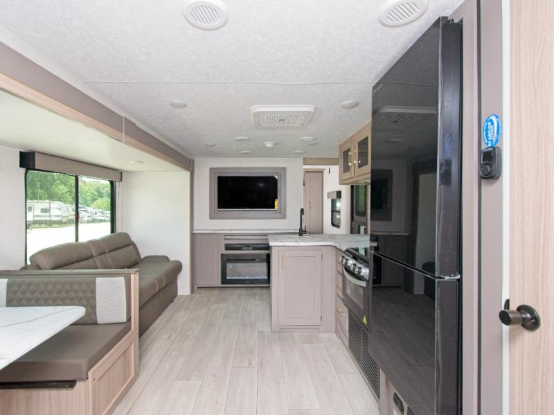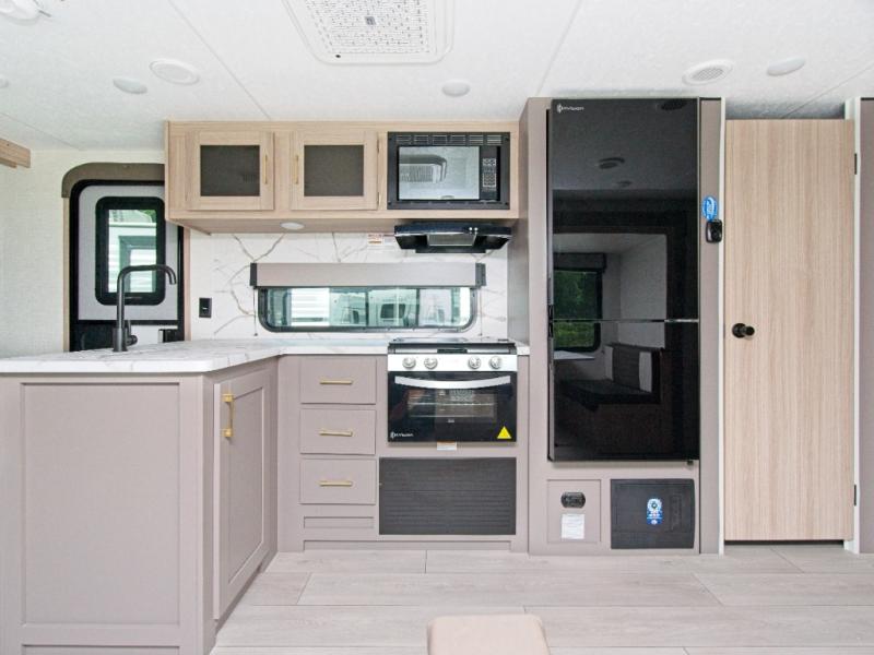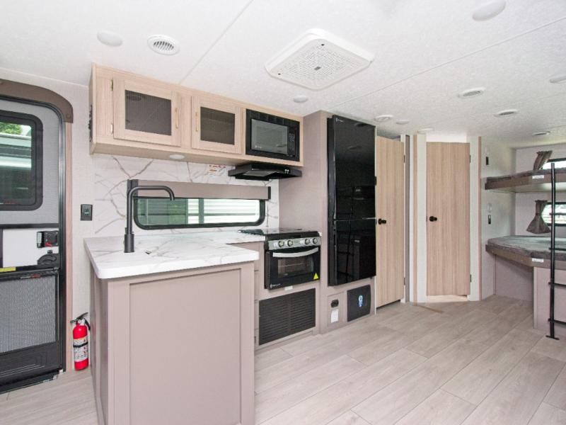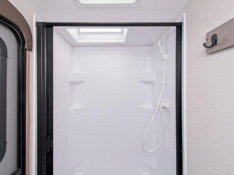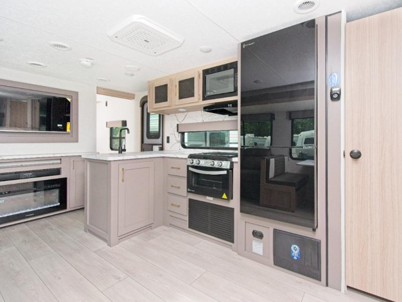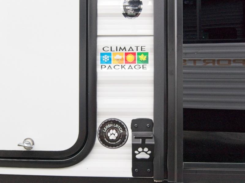 Modern Comforts: Inside, you'll find linoleum flooring throughout, a powerful 13,500 BTU air conditioner, large overhead cabinets, and a shower surround. Additional features include nitrogen-filled tires, solar and backup camera prep, and a Leash Latch with a bonus beverage opener.