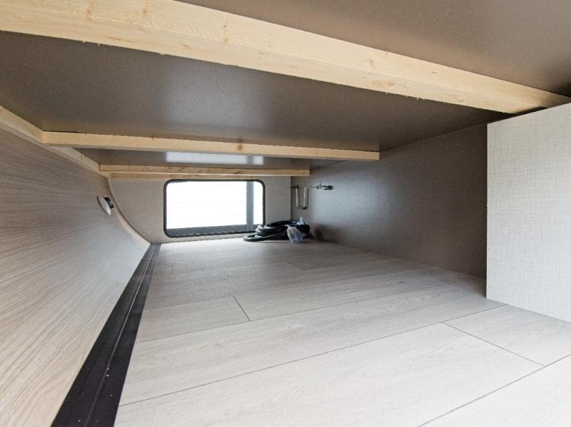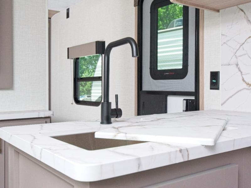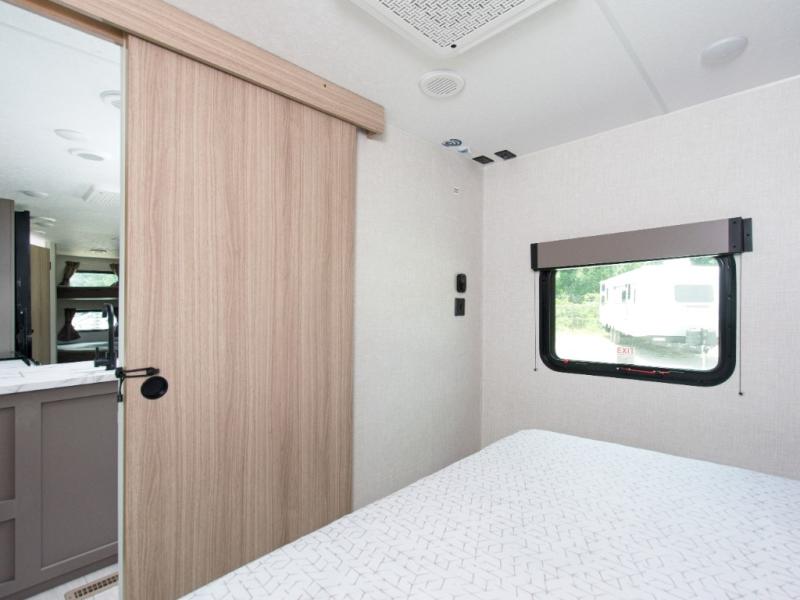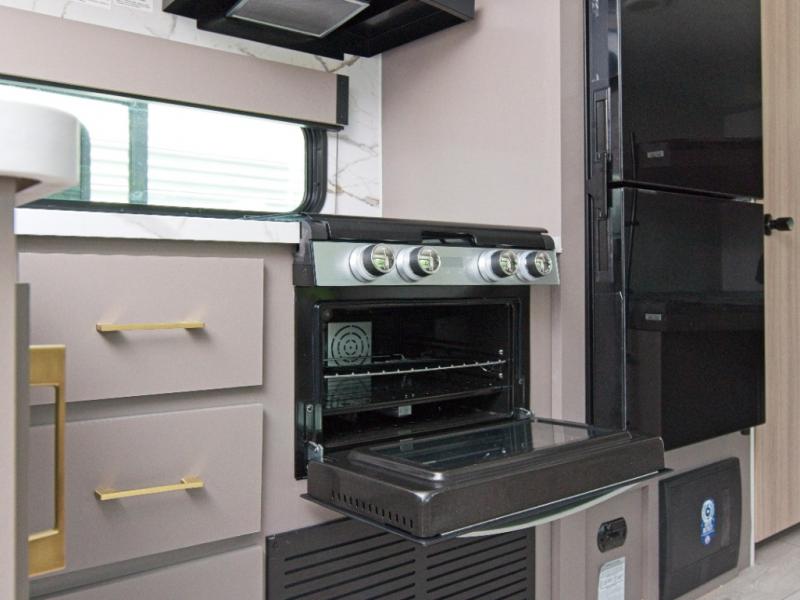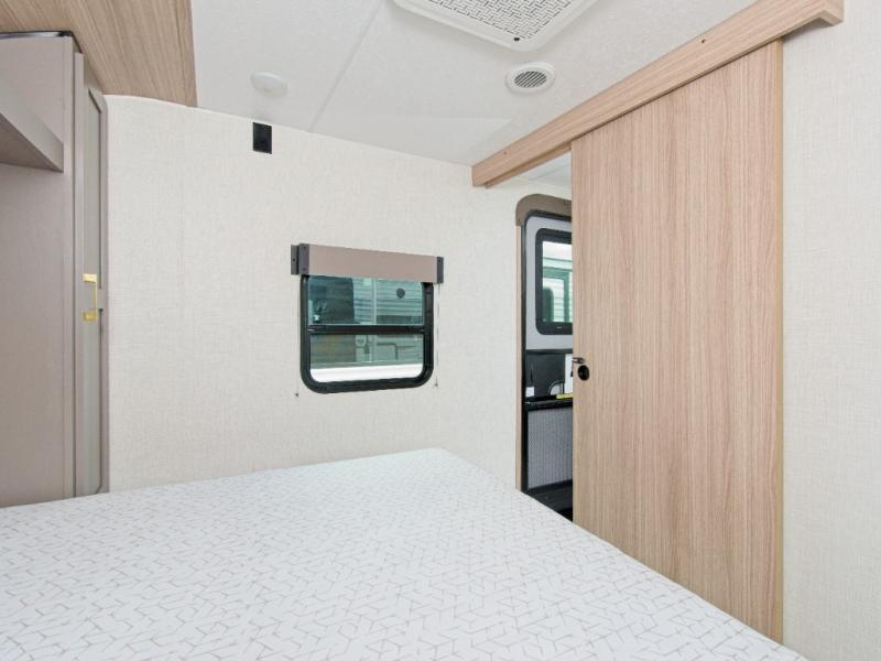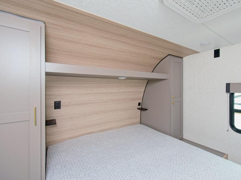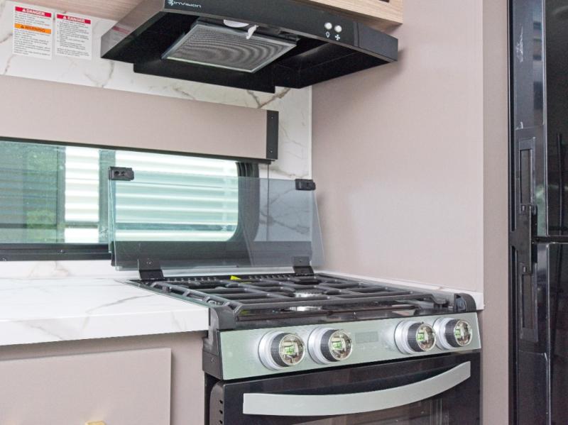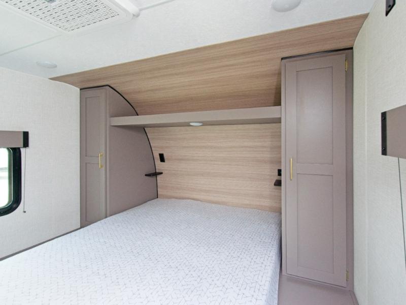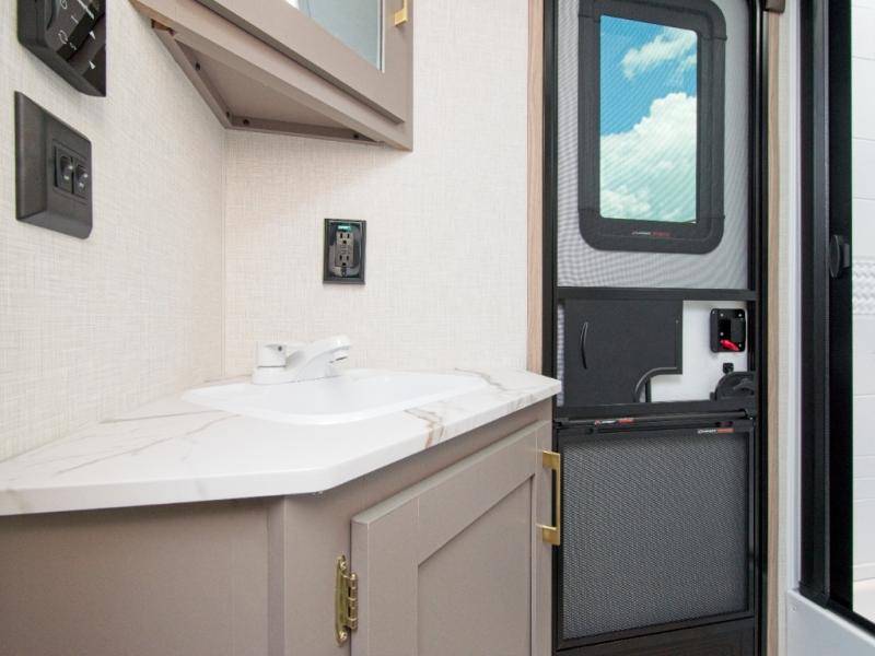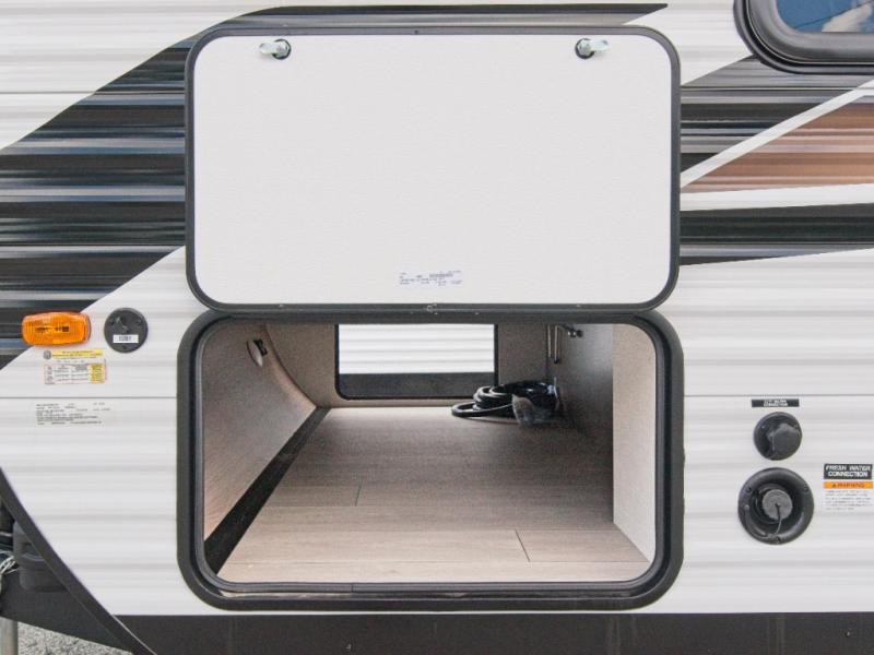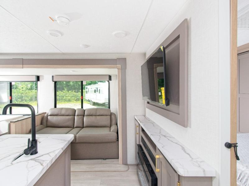 Modern Comforts: Inside, you'll find linoleum flooring throughout, a powerful 13,500 BTU air conditioner, large overhead cabinets, and a shower surround. Additional features include nitrogen-filled tires, solar and backup camera prep, and a Leash Latch with a bonus beverage opener.