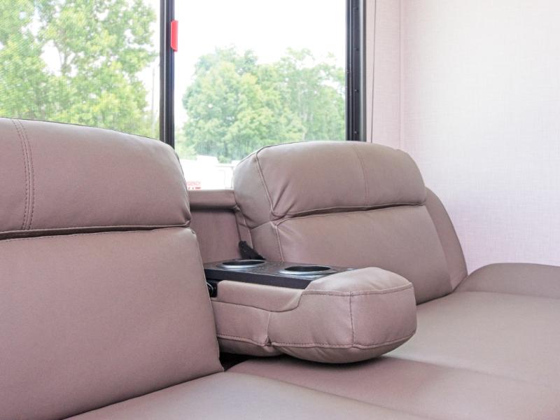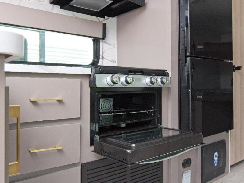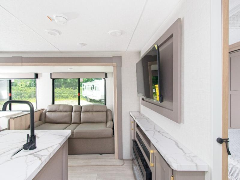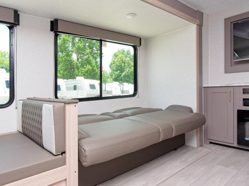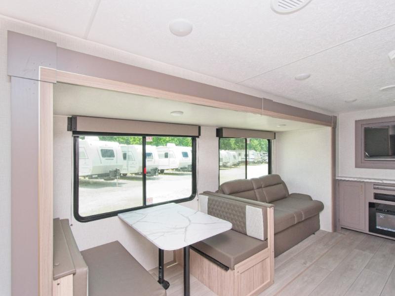 Comfortable Living Space: Inside, you'll find a 70" sofa and a booth dinette within the large slide out, providing ample seating and an entertainment center for your enjoyment. The interior kitchen is fully equipped with a three-burner cooktop, microwave oven, and a wardrobe/pantry for all your essentials.