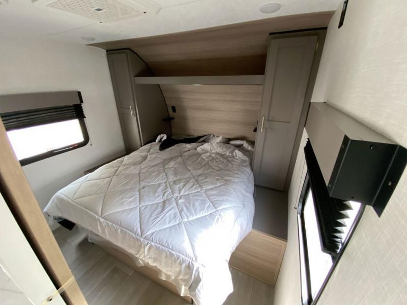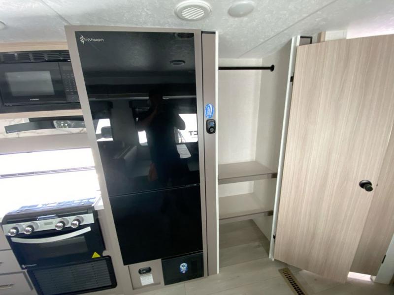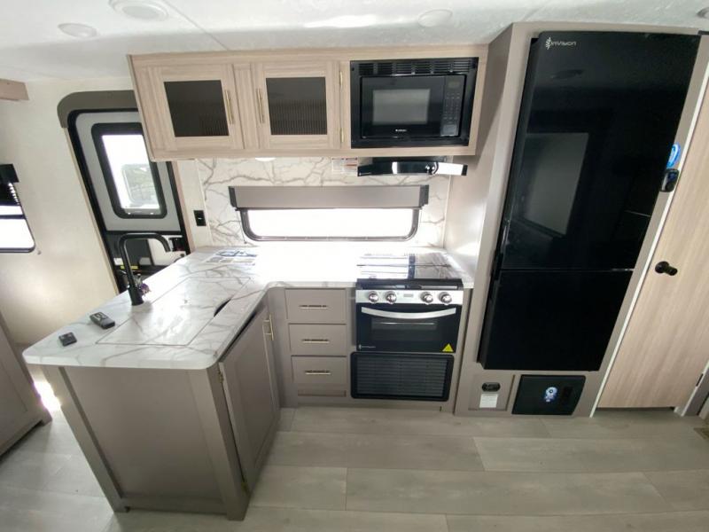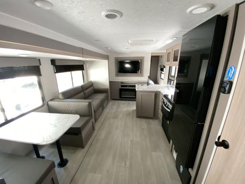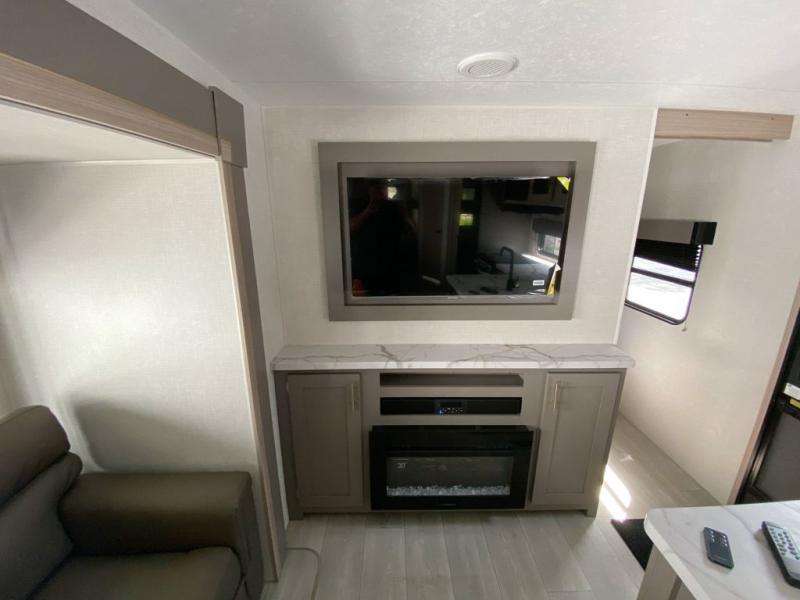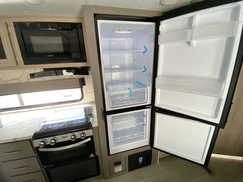 This is a great travel trailer to sleep all your friends or family! Once you arrive at the campground, the chef of your group can prepare lunch on the outside kitchen that includes a griddle and a refrigerator. The 18' power awning here will provide shade from the hot sun, and you can grab the lawn chairs from the pass-through storage to relax. You will find plenty of seating space inside on the 70" sofa and booth dinette within the large slide out, plus there is an entertainment center here. The interior kitchen includes everything you need to prepare meals each day, including a three burner cooktop, a microwave oven, plus a wardrobe/pantry for jackets or dry goods!