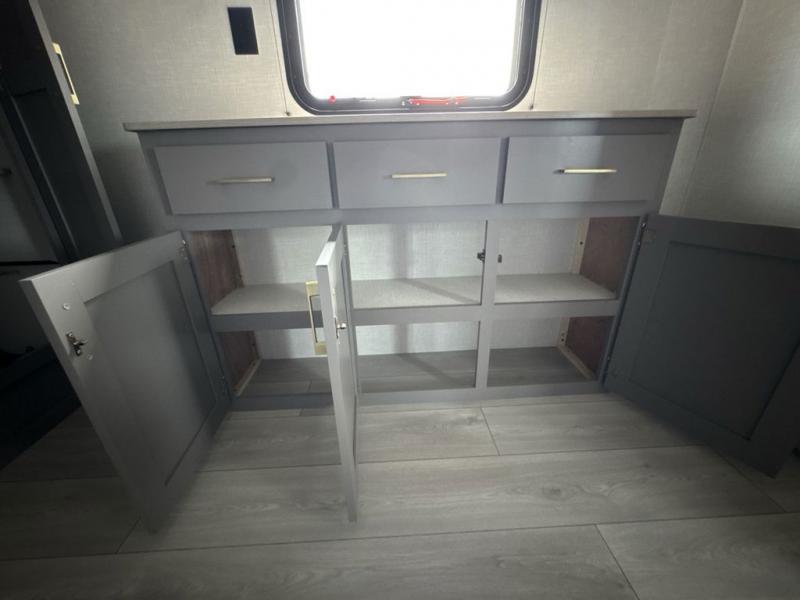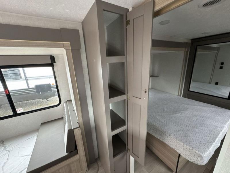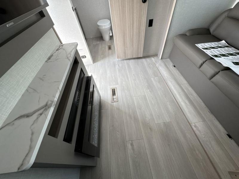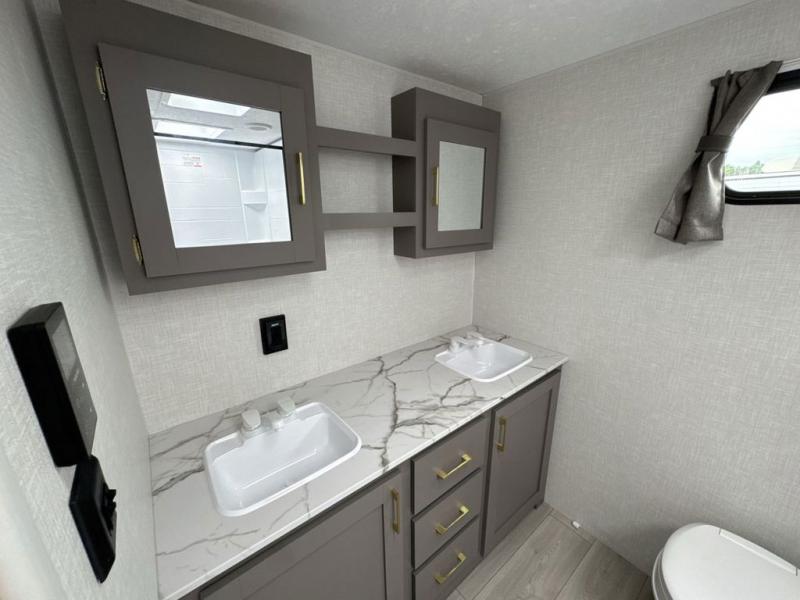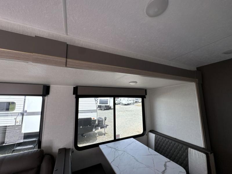 Let this travel trailer wow you with its interior comforts and exterior conveniences! There is ample space inside to move about thanks to the double slides; a large slide in the living room and a queen bed slide in the front bedroom! Your crew can relax on the 70" jackknife sofa across from the fireplace and LED TV, or play a game at the booth dinette. You will appreciate having a walk-in pantry with coat hooks right as you enter the unit, and there is more storage space found throughout. The full rear bath features a 30" x 40" shower, a linen closet, plus dual bath sinks so you both can get ready for bed at the same time! This model also includes an outside kitchen with a griddle and refrigerator plus a full interior kitchen as well!