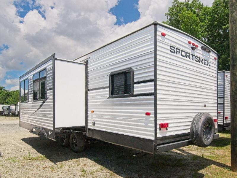 Escape to the lake with the KZ Sportsmen SE Travel Trailer, featuring a spacious layout that sleeps up to ten and an outdoor kitchen perfect for al fresco dining!