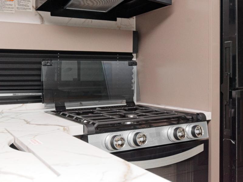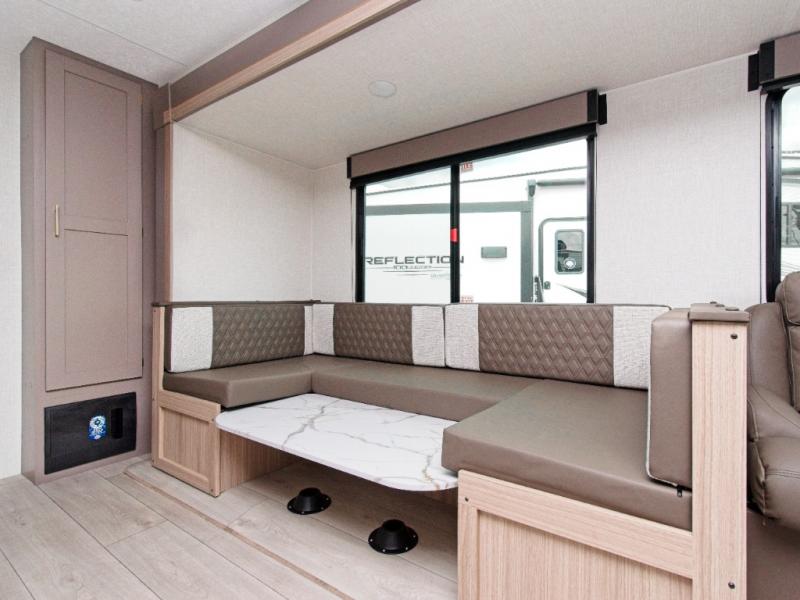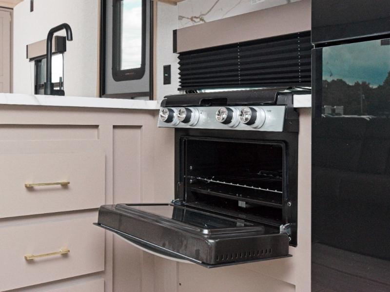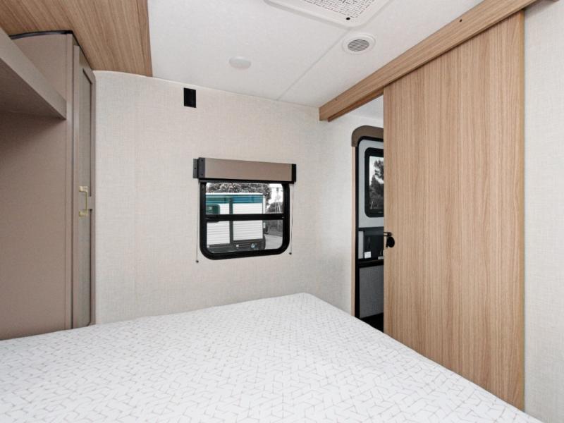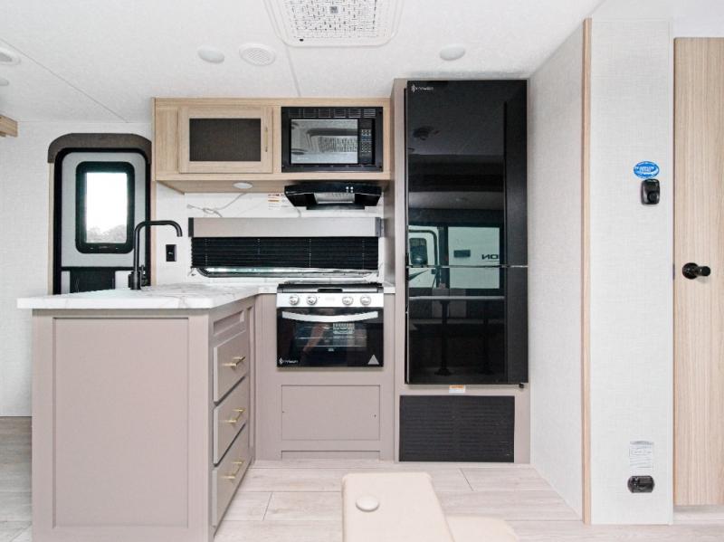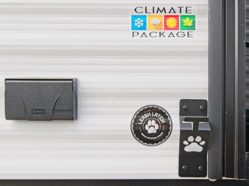 Modern Comforts: Inside, you'll find linoleum flooring throughout, a powerful 13,500 BTU air conditioner, large overhead cabinets, and a shower surround. Additional features include nitrogen-filled tires, solar and backup camera prep, and a Leash Latch with a bonus beverage opener.