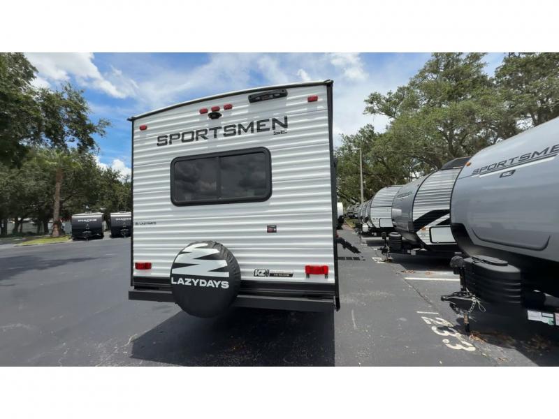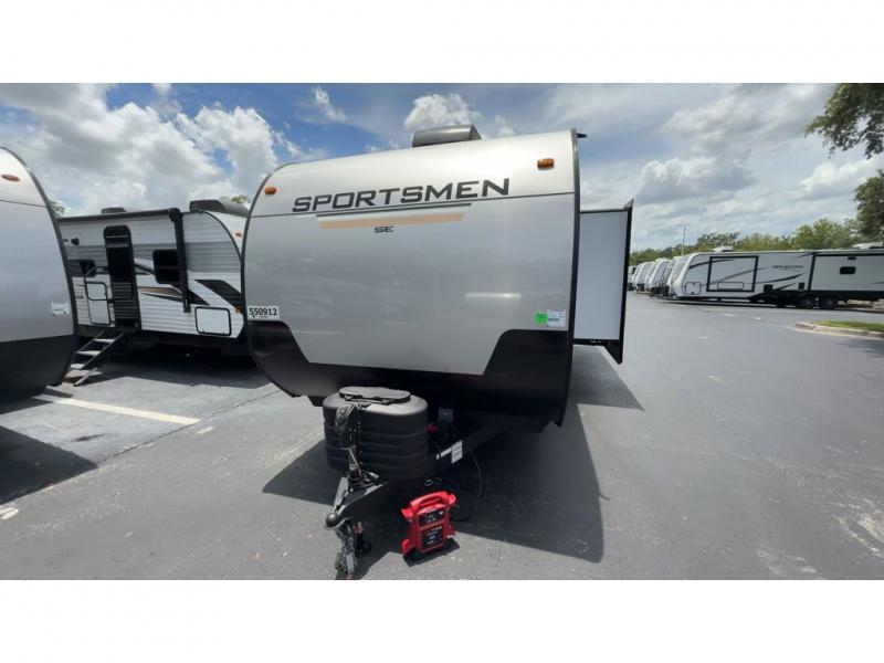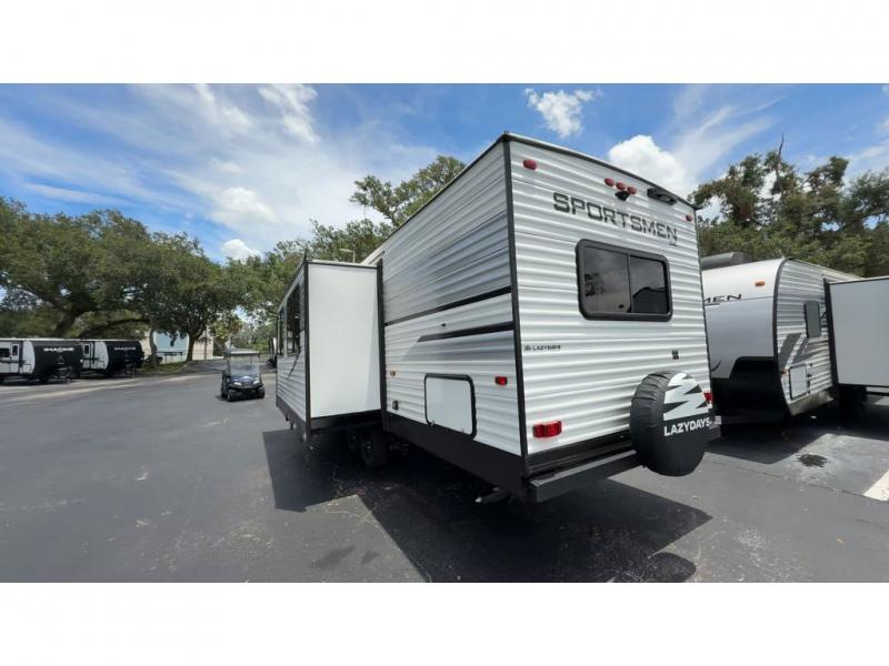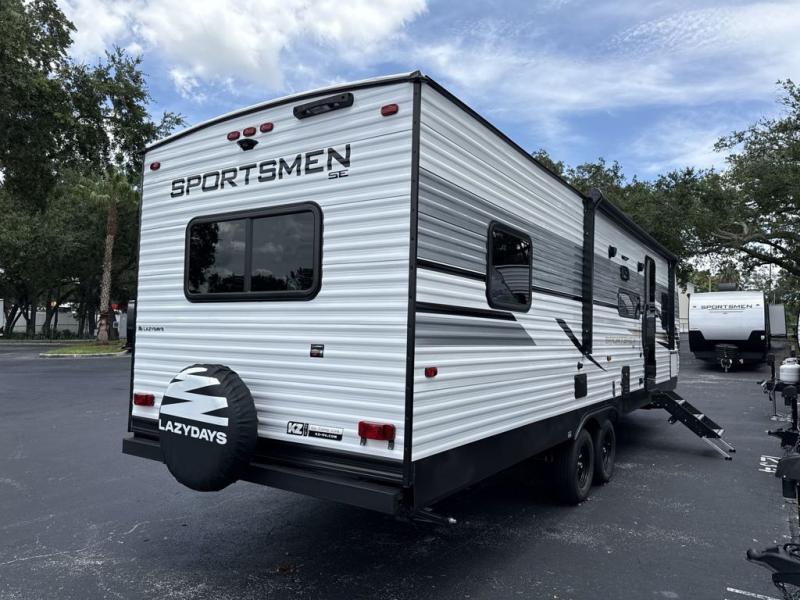 Each Sportsmen SE travel trailer and toy hauler by KZ is constructed with KZ exclusive tough shield exterior metal, a one-piece seamless walk-on Tufflex roofing material, and diamond plate rock guard to protect your unit from road debris. You will appreciate the extra large baggage doors for stowing away your gear when not in use, and tinted windows to help keep the harmful sun rays out plus keeping it cooler inside. Some of the exterior conveniences found in the mandatory Advantage Package are the solid folding steps with a large folding grab handle for easy entry and exit, a full glass friction hinged entry door, plus an exterior shower for your pets or to rinse off before you head inside. You'll also appreciate the nitrogen-filled tires, solar and backup camera prep, plus a Leash Latch with a bonus beverage opener. You'll feel right at home inside with linoleum flooring throughout, a 13,500 BTU air conditioner, large overhead cabinets, a shower surround, and much more!