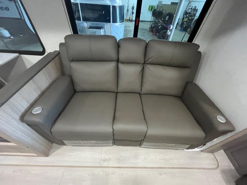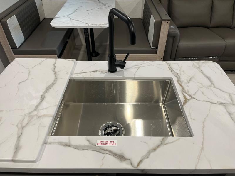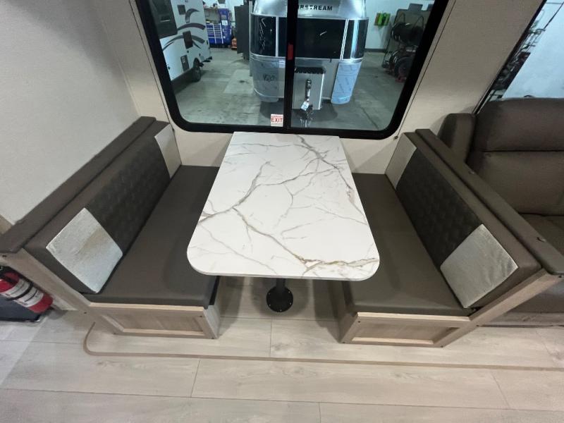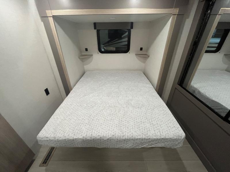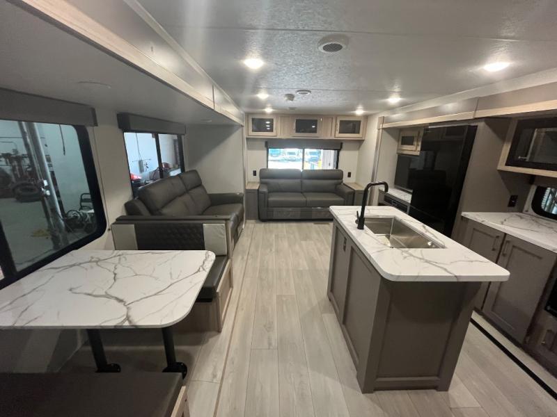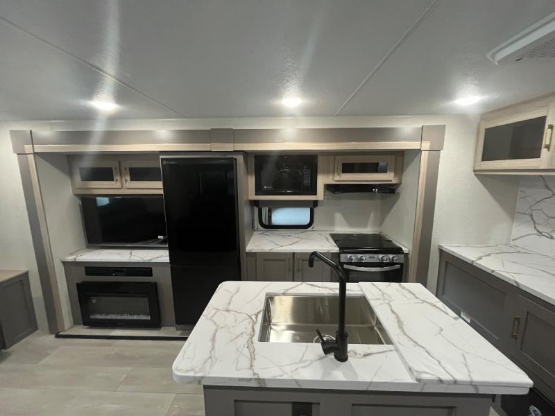 Wow! Check out the space you will have in this travel trailer with dual opposing slides in the rear living area, plus a slide out queen bed in the bedroom! The kitchen island will provide more counter space, along with the hutch/pantry that includes a microwave above. Your crew can relax on the theater seating, booth dinette, or 70" sofa after dinner is cleaned up, plus you have a 30" fireplace for a more at-home feel. This model also includes a 12' power awning so relax under during day!