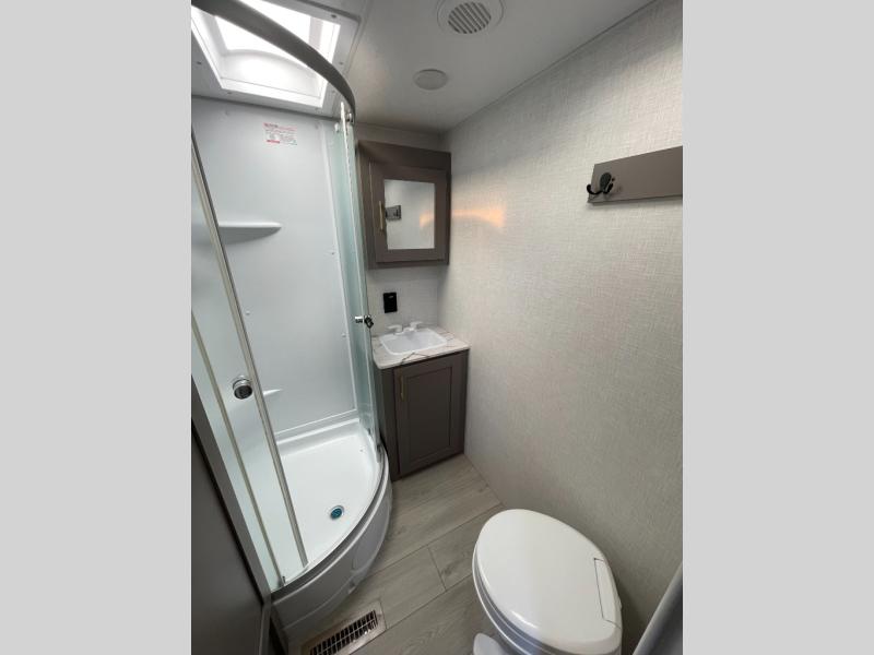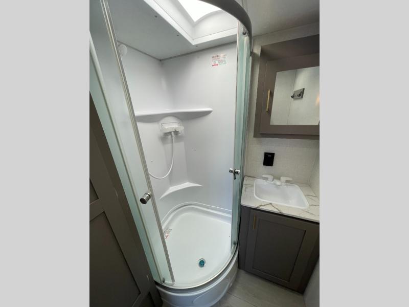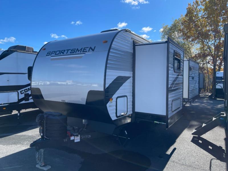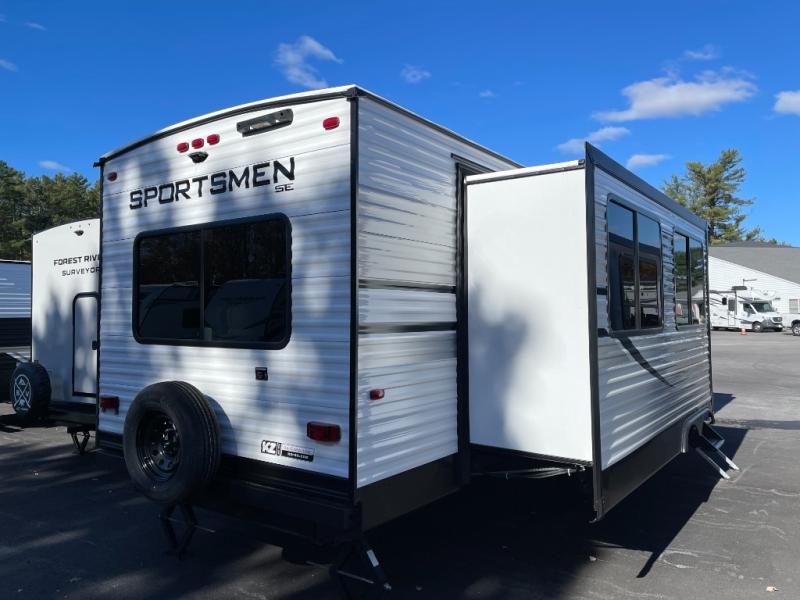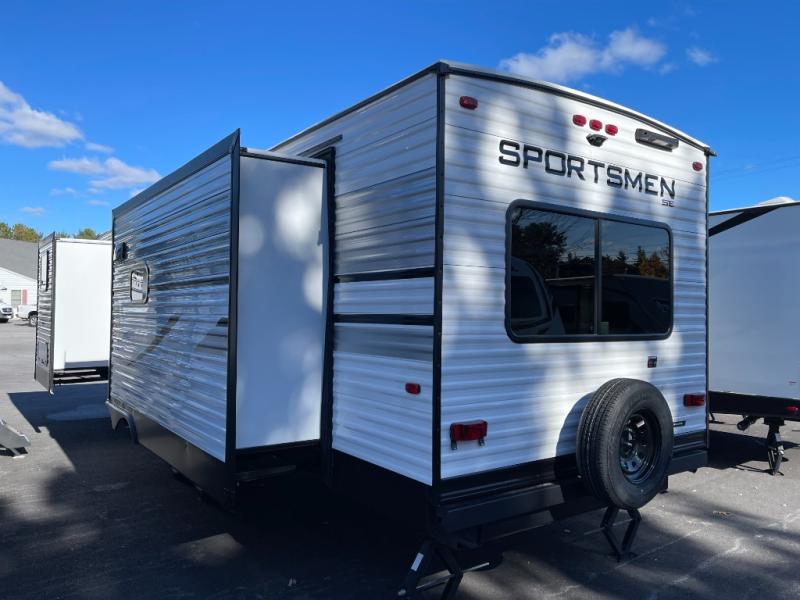 Each Sportsmen SE travel trailer and toy hauler by KZ is constructed with KZ exclusive tough shield exterior metal, a one-piece seamless walk-on Tufflex roofing material, and diamond plate rock guard to protect your unit from road debris. You will appreciate the extra large baggage doors for stowing away your gear when not in use, and tinted windows to help keep the harmful sun rays out plus keeping it cooler inside. Some of the exterior conveniences found in the mandatory Advantage Package are the solid folding steps with a large folding grab handle for easy entry and exit, a full glass friction hinged entry door, plus an exterior shower for your pets or to rinse off before you head inside. You'll also appreciate the nitrogen-filled tires, solar and backup camera prep, plus a Leash Latch with a bonus beverage opener. You'll feel right at home inside with linoleum flooring throughout, a 13,500 BTU air conditioner, large overhead cabinets, a shower surround, and much more!
