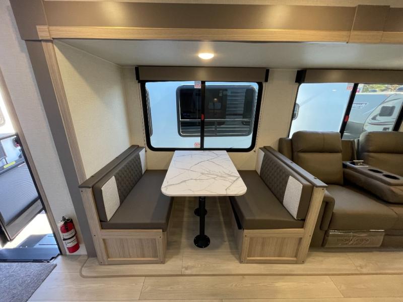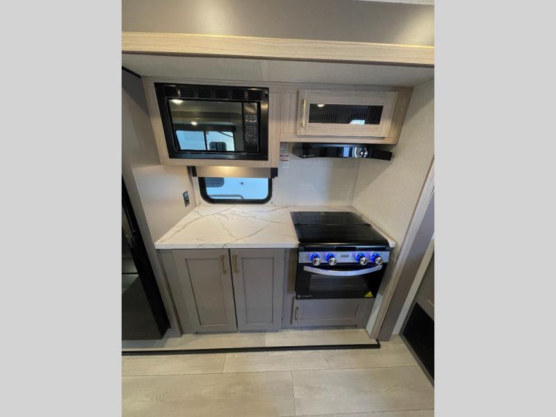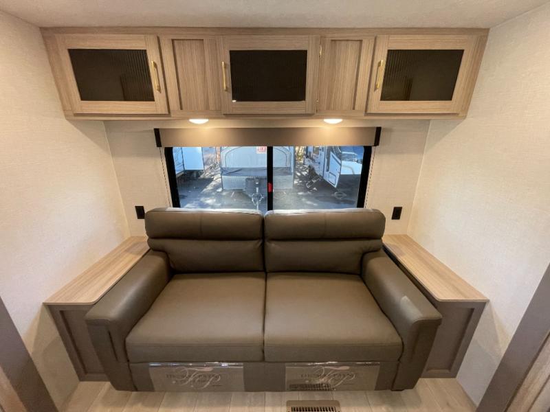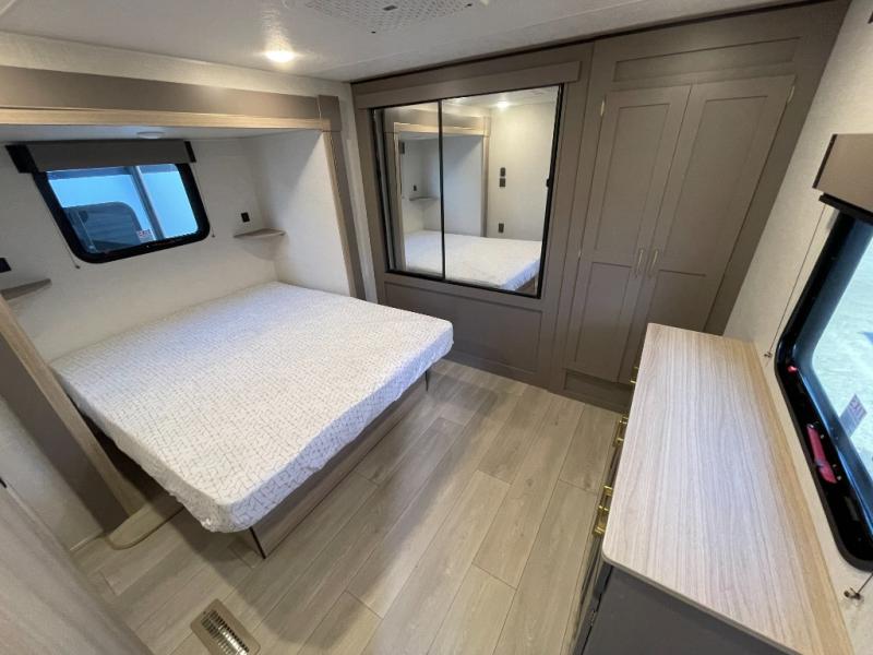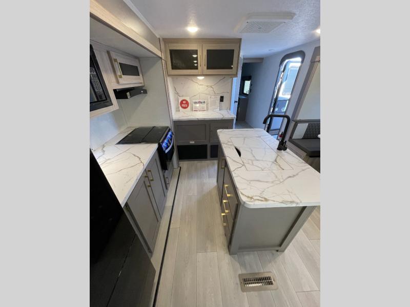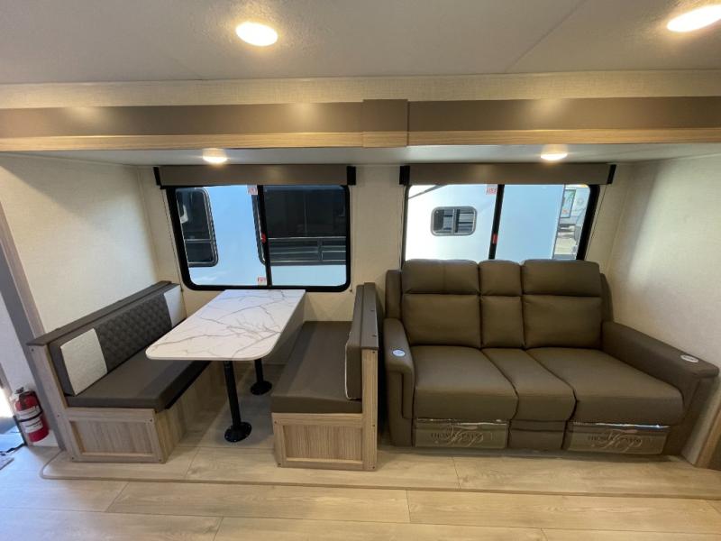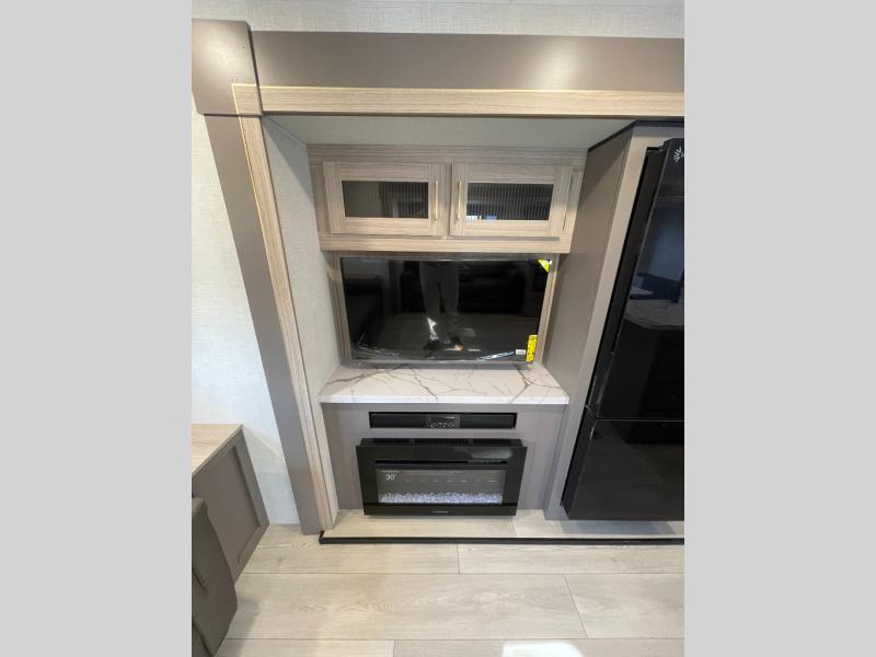 Wow! Check out the space you will have in this travel trailer with dual opposing slides in the rear living area, plus a slide out queen bed in the bedroom! The kitchen island will provide more counter space, along with the hutch/pantry that includes a microwave above. Your crew can relax on the theater seating, booth dinette, or 70" sofa after dinner is cleaned up, plus you have a 30" fireplace for a more at-home feel. This model also includes a 12' power awning so relax under during day!