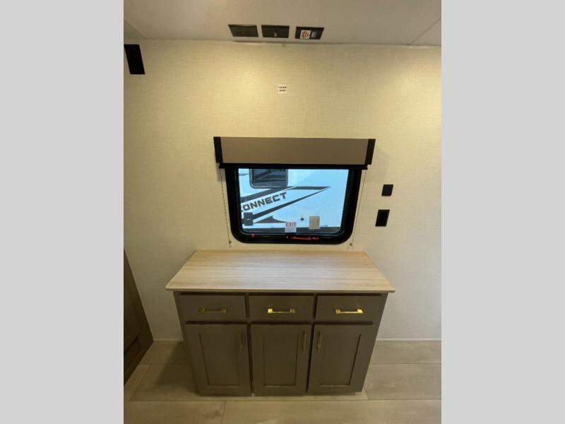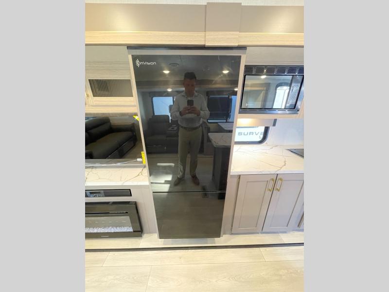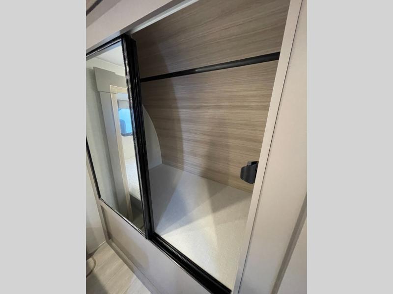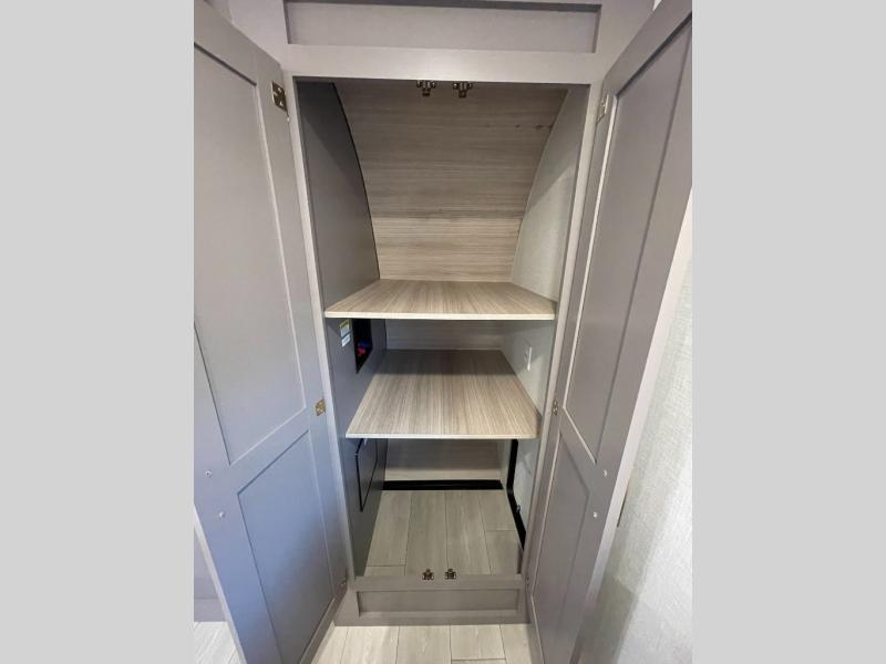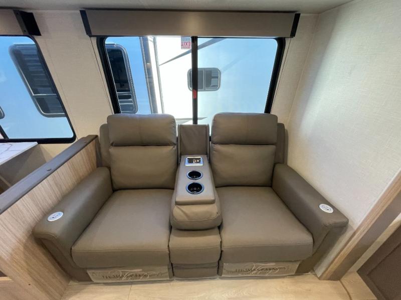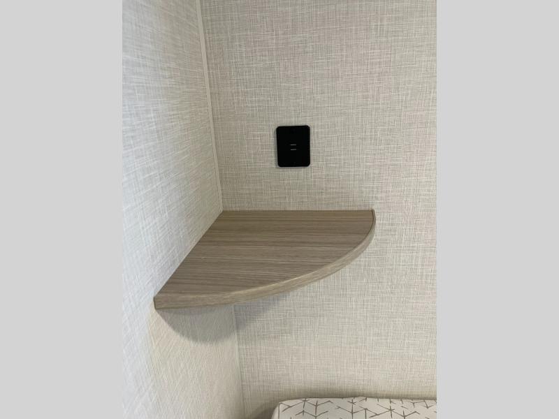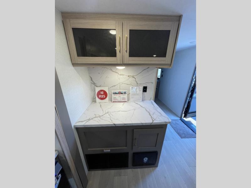 Wow! Check out the space you will have in this travel trailer with dual opposing slides in the rear living area, plus a slide out queen bed in the bedroom! The kitchen island will provide more counter space, along with the hutch/pantry that includes a microwave above. Your crew can relax on the theater seating, booth dinette, or 70" sofa after dinner is cleaned up, plus you have a 30" fireplace for a more at-home feel. This model also includes a 12' power awning so relax under during day!