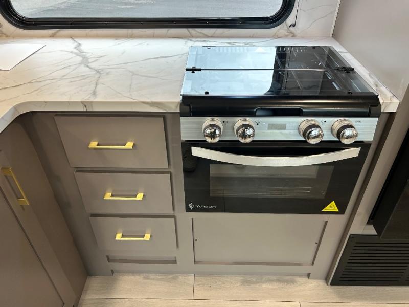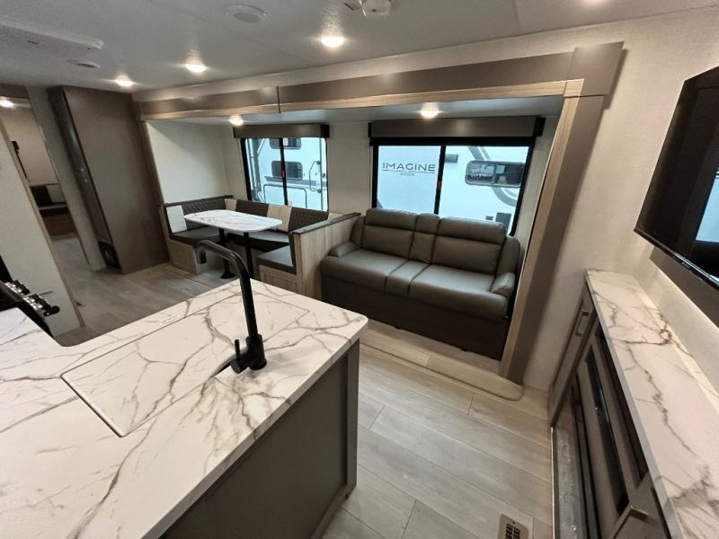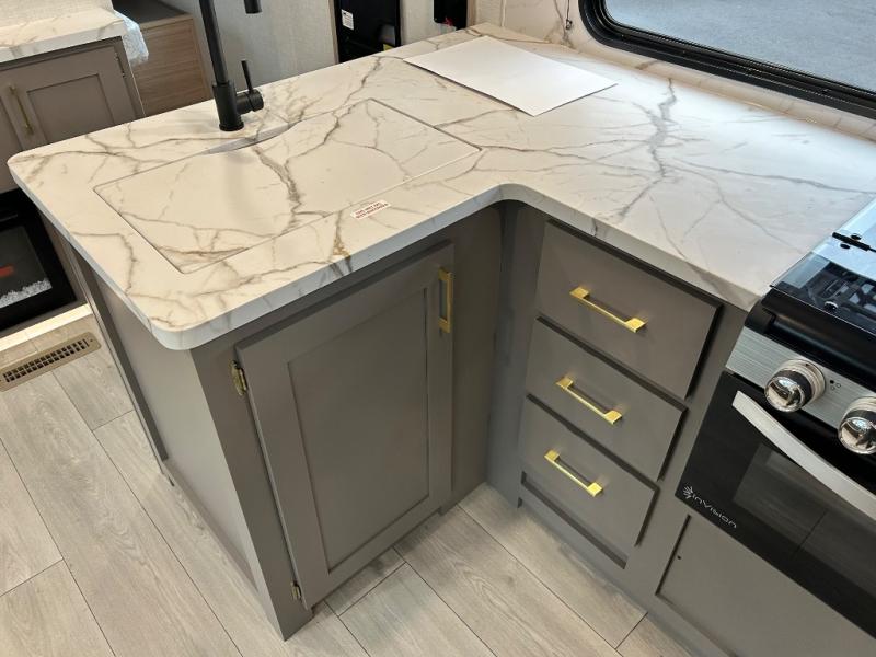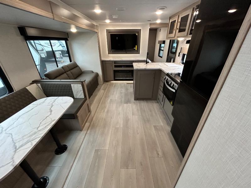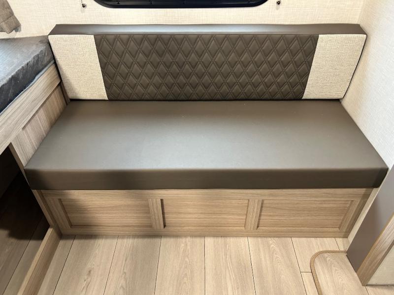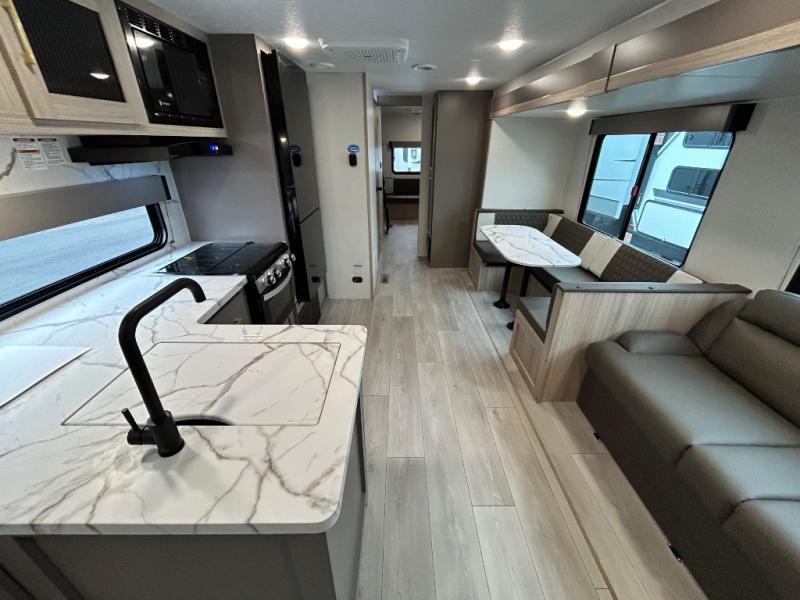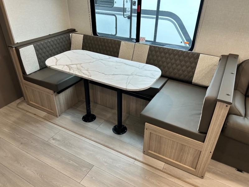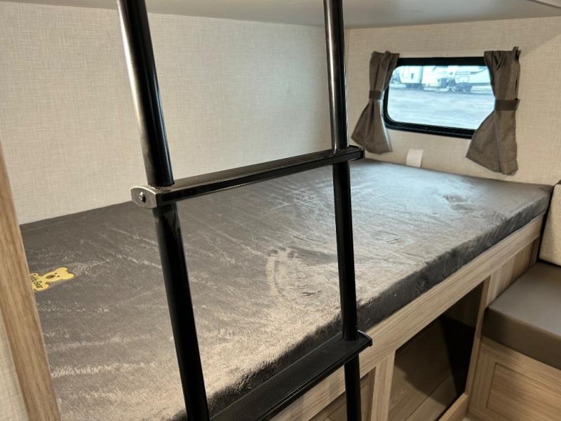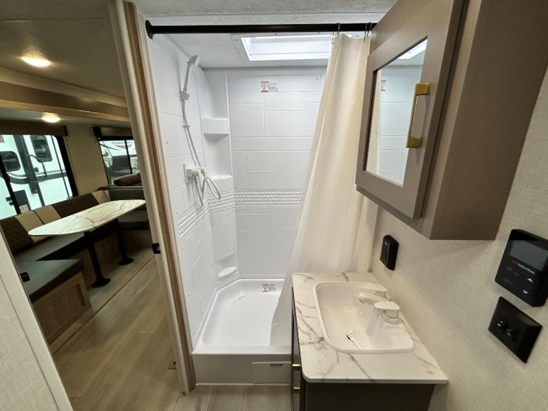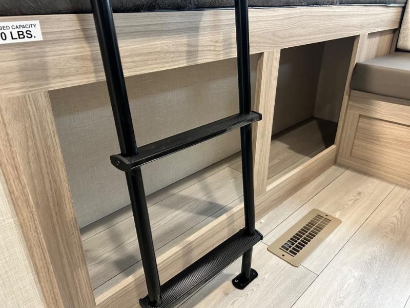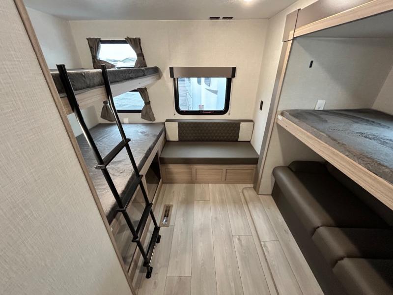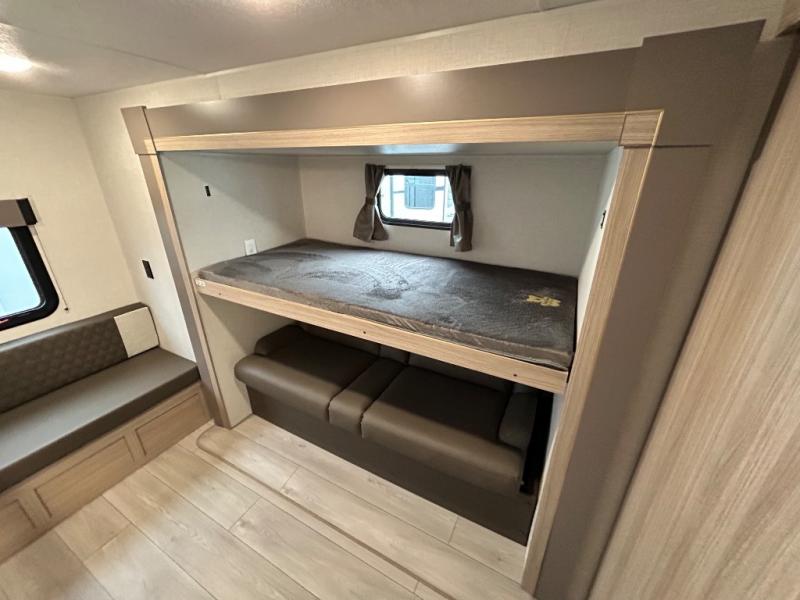 If you've been looking for a travel trailer with plenty of space for your family or group of friends, look no further than this one! The private bunkhouse includes two bunks, plus a third bunk across the room and a jiffy sofa below. There is also a bench seat here, and the full bath is close by for convenience. Everyone can gather in the main living area at the 80" U-shaped dinette, and there is a 64" sofa here for more seating space. If the weather is nice, head outdoors to relax under the 20' power awning with LED lights as the cook prepares dinner on the outside griddle!