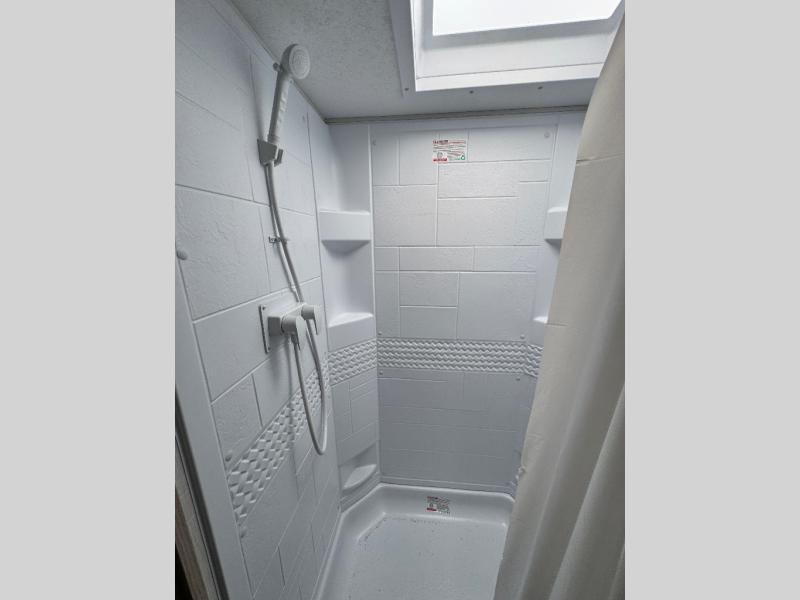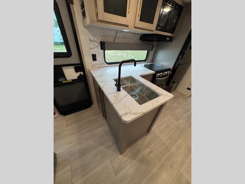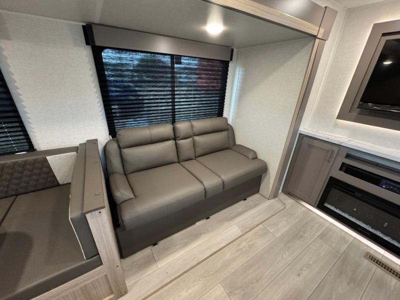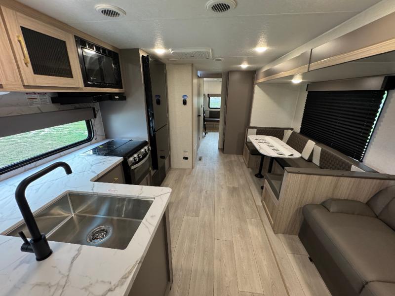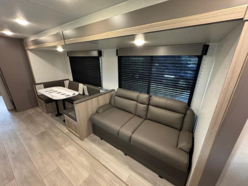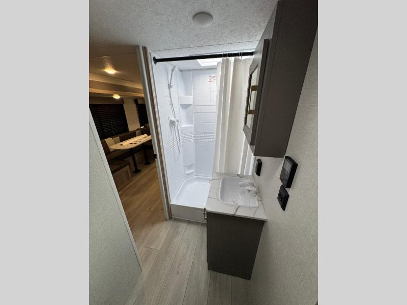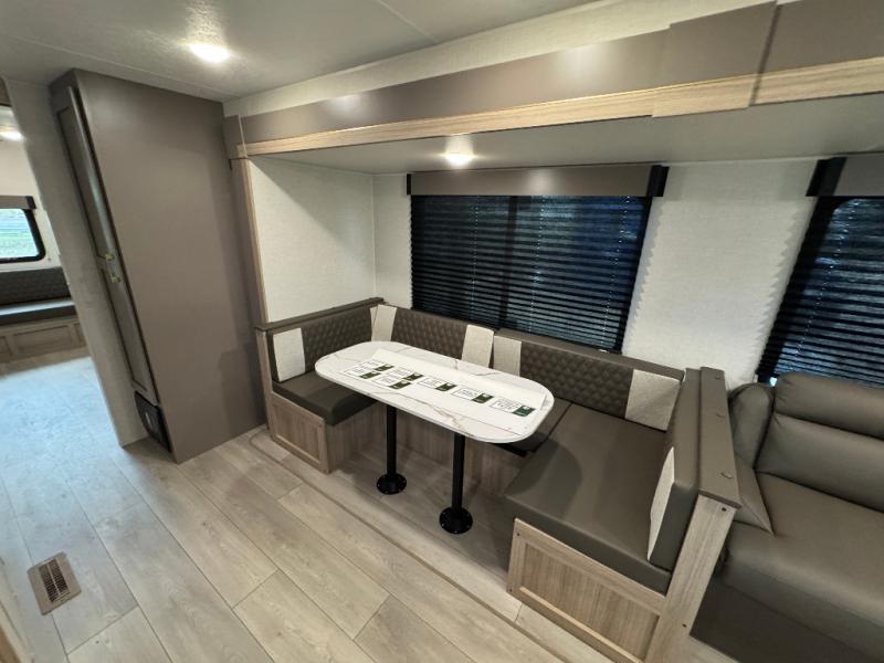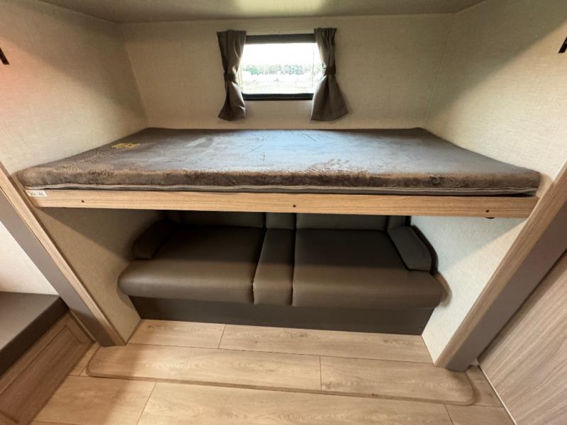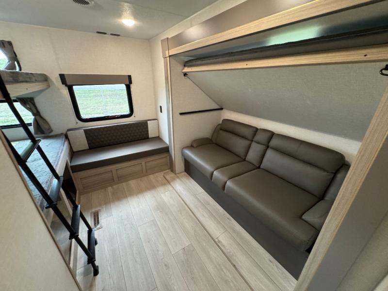 If you've been looking for a travel trailer with plenty of space for your family or group of friends, look no further than this one! The private bunkhouse includes two bunks, plus a third bunk across the room and a jiffy sofa below. There is also a bench seat here, and the full bath is close by for convenience. Everyone can gather in the main living area at the 80" U-shaped dinette, and there is a 64" sofa here for more seating space. If the weather is nice, head outdoors to relax under the 20' power awning with LED lights as the cook prepares dinner on the outside griddle!