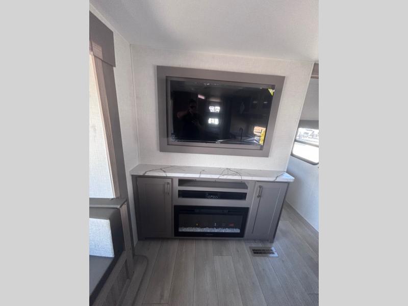 This travel trailer can comfortably sleep eight between the double-size bunks, the queen bed in the front bedroom, plus the booth dinette and jackknife sofa in the main living area. Everyone can freshen up each day in the full bath that includes a shower pan, foot flush toilet, and a sink. The chef of your group can make dinner on the two burner drop-in cooktop or in the microwave oven, and there is a 10 cu. ft. 12V refrigerator for perishables. This model also includes a TV mount if you want to add a television for movie nights, and there is an exterior pas-through storage for fishing poles, camp chairs, and more!