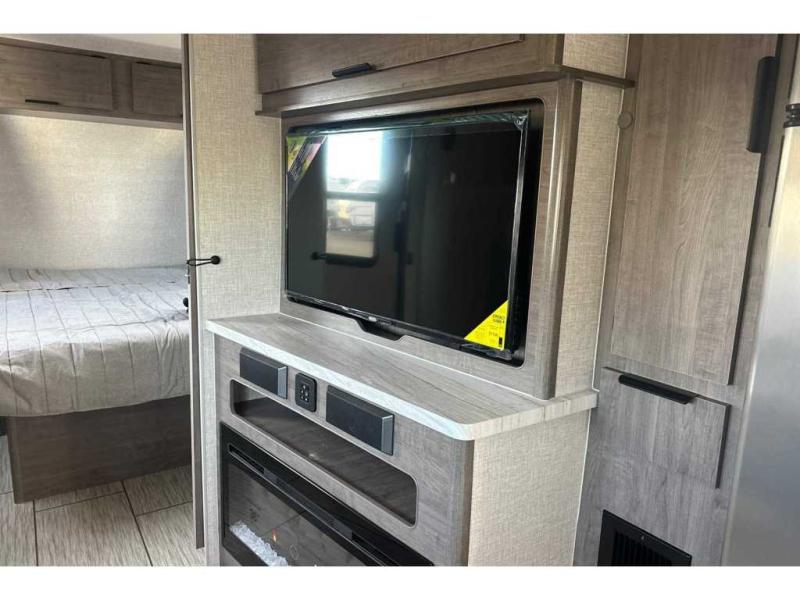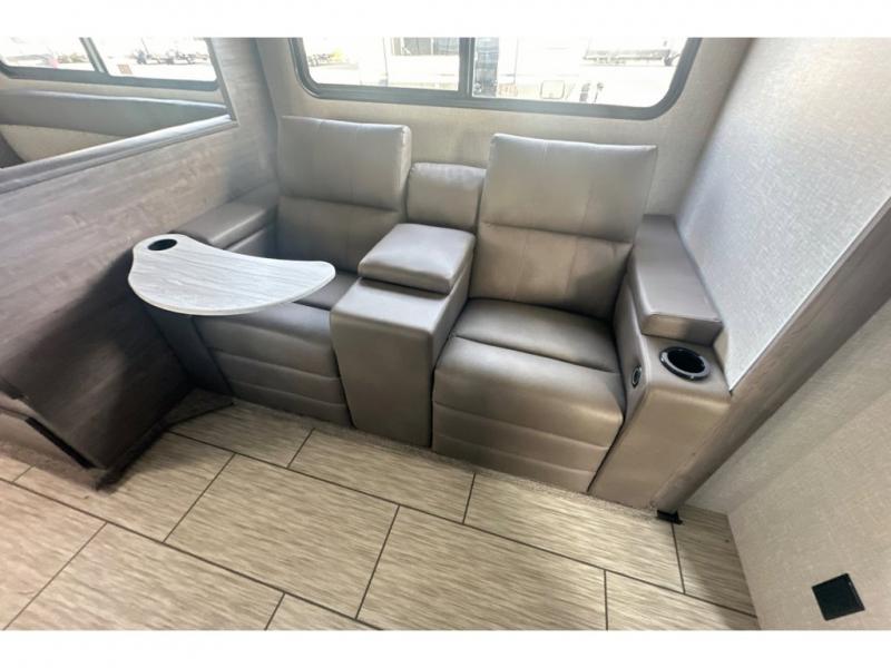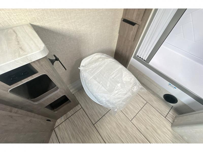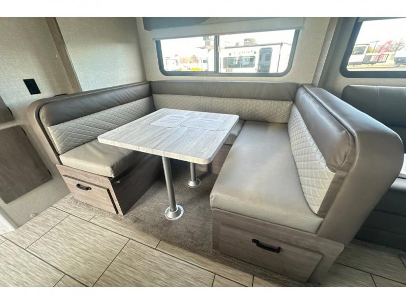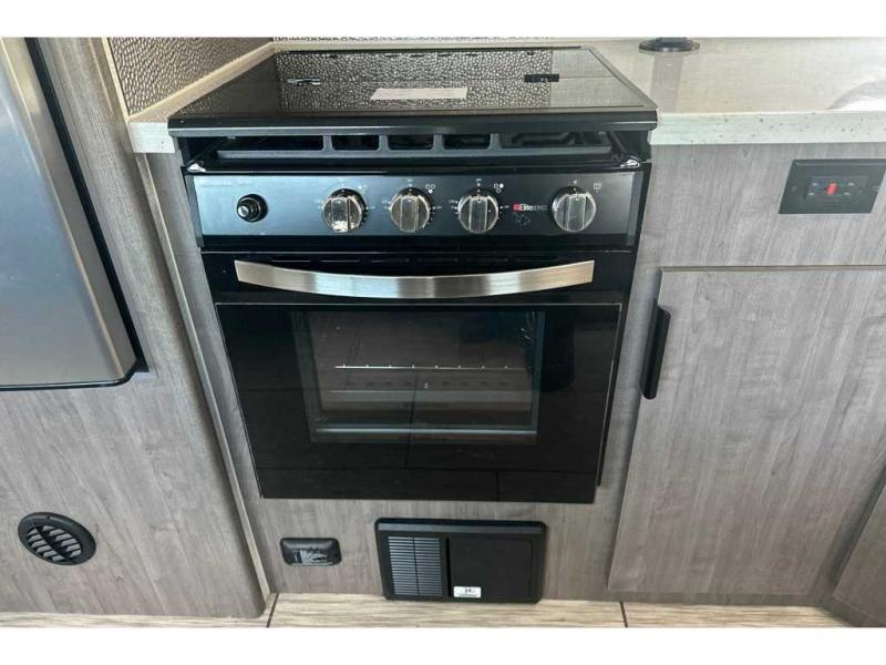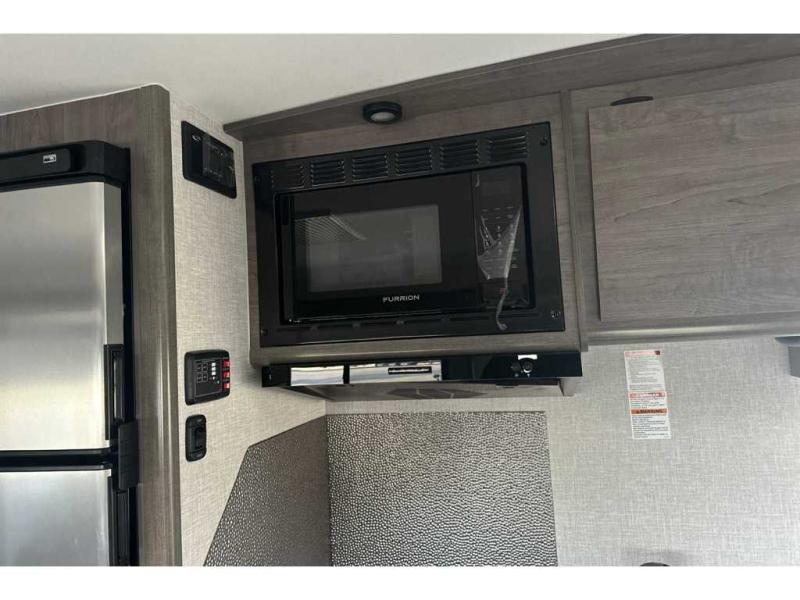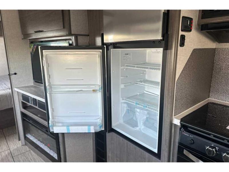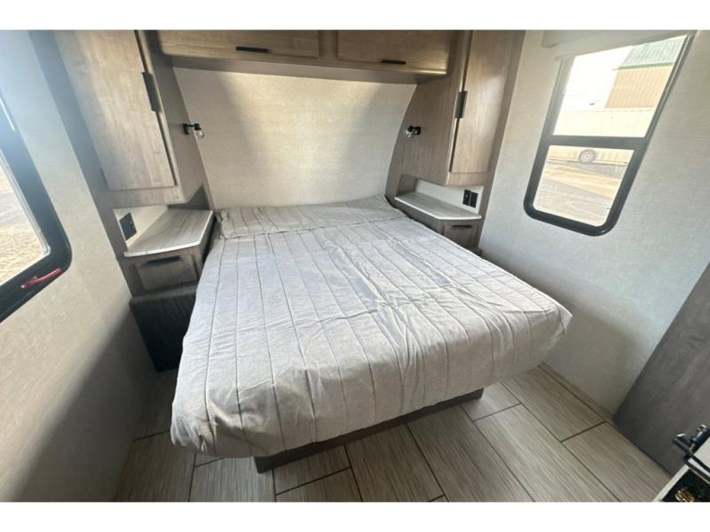 Escape to the campground in this travel trailer that can sleep four campers each night. You will love having your own space in the front private bedroom, and the dual wardrobes plus a closet will keep your belongings tidy. The combined kitchen and living area includes a large slide out for added space, and you'll enjoy a U-shaped dinette and theater seating here for relaxing, dining, and letting guests sleep over. A fully equipped kitchen lets you make meals each day, and the spacious full rear bath means you won't have to use the camp's facilities; how convenient!