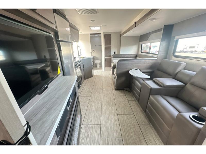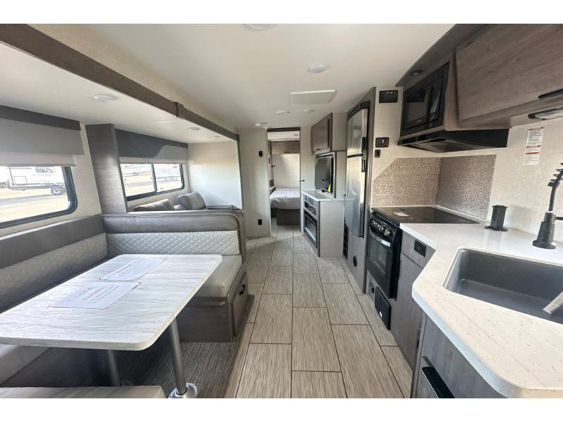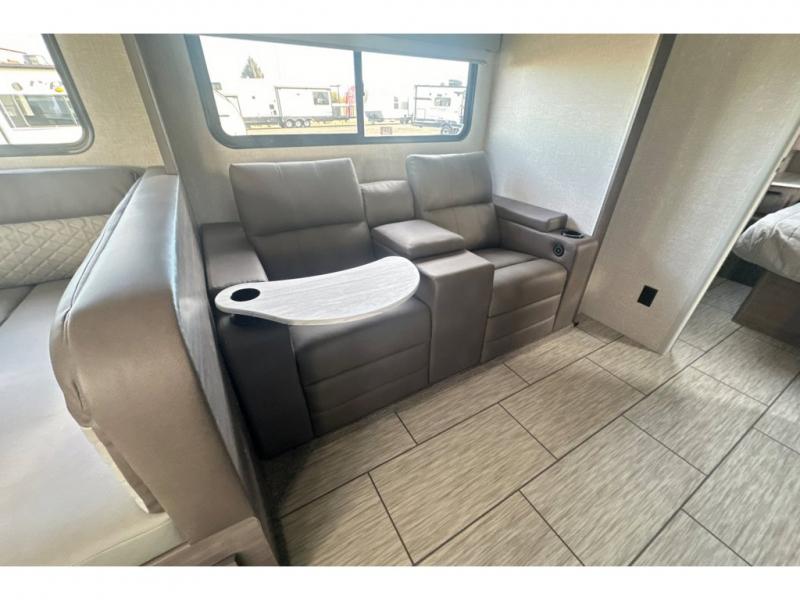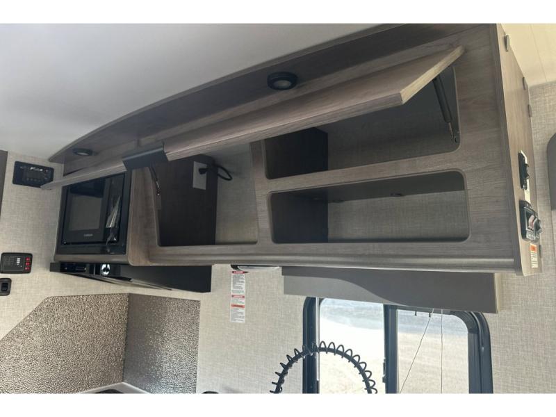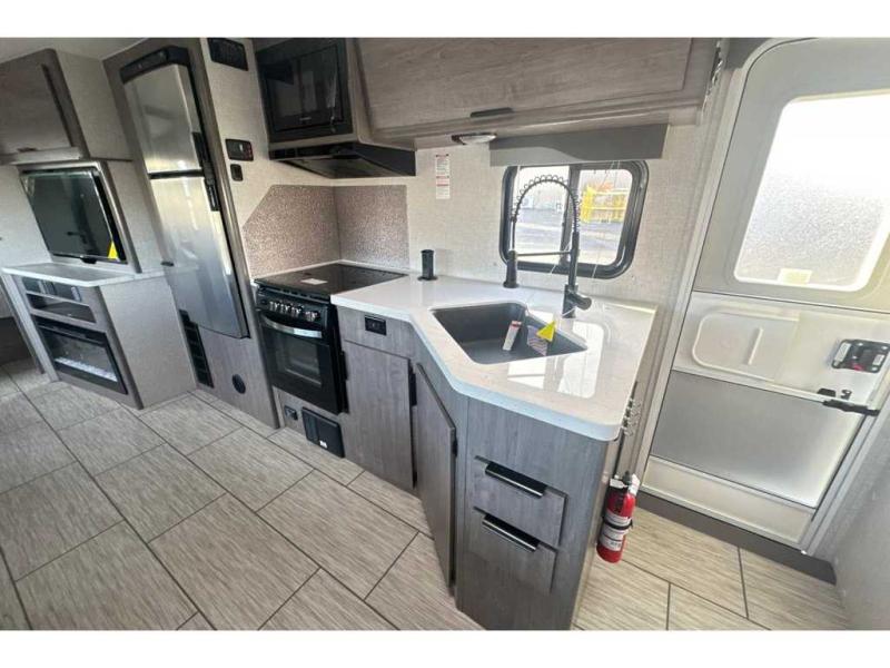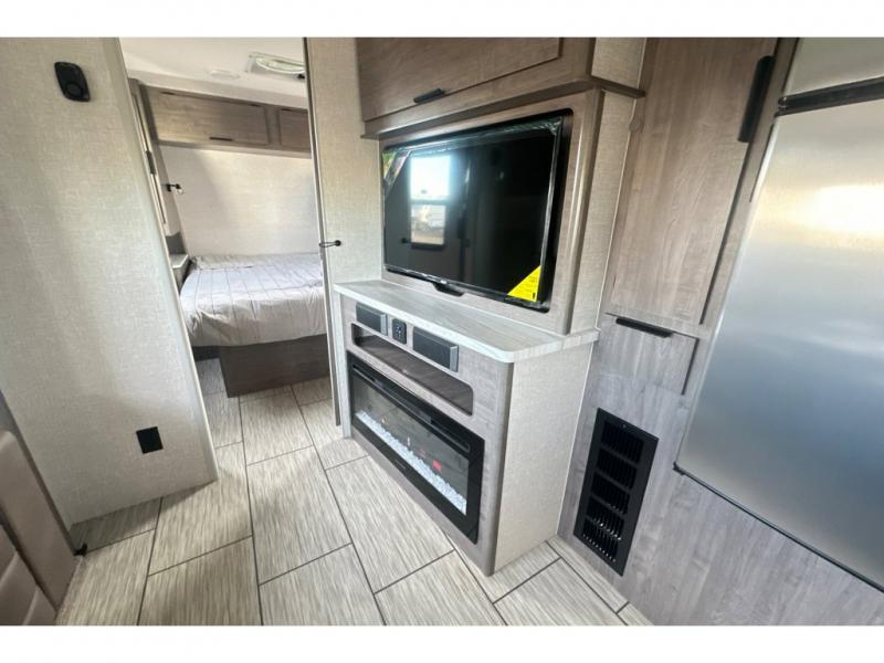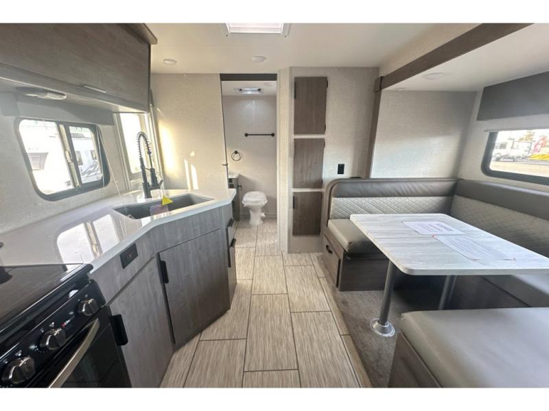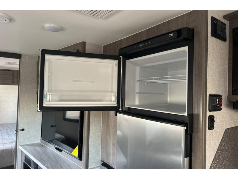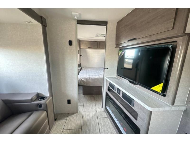 Escape to the campground in this travel trailer that can sleep four campers each night. You will love having your own space in the front private bedroom, and the dual wardrobes plus a closet will keep your belongings tidy. The combined kitchen and living area includes a large slide out for added space, and you'll enjoy a U-shaped dinette and theater seating here for relaxing, dining, and letting guests sleep over. A fully equipped kitchen lets you make meals each day, and the spacious full rear bath means you won't have to use the camp's facilities; how convenient!