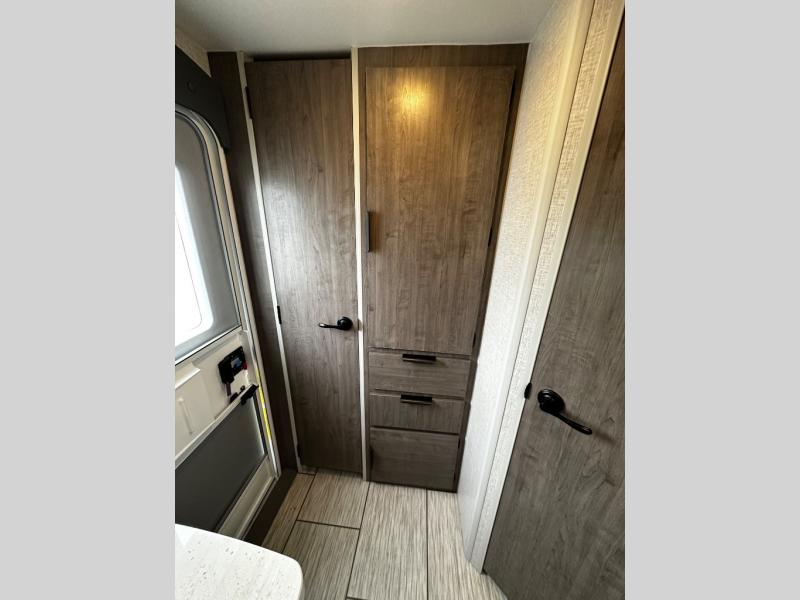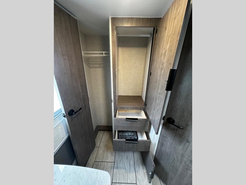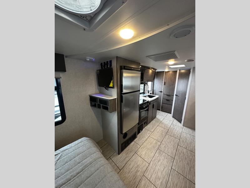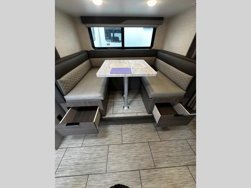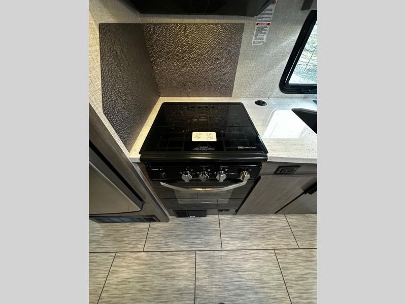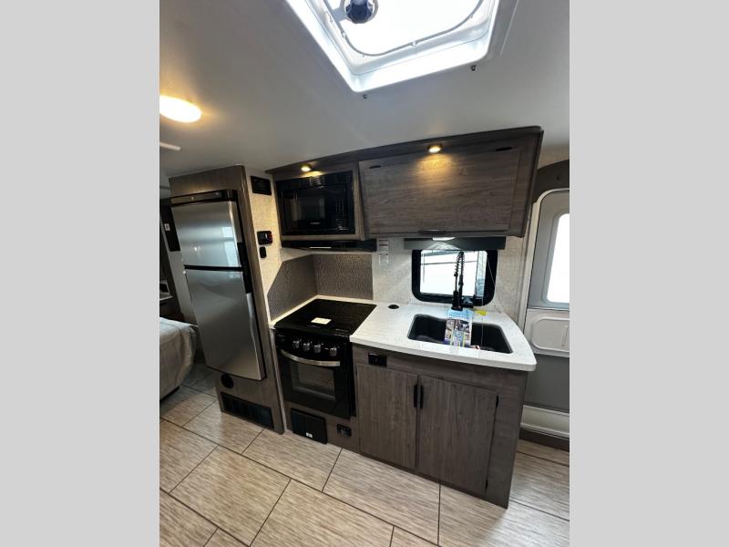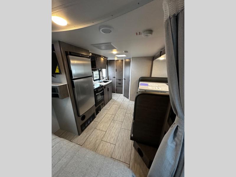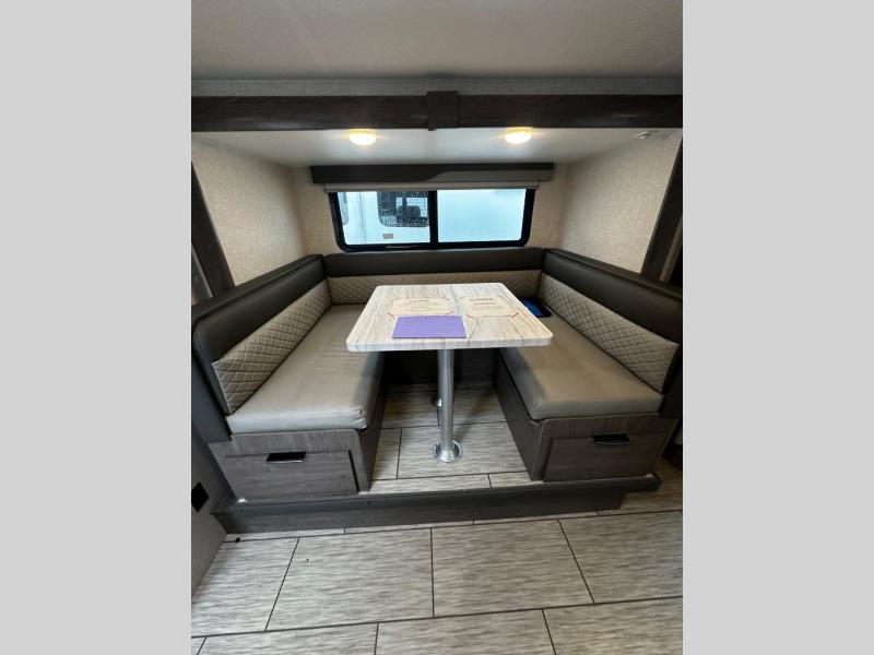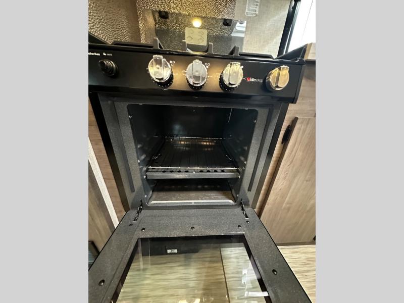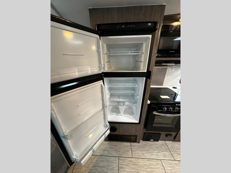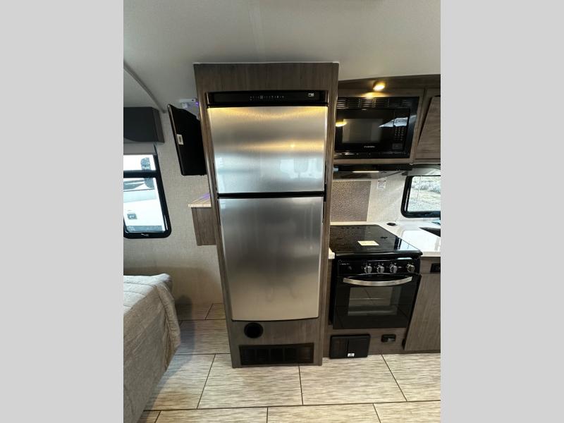 This travel trailer will be perfect for all your many camping excursions. You will enjoy having a walk-around queen bed up front with dual bedroom wardrobes on either side of the bed plus LED reading lights so you can stay up late with your book. A U-shaped dinette slide provides a place to dine and play games, and this can also double as sleeping space for guests. Having a full bath onboard means you won't have to use the camp's facilities at night, and the dual pane bath skylight will provide more natural light and extra headroom. When you've worked up an appetite, the galley includes a stainless steel three burner range with a black glass cover to cook meals and an 8 cu. ft. 12V refrigerator to keep leftovers fresh.