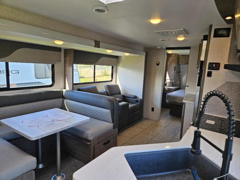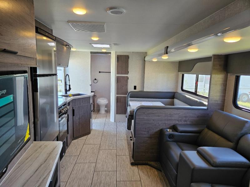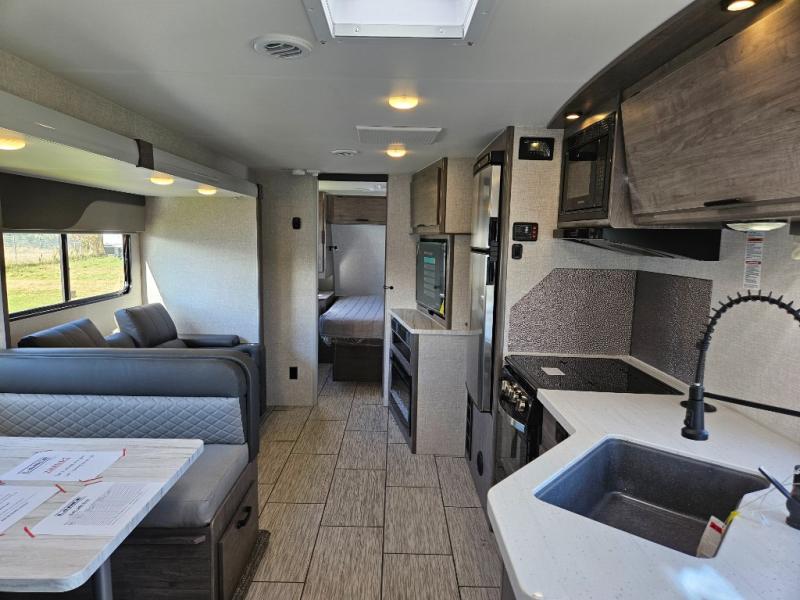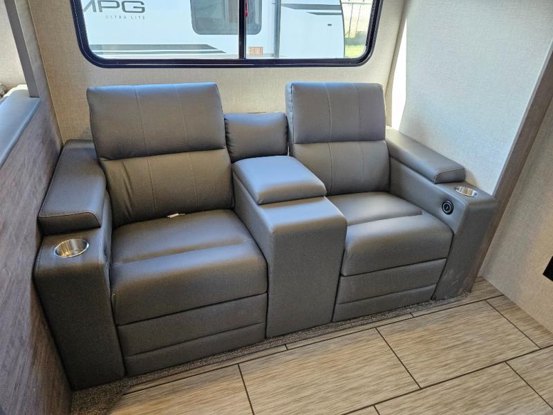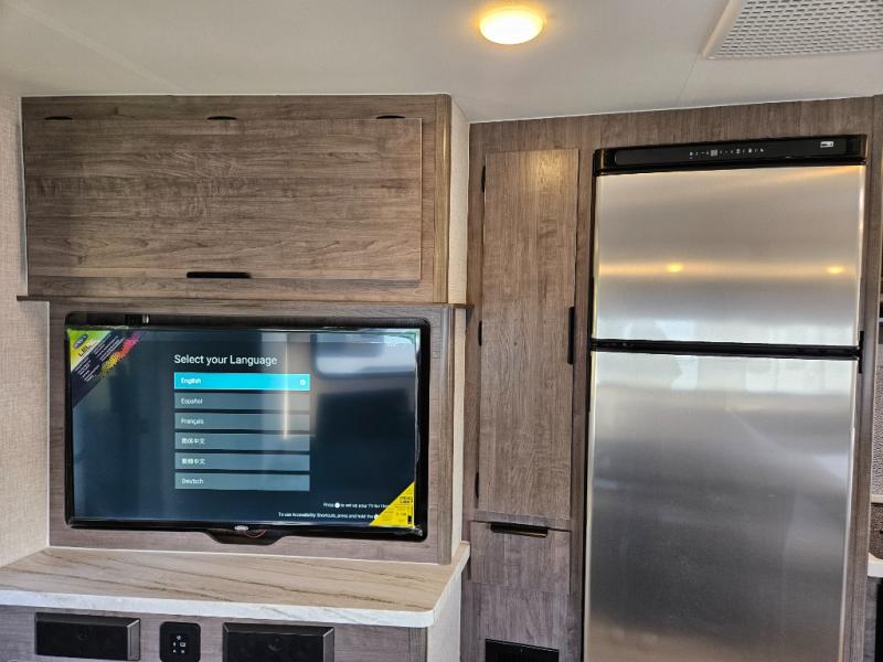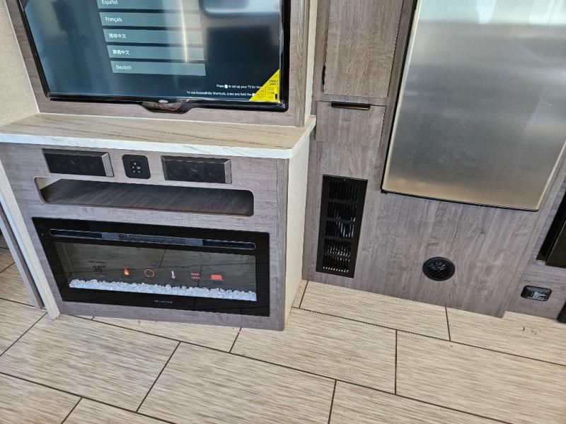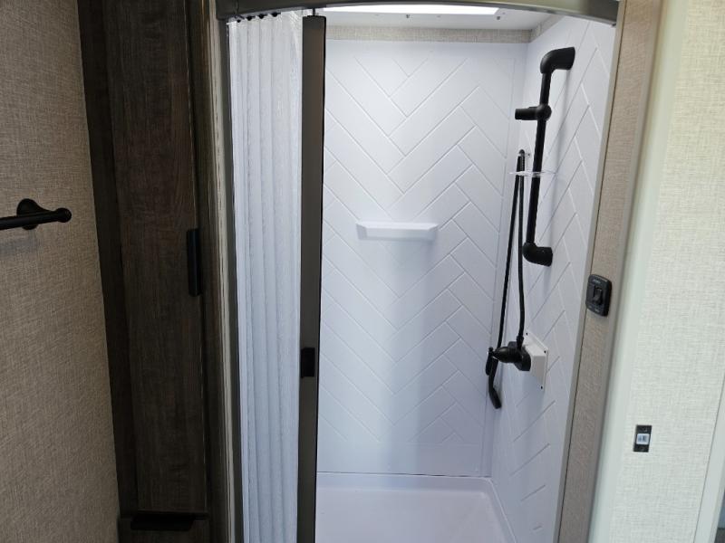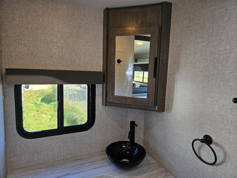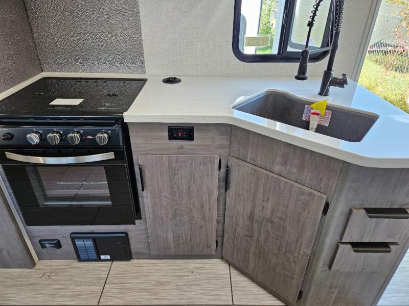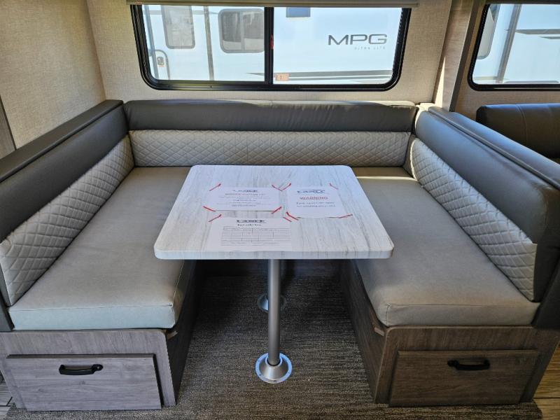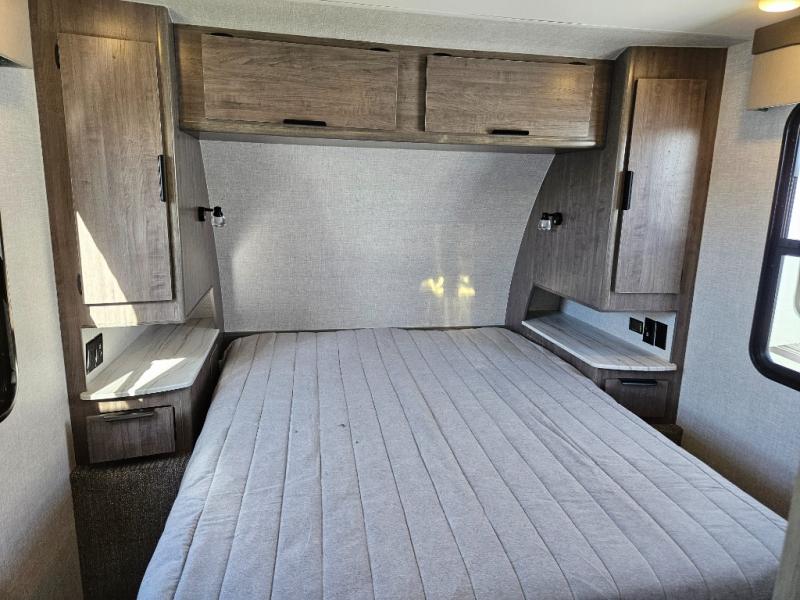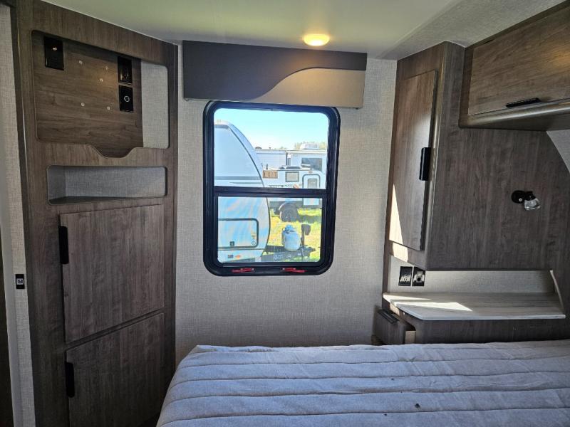 Escape to the campground in this travel trailer that can sleep four campers each night. You will love having your own space in the front private bedroom, and the dual wardrobes plus a closet will keep your belongings tidy. The combined kitchen and living area includes a large slide out for added space, and you'll enjoy a U-shaped dinette and theater seating here for relaxing, dining, and letting guests sleep over. A fully equipped kitchen lets you make meals each day, and the spacious full rear bath means you won't have to use the camp's facilities; how convenient!