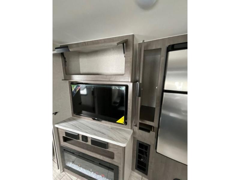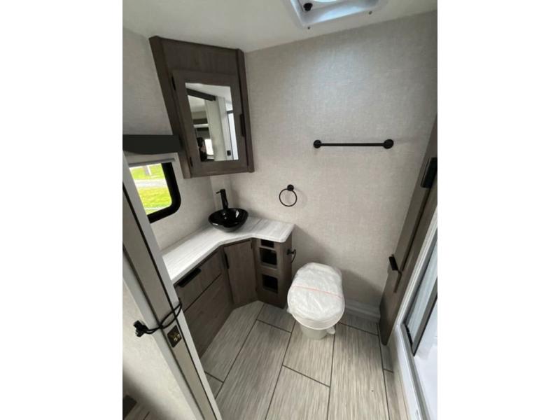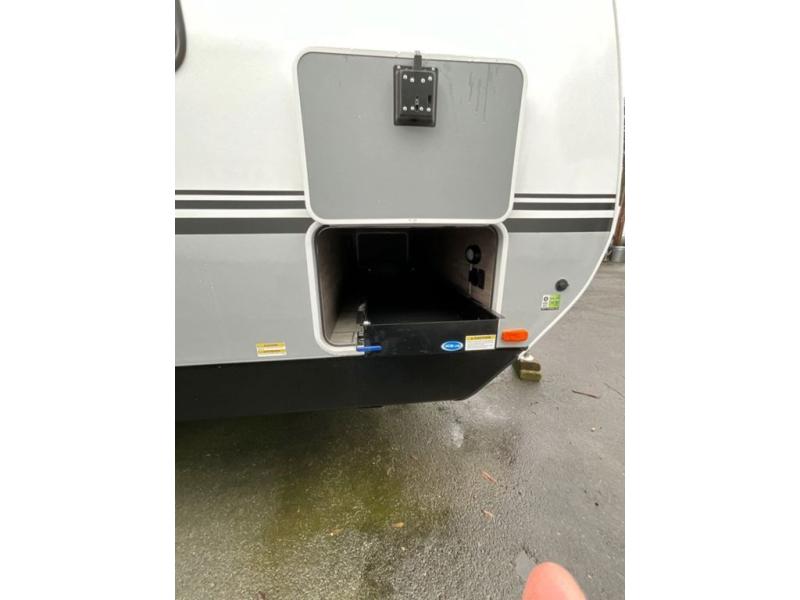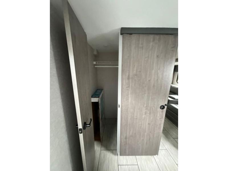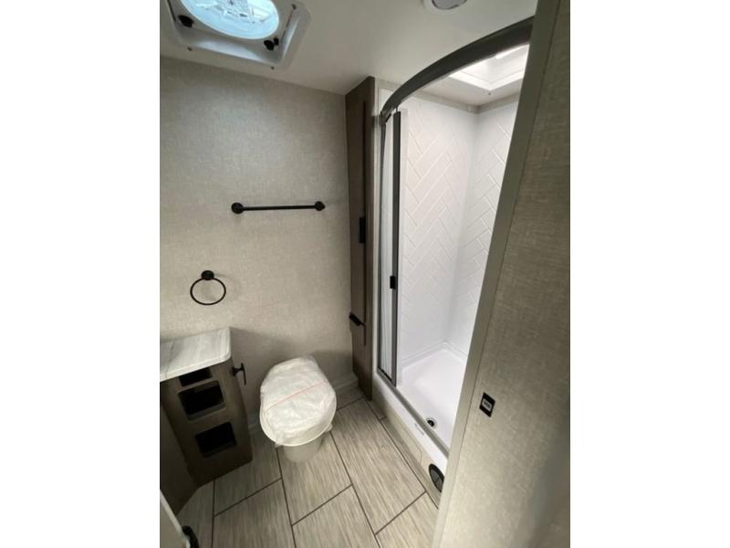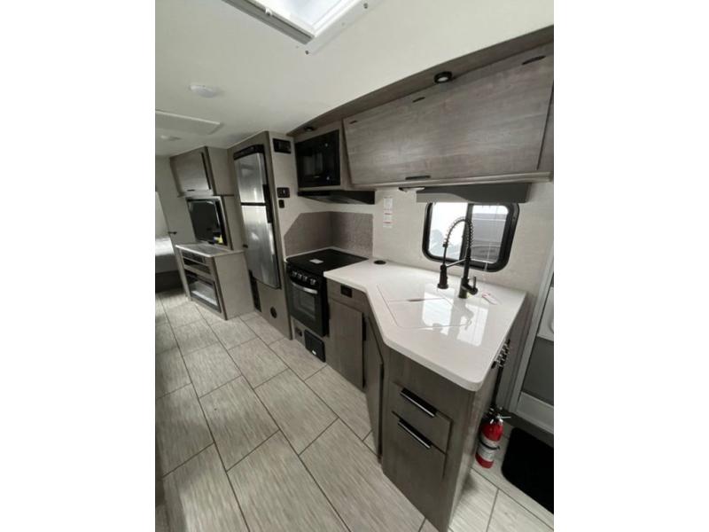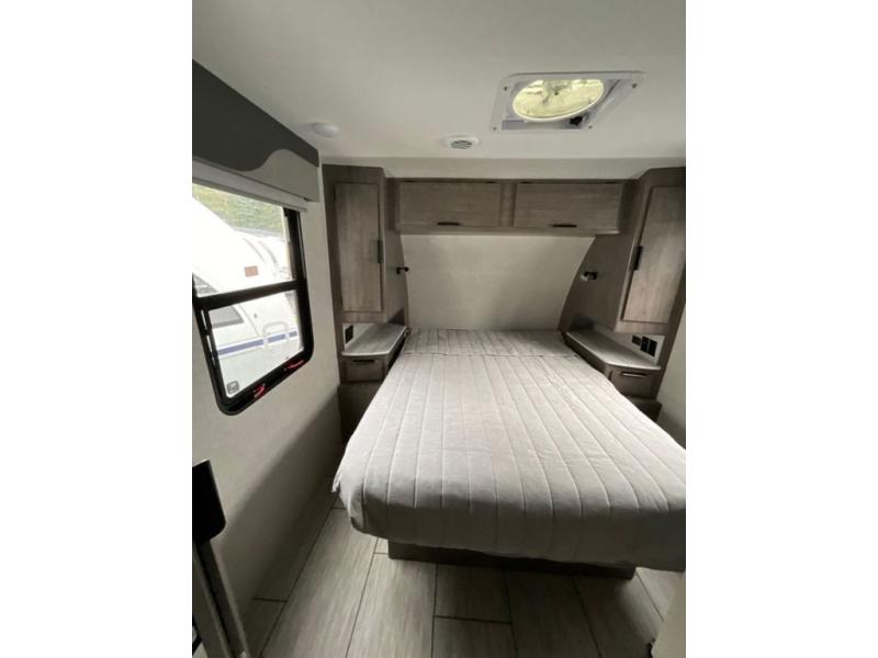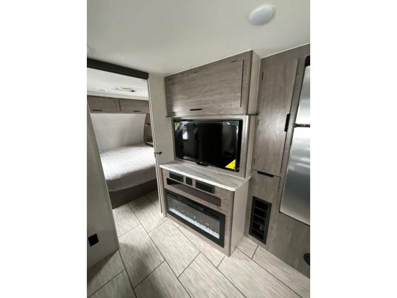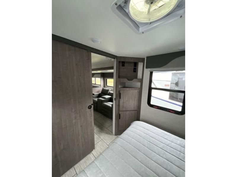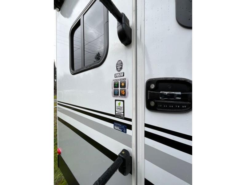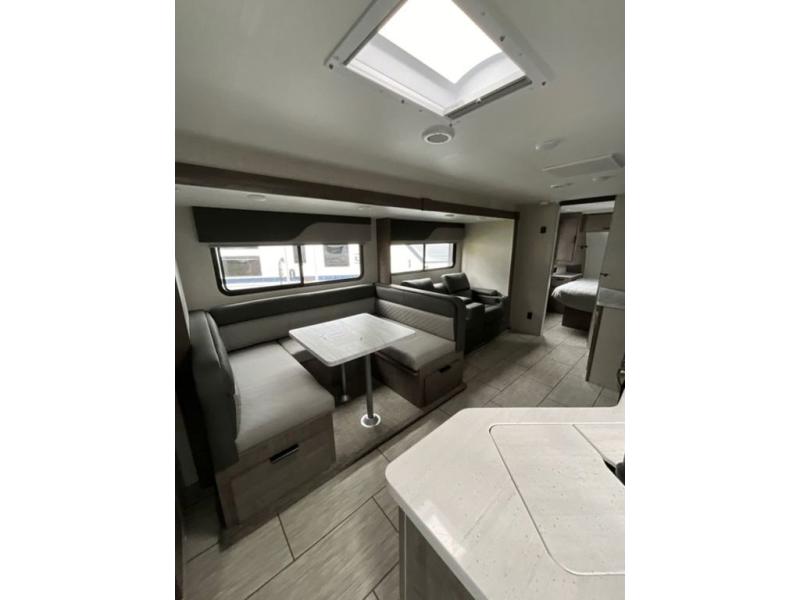 Escape to the campground in this travel trailer that can sleep four campers each night. You will love having your own space in the front private bedroom, and the dual wardrobes plus a closet will keep your belongings tidy. The combined kitchen and living area includes a large slide out for added space, and you'll enjoy a U-shaped dinette and theater seating here for relaxing, dining, and letting guests sleep over. A fully equipped kitchen lets you make meals each day, and the spacious full rear bath means you won't have to use the camp's facilities; how convenient!
