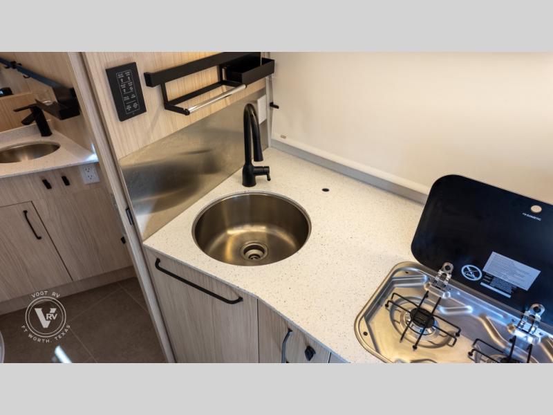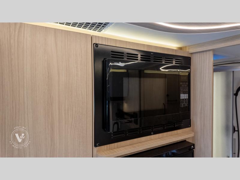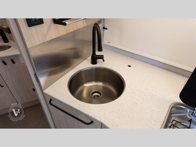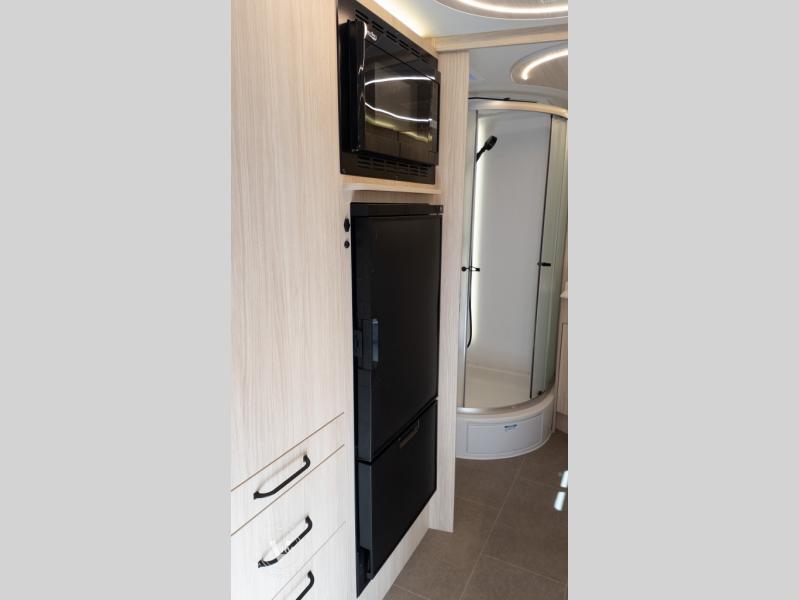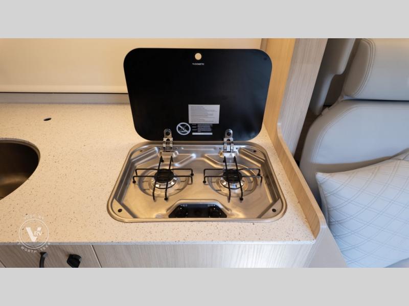 Traveling will be convenient and comfortable with this versatile Murphy bed/lounge slide unit at your fingertips. During the day once parked, you can easily seat four with the lounge chairs including a table between as well as having your driver and passenger seats swiveled around. This is a great place for hosting family or friends at your campsite or event. At night, the lounge seating is hidden as you flip-down the Murphy bed for a comfortable night's rest. In the morning, tuck it all away to bring back your living space. You will also enjoy the convenient kitchen amenities in place so you can easily whip up a meal or snack while you are stopped, and for overnight you can get refreshed for a new day in the rear bath featuring a radius shower with a skylight, a sink, and closet space for your things.