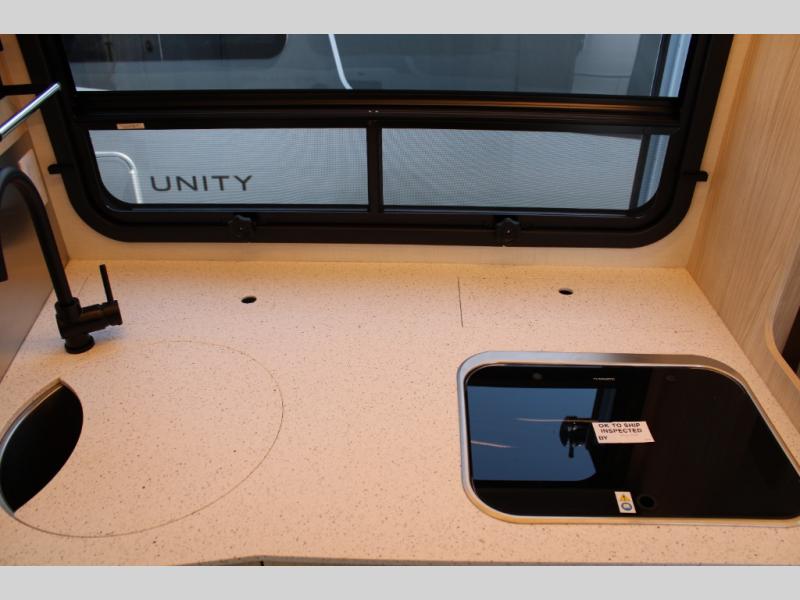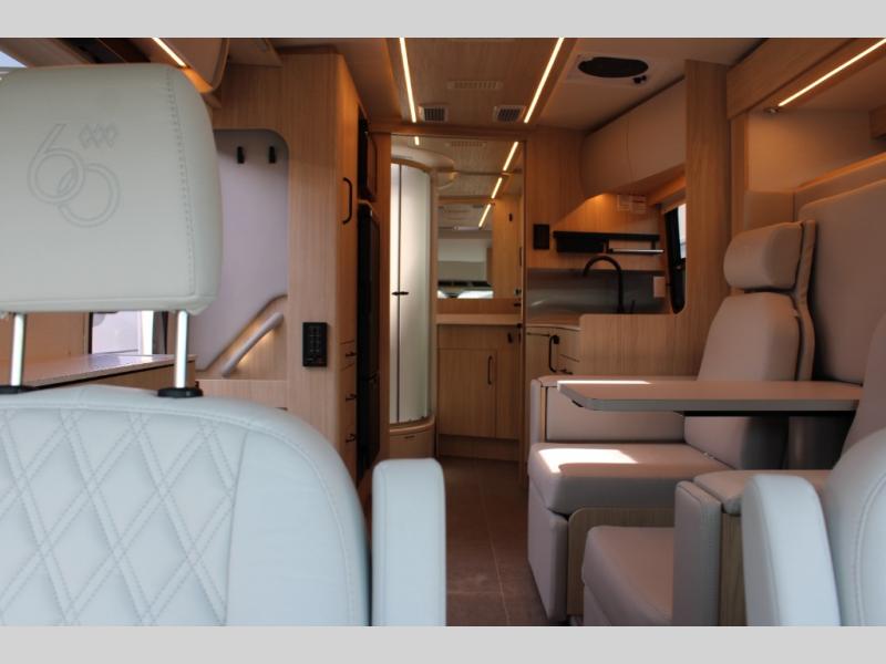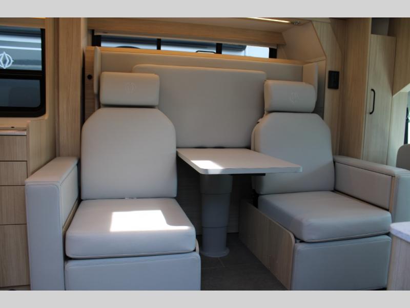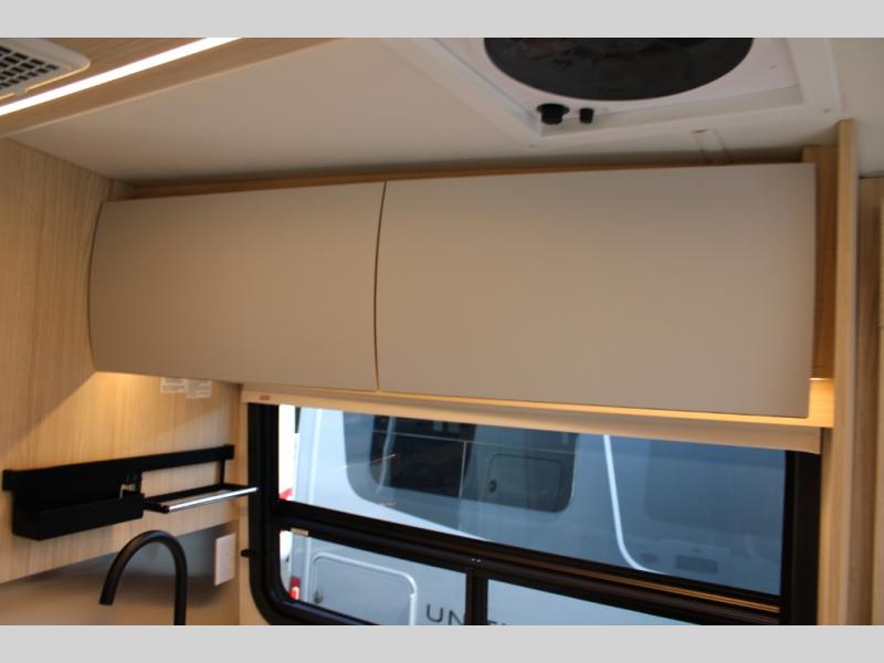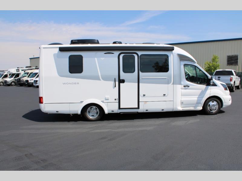 With any Leisure Travel Wonder Class B+ gas motorhome, the construction includes vacuum bonded aluminum framed insulated contoured sidewalls and a domed roof with fiberglass exterior, and a floor with composite exterior on a Ford Transit dual rear wheel chassis. Some highlights include the 16" heavy-duty forged aluminum alloy wheels, the auto high-beam headlamps, and the advance active safety features. The interior offers the SYNC 4 navigation system, curved soft close overhead cabinetry doors with hidden catches, full extension ball bearing soft close drawer tracks, LED aisle lighting and above cabinet hidden accent lights, and tile look vinyl flooring throughout for style and easy care. Optional AWD is available, along with the optional 60th Anniversary Edition decor and exterior color, solar panels for off-grid capability, a battery upgrade, and more!