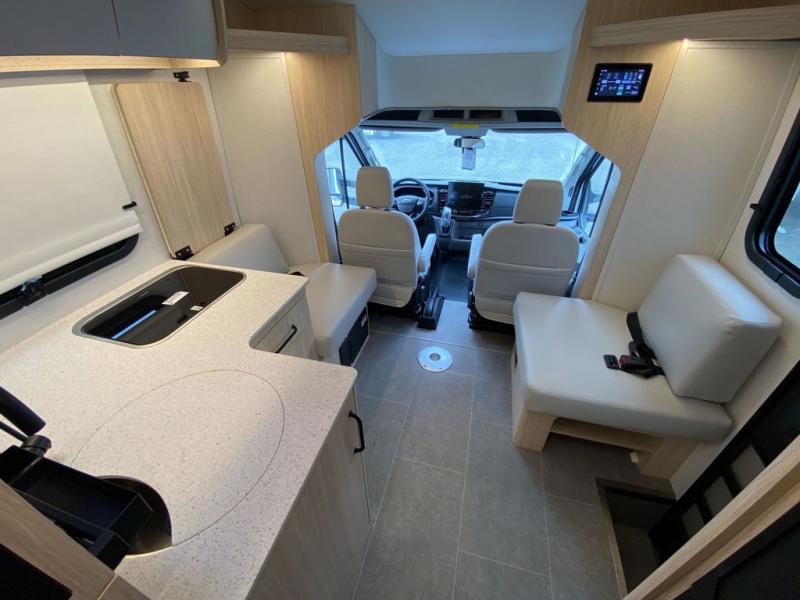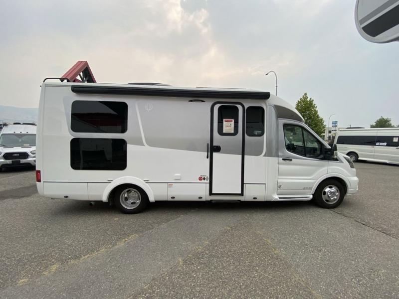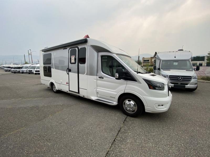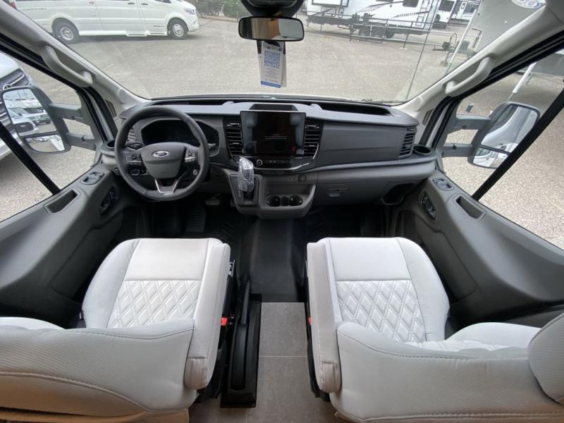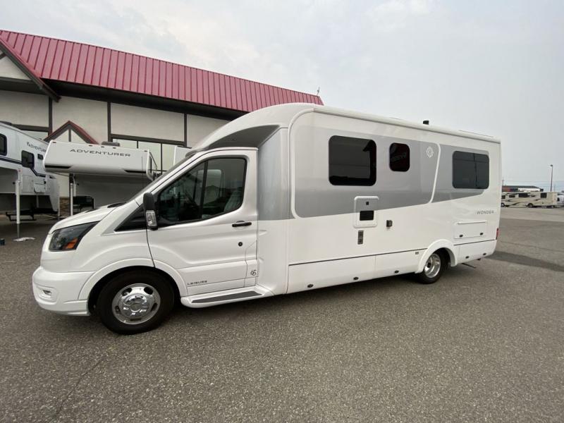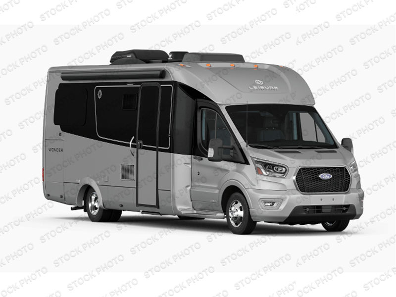 With any Leisure Travel Wonder Class B+ gas motorhome, the construction includes vacuum bonded aluminum framed insulated contoured sidewalls and a domed roof with fiberglass exterior, and a floor with composite exterior on a Ford Transit dual rear wheel chassis. Some highlights include the 16" heavy-duty forged aluminum alloy wheels, the auto high-beam headlamps, and the advance active safety features. The interior offers the SYNC 4 navigation system, curved soft close overhead cabinetry doors with hidden catches, full extension ball bearing soft close drawer tracks, LED aisle lighting and above cabinet hidden accent lights, and tile look vinyl flooring throughout for style and easy care. Optional AWD is available, along with the optional 60th Anniversary Edition decor and exterior color, solar panels for off-grid capability, a battery upgrade, and more!