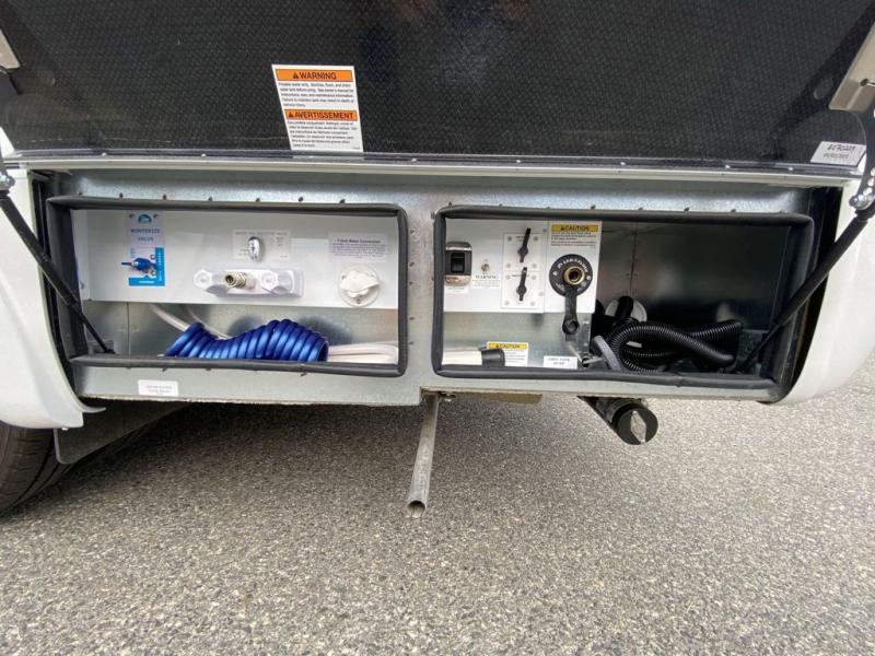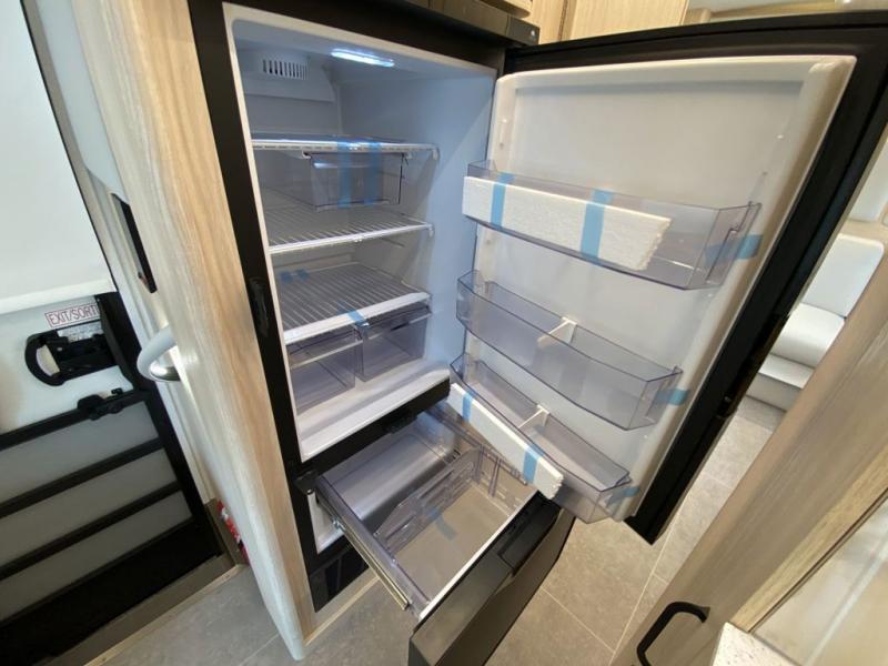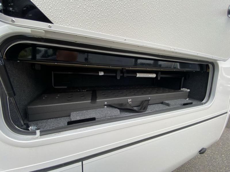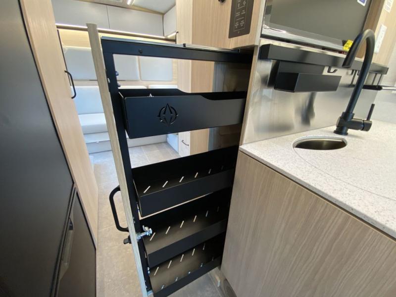 This coach combines comfort with versatility and convenience allowing you to travel wherever and whenever you want with your three favorite people! You will find seatbelts for four, a rear Murphy bed, and a removable front dinette area with an optional bed to sleep four. The rear offers a residential-style sectional lounge sofa with footrests and a swivel table to create a work station or another dining space. The galley offers a flip-down extension for more prep and serving space, a convection microwave oven, a flush mount LP cooktop with hinged glass cover, a garbage can, a pull-out pantry, and more to enjoy cooking while on the go.