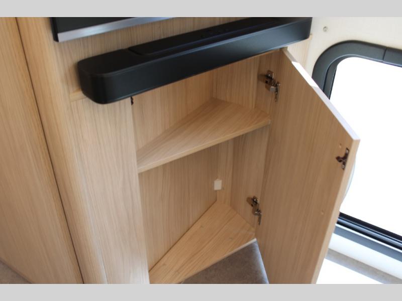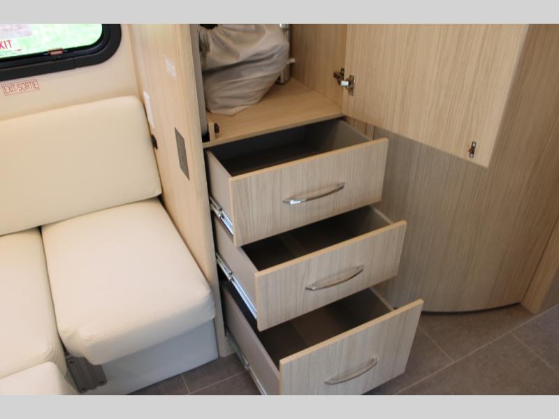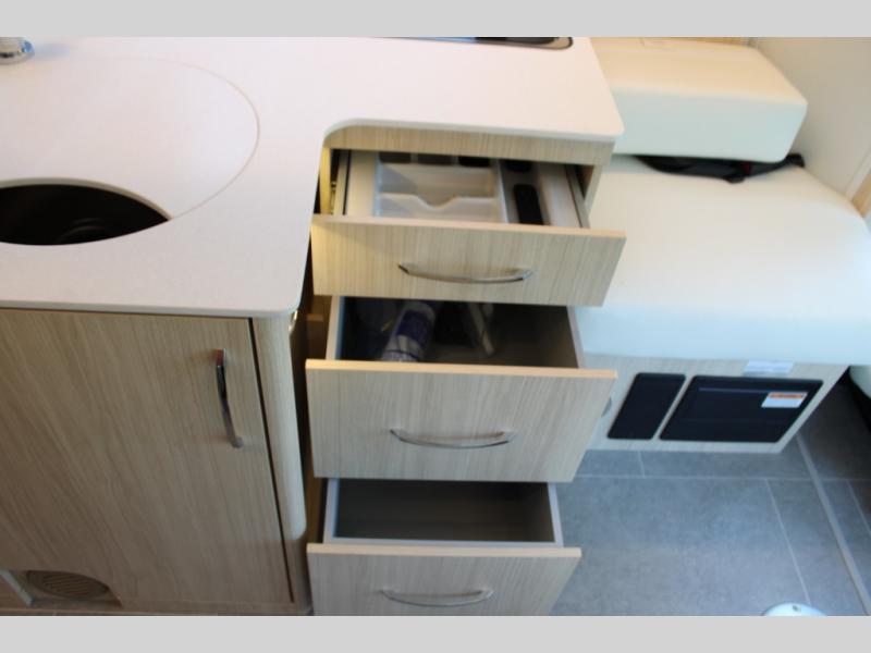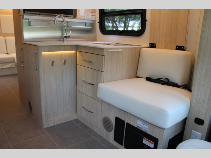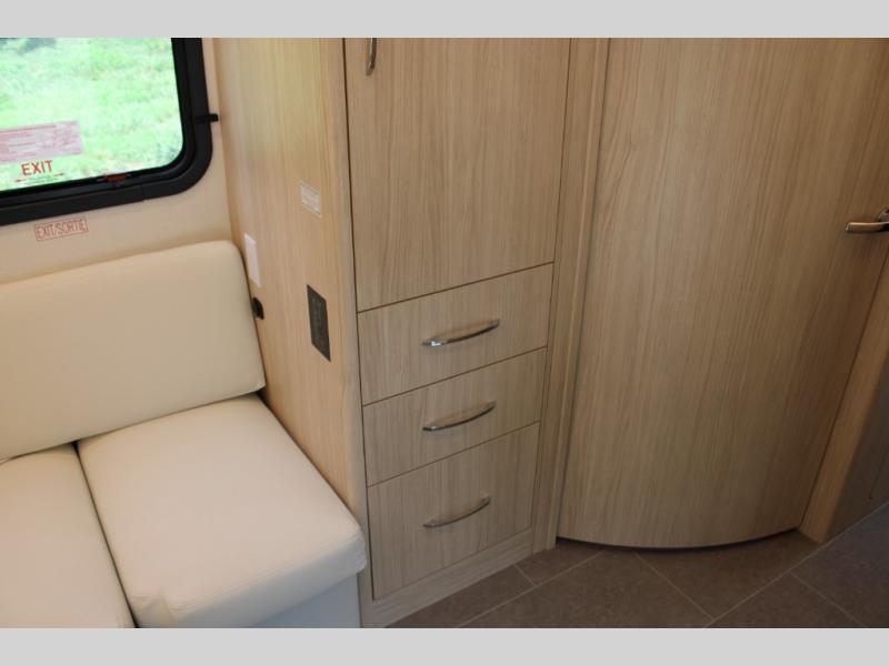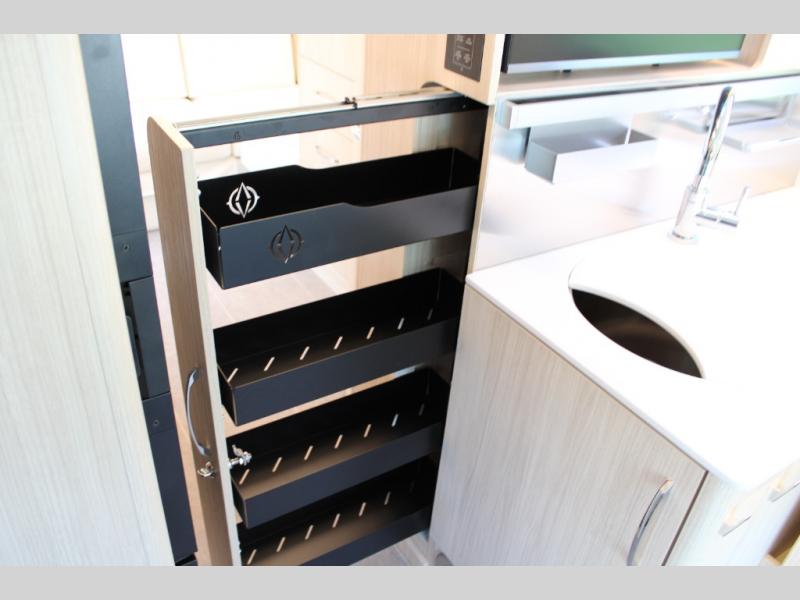 This coach combines comfort with versatility and convenience allowing you to travel wherever and whenever you want with your three favorite people! You will find seatbelts for four, a rear Murphy bed, and a removable front dinette area with an optional bed to sleep four. The rear offers a residential-style sectional lounge sofa with footrests and a swivel table to create a work station or another dining space. The galley offers a flip-down extension for more prep and serving space, a convection microwave oven, a flush mount LP cooktop with hinged glass cover, a garbage can, a pull-out pantry, and more to enjoy cooking while on the go.