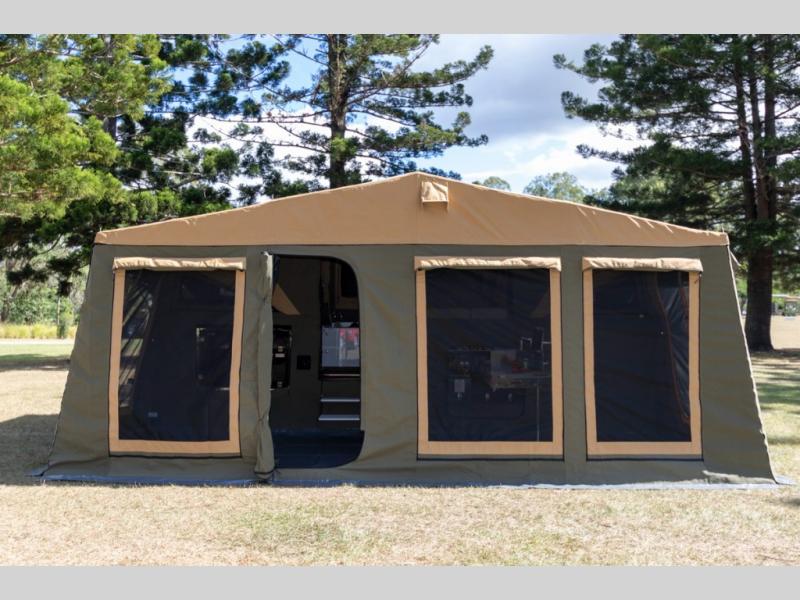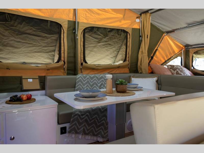 Off-grid comfort is possible in this pop-up camper for six! There are three storage slide trays to unload when you get to camp, then you can set up the integrated tent and fully enclosed annex. The exterior slide out kitchen includes a Thetford stainless steel three burner cooktop, a sink, and a refrigerator slide to keep your food fresh. This unit also includes a tent attached PVC ensuite tent and external hot/cold shower, providing you with a private space to freshen up each day. And the two tent end beds and U-shaped convertible lounge will let you sleep six campers total!