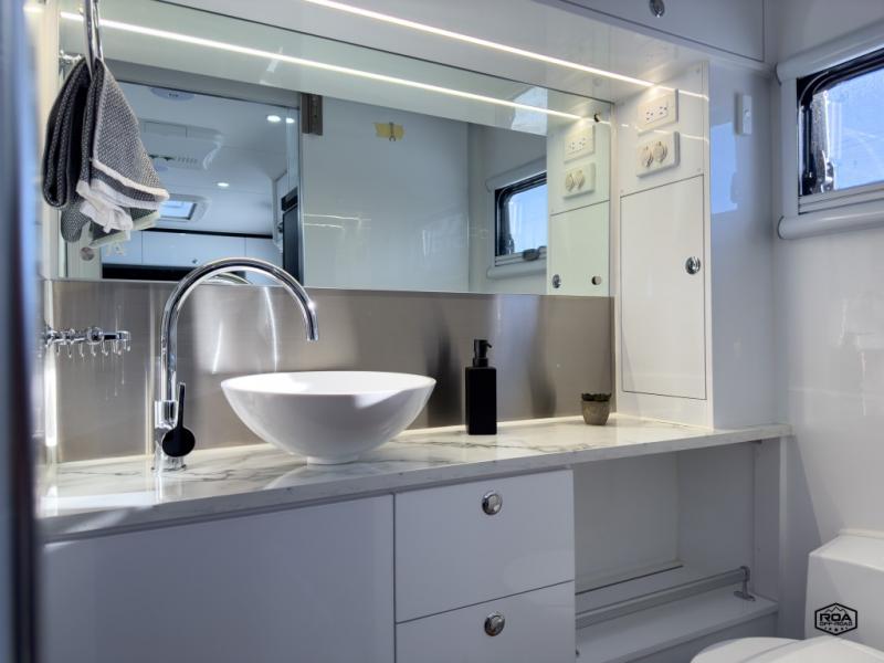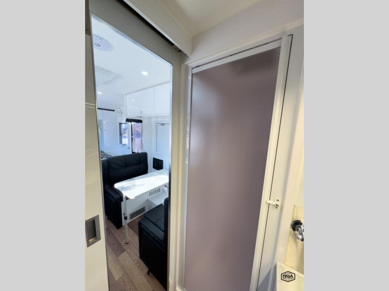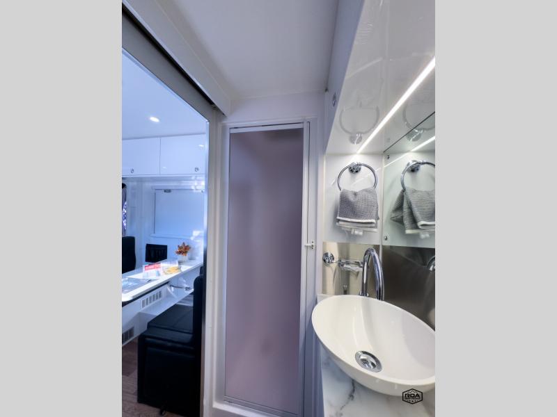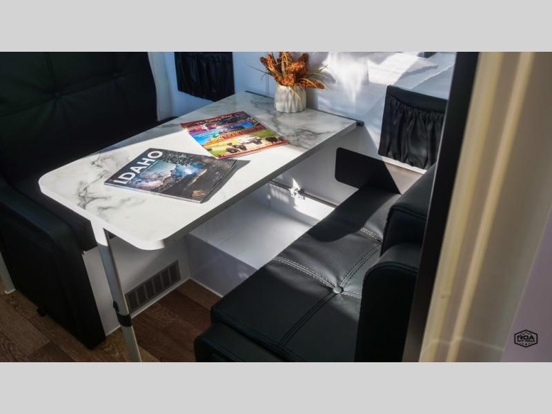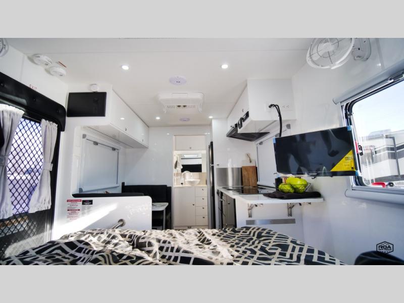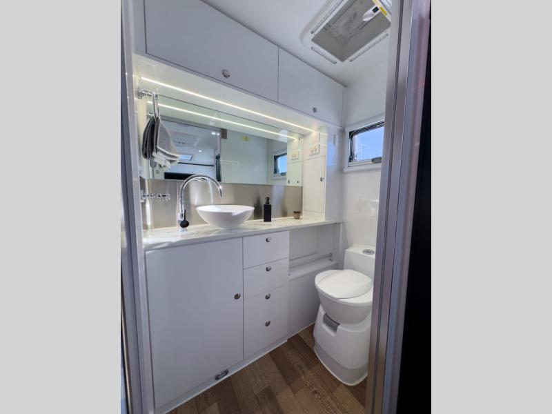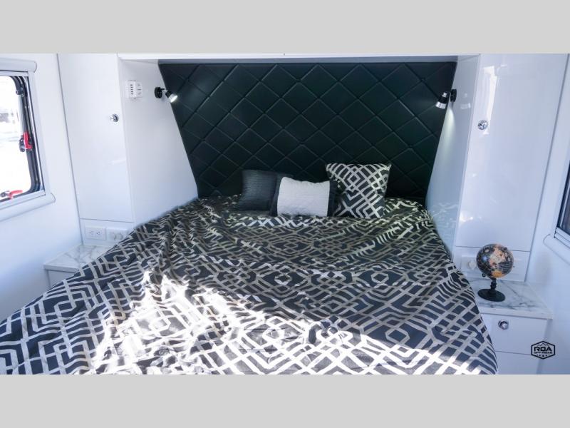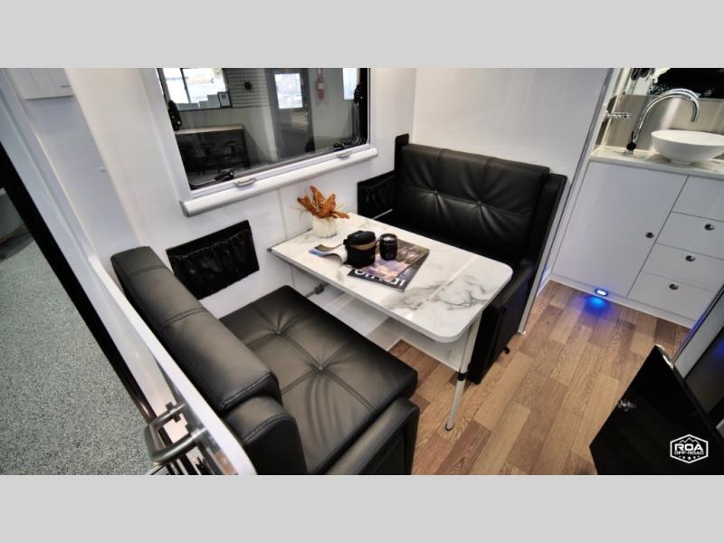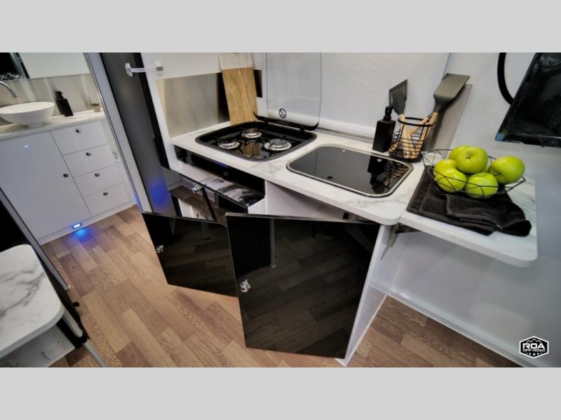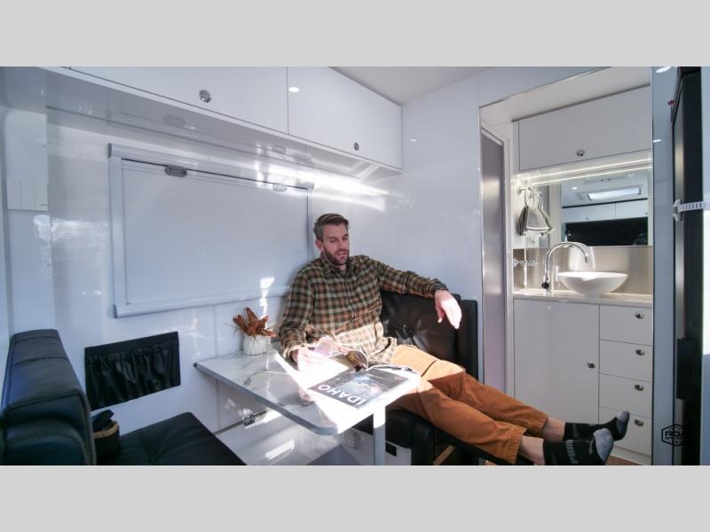 This off-road trailer will get you there and back even through your toughest terrain! Get a good night's rest on the island bed and convertible dinette, and keep your bellies filled with delicious home cooked meals prepared either indoors with the propane cooktop, internal refrigerator, and plumbed glass lid sink or at the external stainless steel slide out with propane cooktop and washboard sink with plumbed hot and cold water supply. With a hot and cold plumbed bath with Dometic CTS 4110 cassette toilet and hot and cold plumbed wash sink, you can clean the mud out of your hair after a fun day on the trails. The exterior comes with a Cold Weather pack that includes tank heating pads, HWS electric anti-freeze kit, LiFePRO+ integrated heating and insulated water lines.