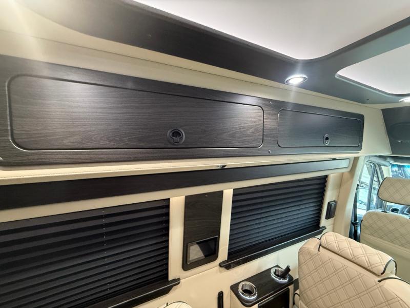 Inside, you’ll find large custom captain’s chairs, soft-touch fabrics, and handcrafted wood accents that elevate the travel experience. Premium audio, high-definition TVs, and a powerful 2000-watt inverter make long trips enjoyable and convenient for every passenger.