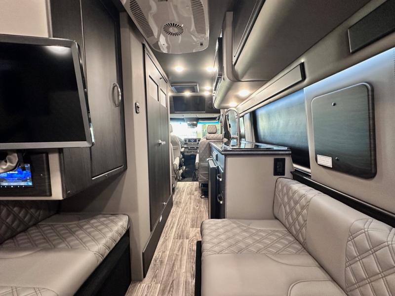 Each Passage Class B diesel motorhome begins with the safety and performance engineering of the Mercedes-Benz Sprinter and includes luxury and convenience throughout. The diesel/electronic water heater offers hot water on demand, the stainless steel microwave and recessed cooktop allow you to make meals whenever you like, and the refrigerator allows you to store cold items while traveling. The style and comfort of the custom seating, composite seamless flooring, and solid surface countertops will impress you every time you take to the road. You also have the convenience of technology with rooftop solar charging system, an HDMI input, and multiple 120V outlets!