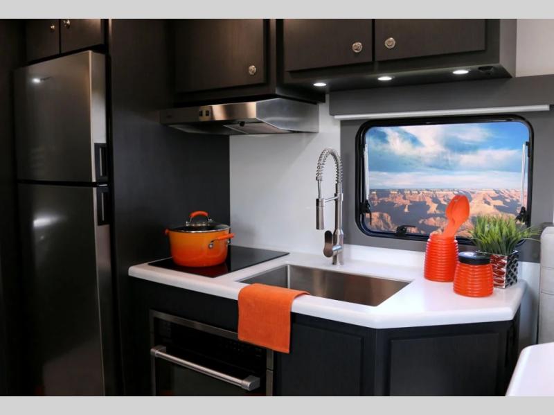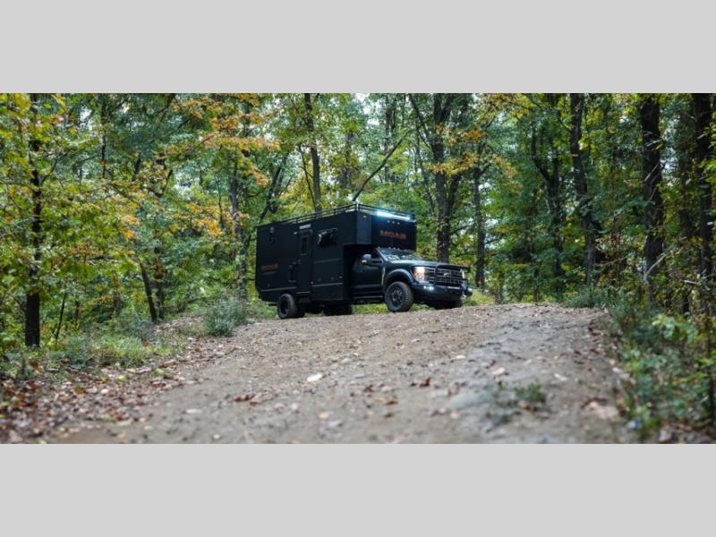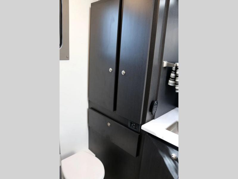 LED tail and brake lights, upper and lower, & marker lights; LED reverse lights; LED rear license plate light; fog lights; OEM driving lights; 3-LED 12” security lights; zoned interior lighting; independent on/off switches for overheads, bathroom, dinette, kitchen, and outside security lights; residential-style stainless-steel sink with large faucet; under-cabinet storage for trash can; solid surface countertops; removable-double burner induction cooktop; convection microwave/oven; refrigerator/freezer; exhaust hood; overhead and base cabinets; washer/dryer cabinet with pull-out storage drawer; countertop space with outlets for charging; wall-mounted Smart TV; ceiling skylight; residential-style, fully dry, enclosed bathroom with toilet; walk-in shower; vanity mirror; floor-to-ceiling storage cabinet beside toilet; lower cabinet storage with pass-through to rear exterior storage; removable shower wand on height-adjustable slide bar; sink with premium fixtures; premium toilet paper holder; shower with skylight for extra lighting and headroom; variable speed exhaust fan with rain cover; industry-leading off-grid electrical system: 48 Volt Energy System (2 times more efficient than leading competitors’ 24 Volt systems and 4 times more efficient than a 12 Volt system); 50 Amp Service; 6000 Watts of inverter power; available run time
