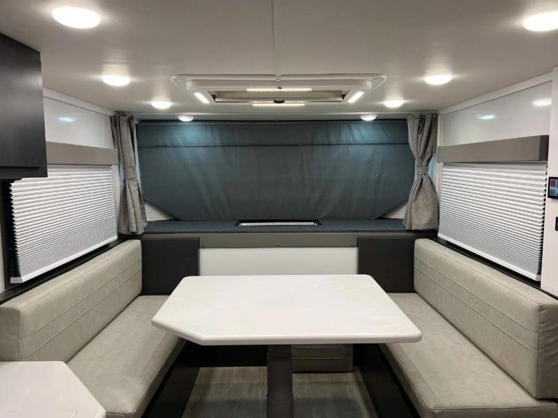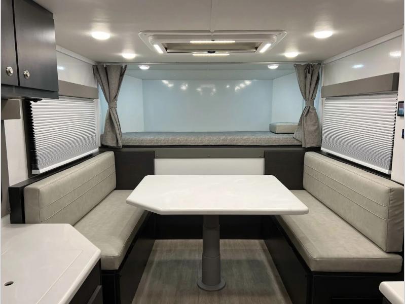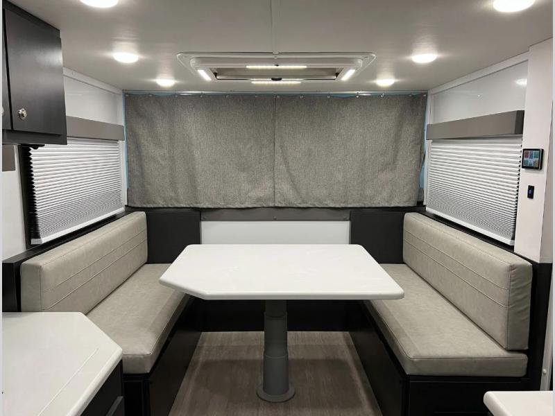 For cooling, heating, and ventilation, a nomadic cooling system with a 3000 48 Volt A/C, 12,480 BTU, comes standard with a 48 Volt brushless motor. Two thermostat-controlled toe kick heaters are also available. Dual pane windows allow for natural light. A roof hatch with a vent fan, screen, and escape hatch is included.