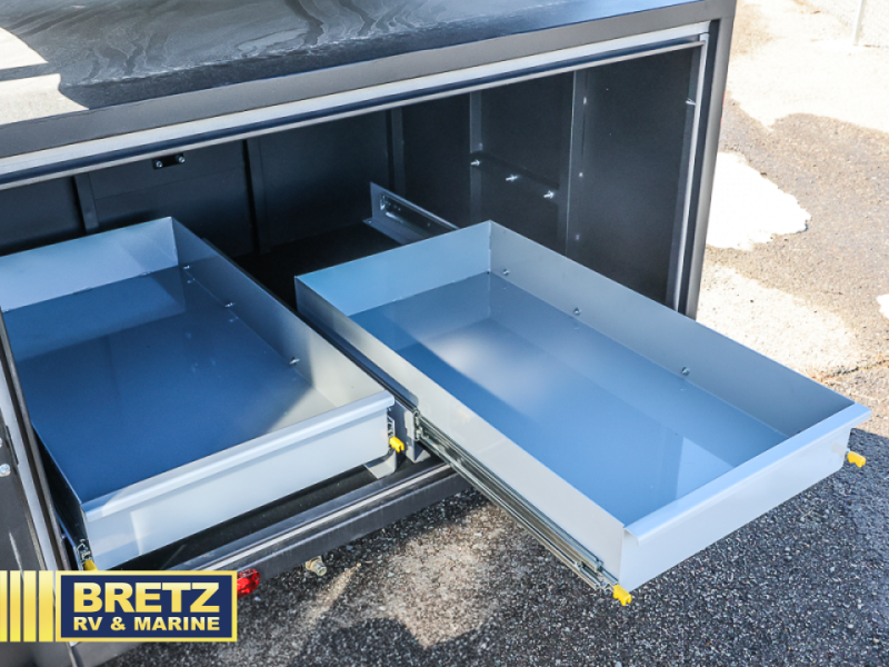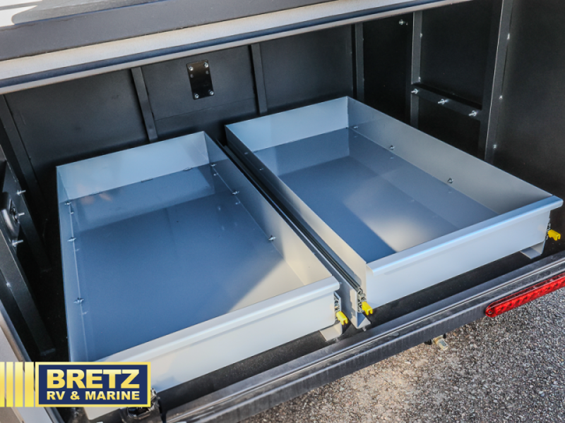 Features include Torsion Axel, Tent, Double Slide Drawer, Solar option with 12 Volt Cooler.