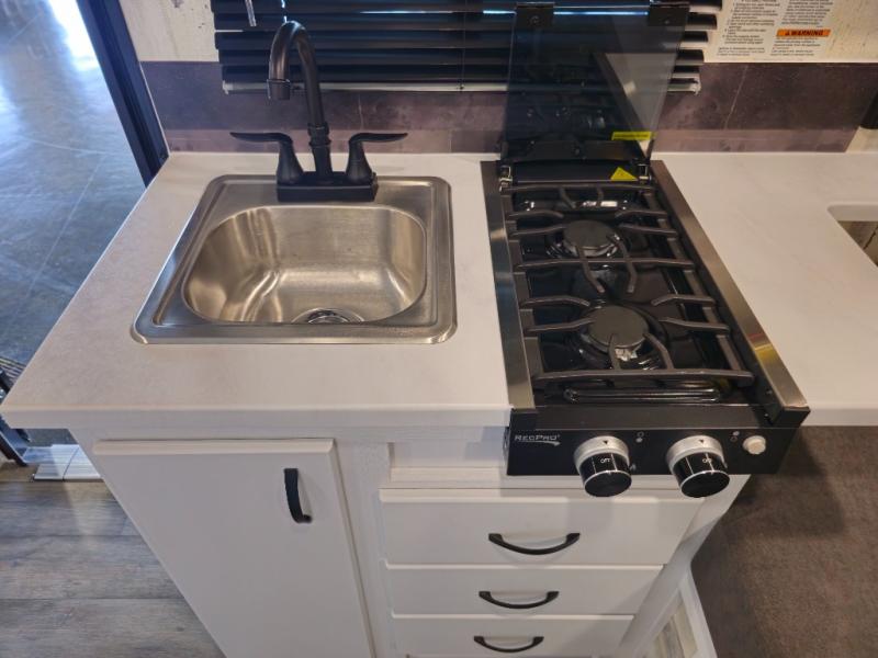 If you're looking for a teardrop trailer with a little more space, check out this Big Buggy BB14! There is a front U-shaped dinette that can convert to cozy sleeping space, a Recpro two burner stove, plus a large refrigerator. You can clean up each day in the wet bath that includes a two way bath vent fan plus a Dometic toilet. The exterior baggage door will keep all your gear secure, and the torsion axle will provide smooth towing from home to campground. There are also a variety of exterior graphics packages you can choose from that best fit your style!