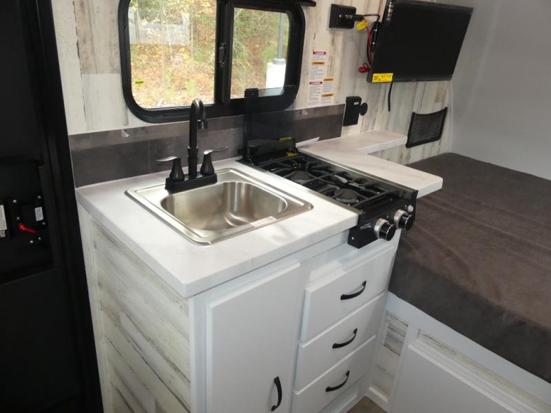 If you're looking for a teardrop trailer with a little more space, check out this Big Buggy BB14! There is a front U-shaped dinette that can convert to cozy sleeping space, a Recpro two burner stove, plus a large refrigerator. You can clean up each day in the wet bath that includes a two way bath vent fan plus a Dometic toilet. The exterior baggage door will keep all your gear secure, and the torsion axle will provide smooth towing from home to campground. There are also a variety of exterior graphics packages you can choose from that best fit your style!