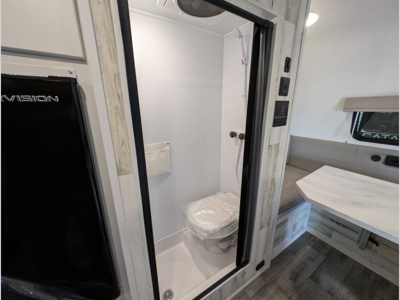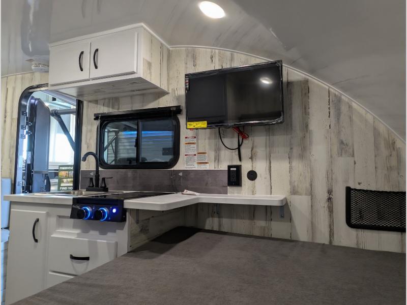 If you're looking for a teardrop trailer with a little more space, check out this Big Buggy BB14! There is a front U-shaped dinette that can convert to cozy sleeping space, a Recpro two burner stove, plus a large refrigerator. You can clean up each day in the wet bath that includes a two way bath vent fan plus a Dometic toilet. The exterior baggage door will keep all your gear secure, and the torsion axle will provide smooth towing from home to campground. There are also a variety of exterior graphics packages you can choose from that best fit your style!