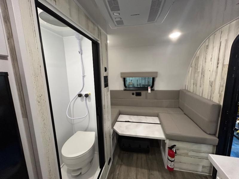If you're looking for a teardrop trailer with a little more space, check out this Big Buggy BB14! There is a front U-shaped dinette that can convert to cozy sleeping space, a two burner stove, plus a large 12V refrigerator. You can clean up each day in the wet bath that includes a two way bath vent fan plus a Dometic toilet. The exterior baggage door will keep all your gear secure, and the torsion axle will provide smooth towing from home to campground.