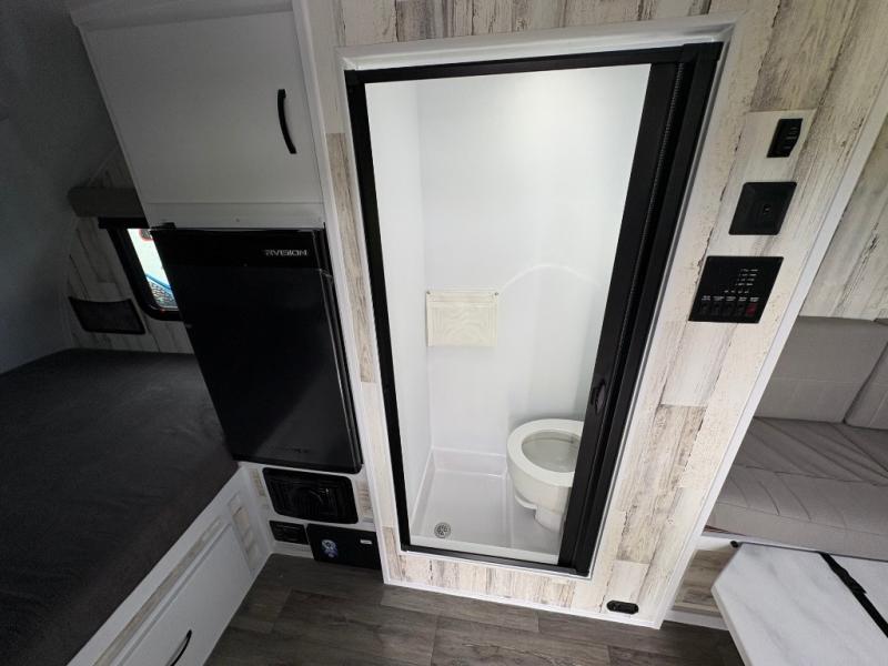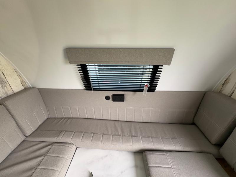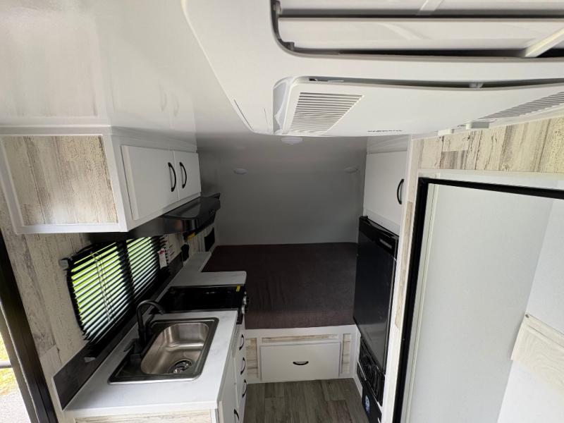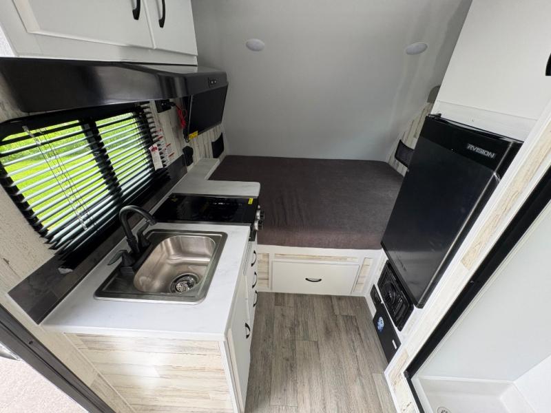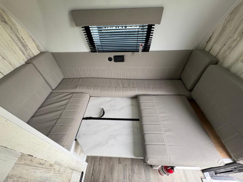 If you're looking for a teardrop trailer with a little more space, check out this Big Buggy BB14! There is a front U-shaped dinette that can convert to cozy sleeping space, a two burner stove, plus a large 12V refrigerator. You can clean up each day in the wet bath that includes a two way bath vent fan plus a Dometic toilet. The exterior baggage door will keep all your gear secure, and the torsion axle will provide smooth towing from home to campground.