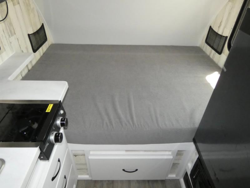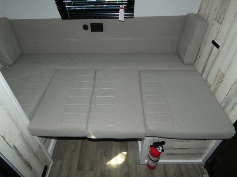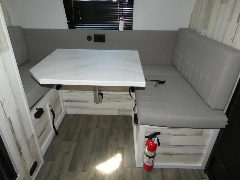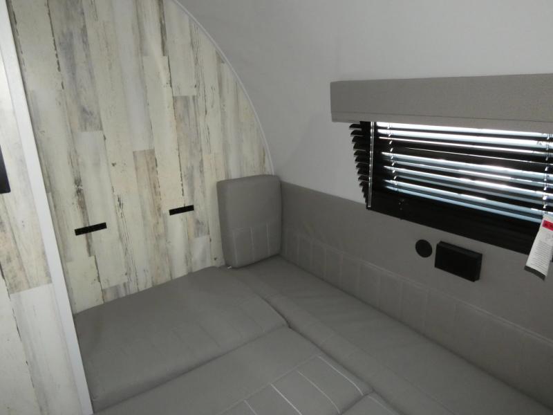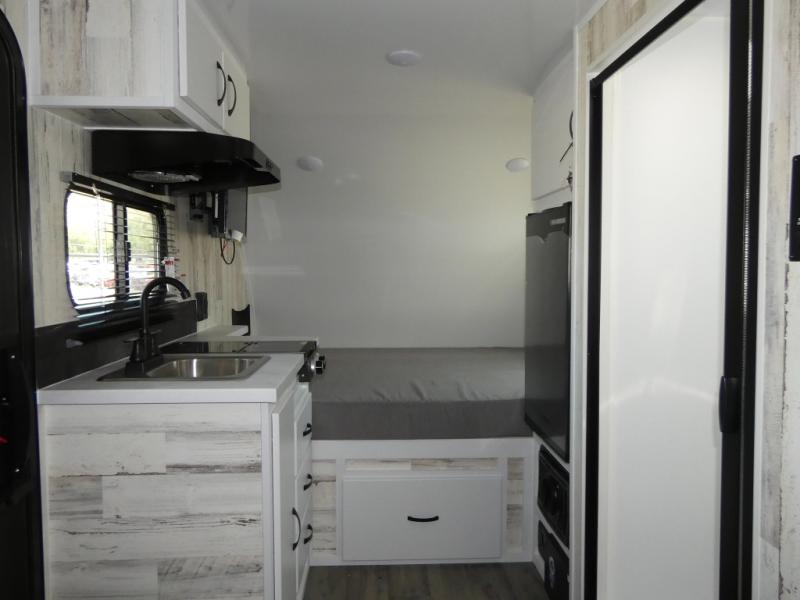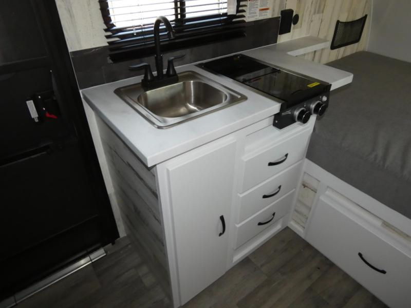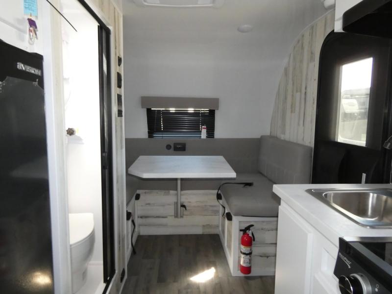 If you're looking for a teardrop trailer with a little more space, check out this Big Buggy BB14! There is a front U-shaped dinette that can convert to cozy sleeping space, a two burner stove, plus a large 12V refrigerator. You can clean up each day in the wet bath that includes a two way bath vent fan plus a Dometic toilet. The exterior baggage door will keep all your gear secure, and the torsion axle will provide smooth towing from home to campground.