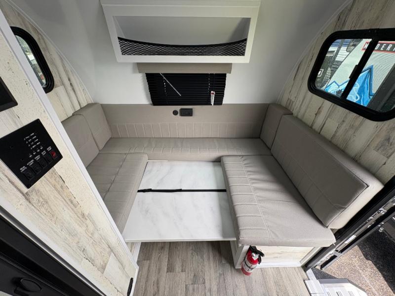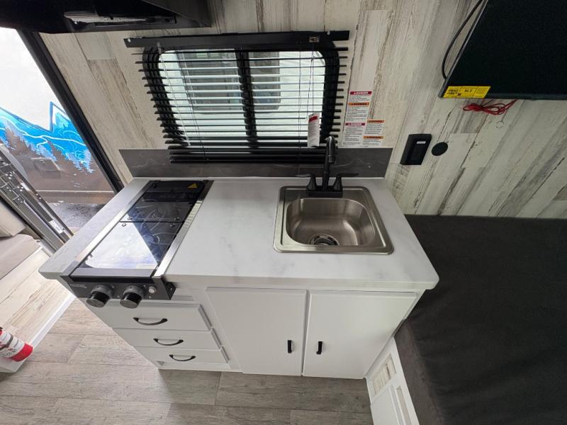 If you're looking for a teardrop trailer with a little more sleeping space, check out this Big Buggy BB16! There is a front U-shaped dinette that can convert to cozy sleeping space, along with a 78" x 36" upper bunk, a two burner stove, and a large refrigerator for food. You can clean up each day in the wet bath that includes a two way bath vent fan plus a Dometic toilet. The exterior baggage door and front exterior baggage door will keep all your gear secure, and the torsion axle will provide smooth towing from home to campground.