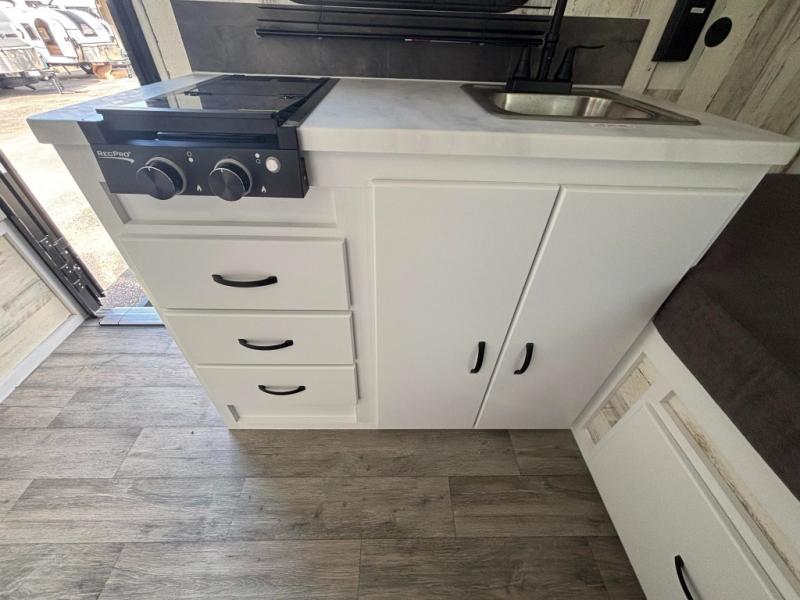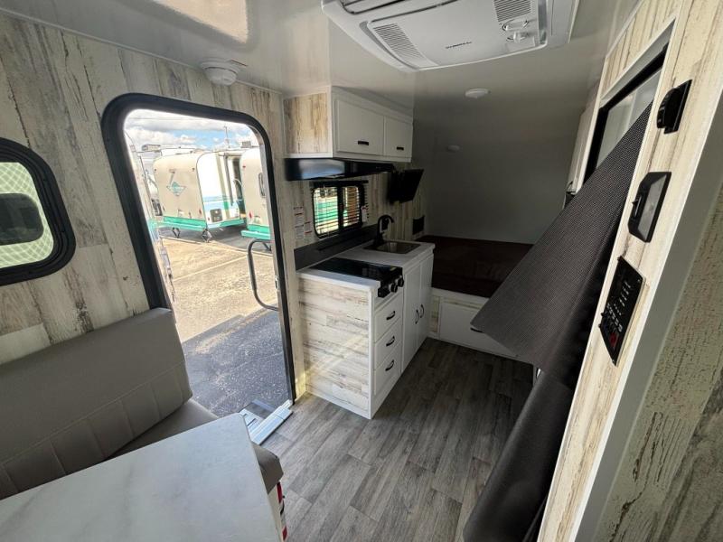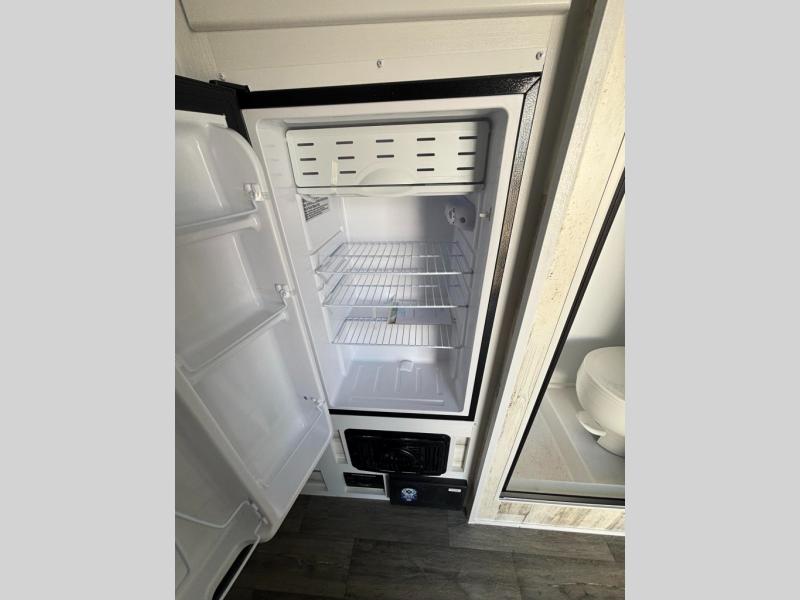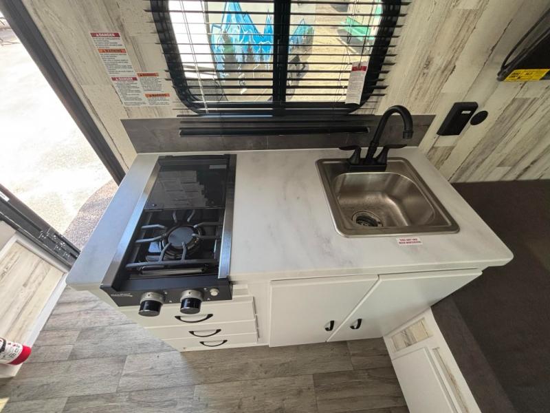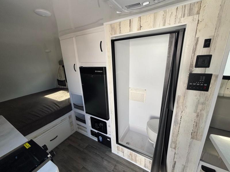 If you're looking for a teardrop trailer with a little more sleeping space, check out this Big Buggy BB16! There is a front U-shaped dinette that can convert to cozy sleeping space, along with a 78" x 36" upper bunk, a two burner stove, and a large refrigerator for food. You can clean up each day in the wet bath that includes a two way bath vent fan plus a Dometic toilet. The exterior baggage door and front exterior baggage door will keep all your gear secure, and the torsion axle will provide smooth towing from home to campground.