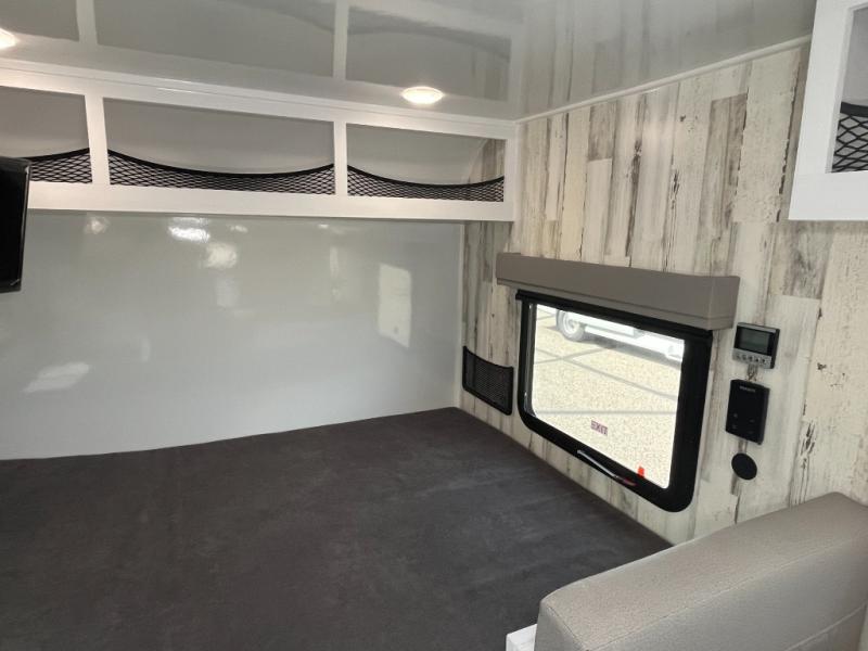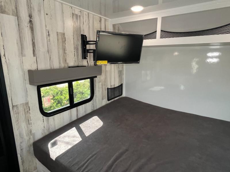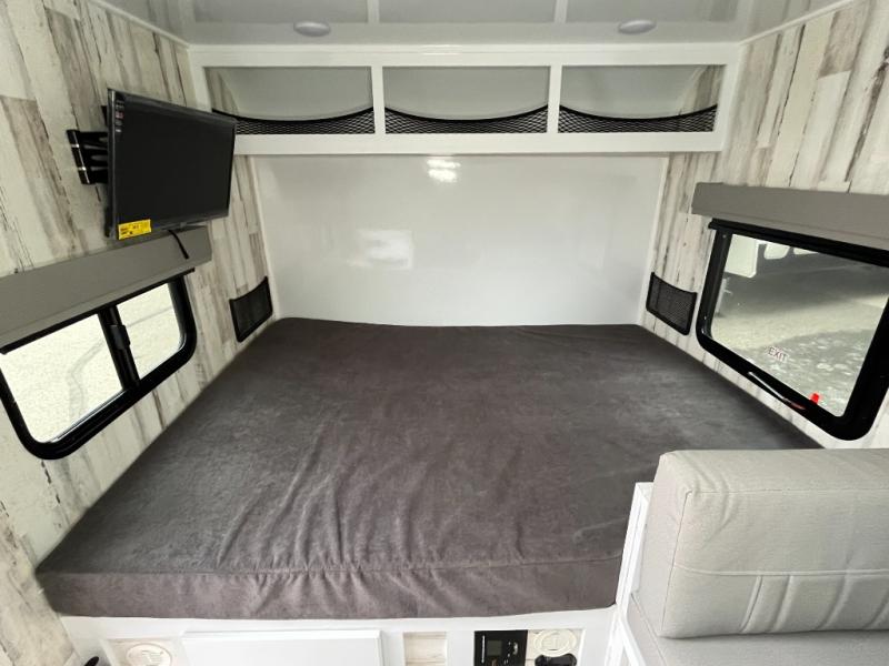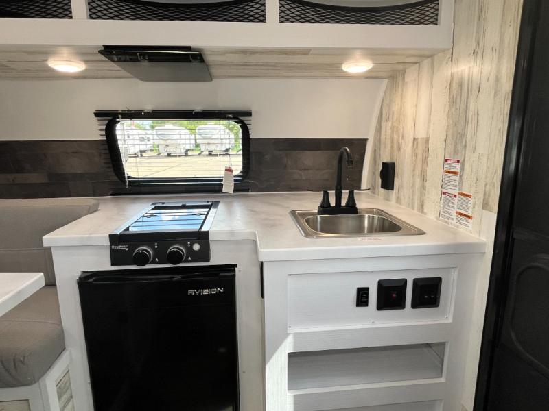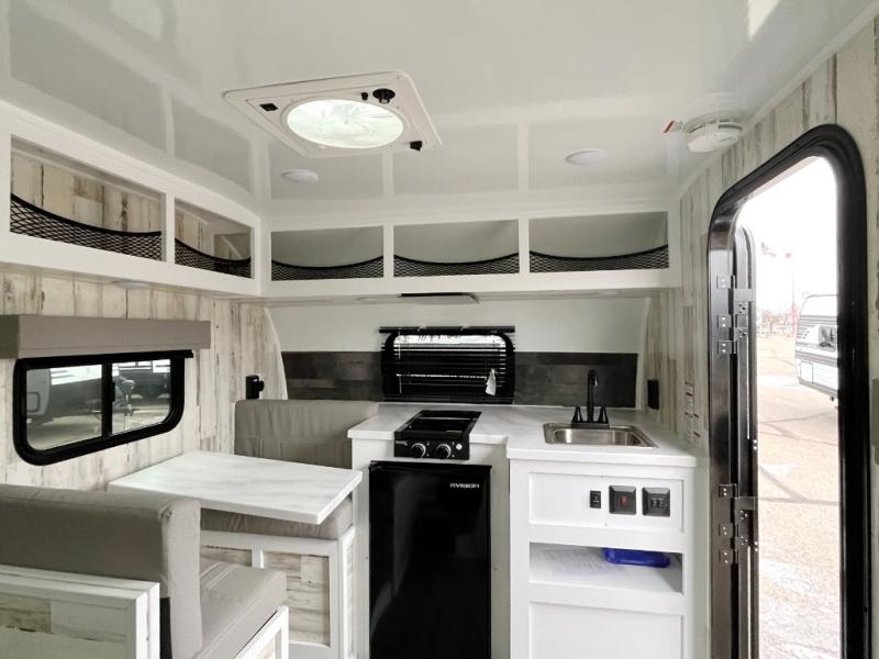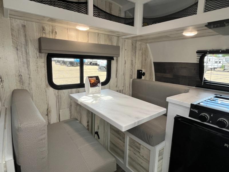 If you're looking for a lightweight trailer with a little more comfort, take a look at this one! There is a booth dinette that converts to a bed for a great night's rest, and the cassette toilet adds convenience so you don't' have to leave your trailer in the middle of the night. The kitchen includes a two burner stove, countertop and large refrigerator to keep food fresh. The front window with a black roller shade will provide great outdoor views, and the storage organizer will keep your valuables tucked away. There is also an exterior baggage door for your camp gear!