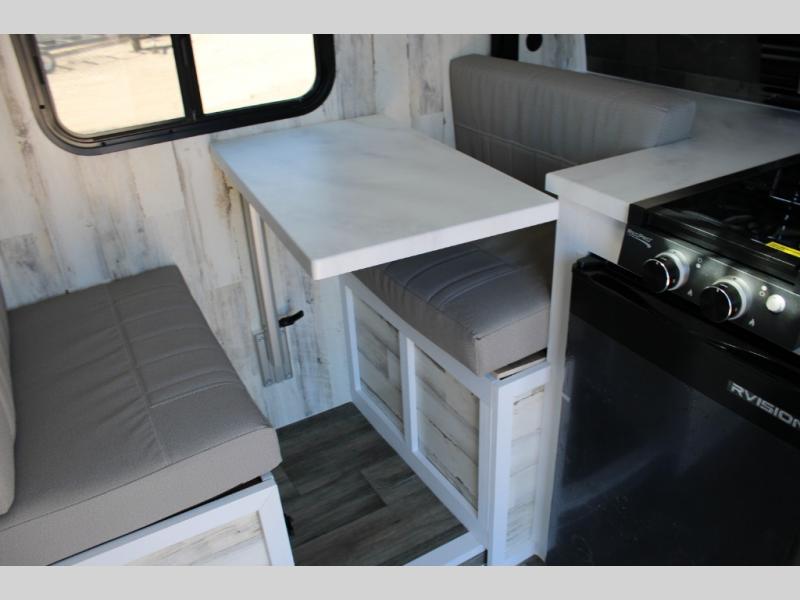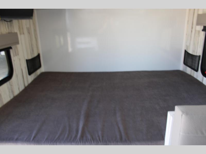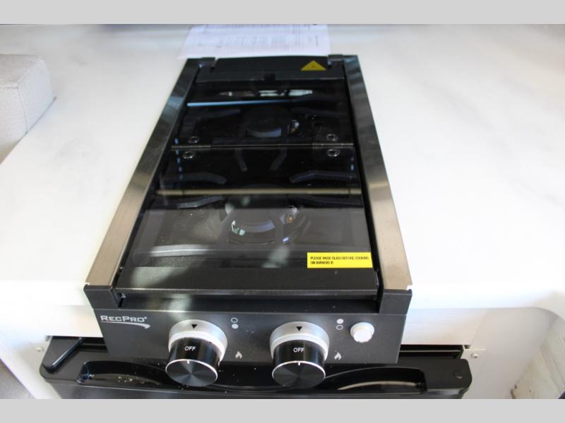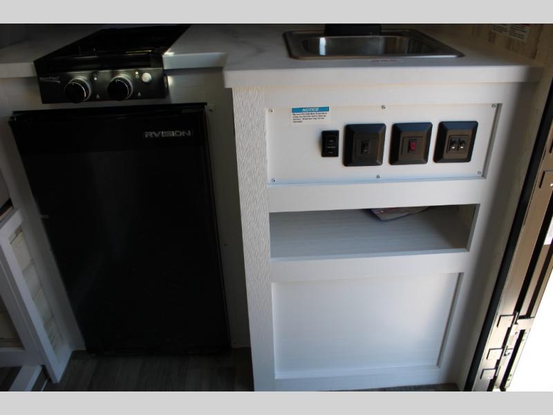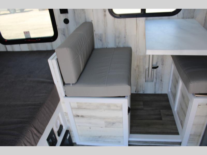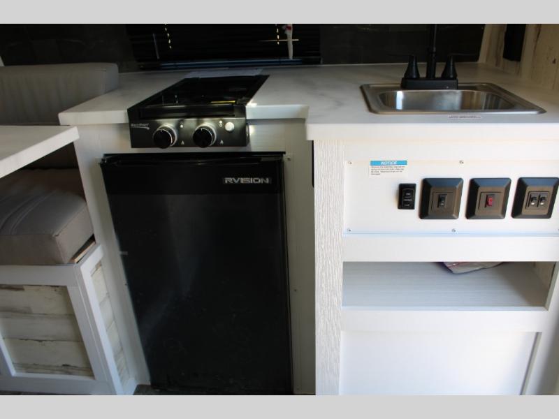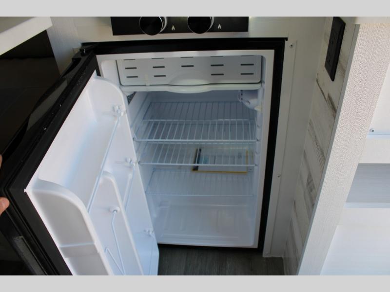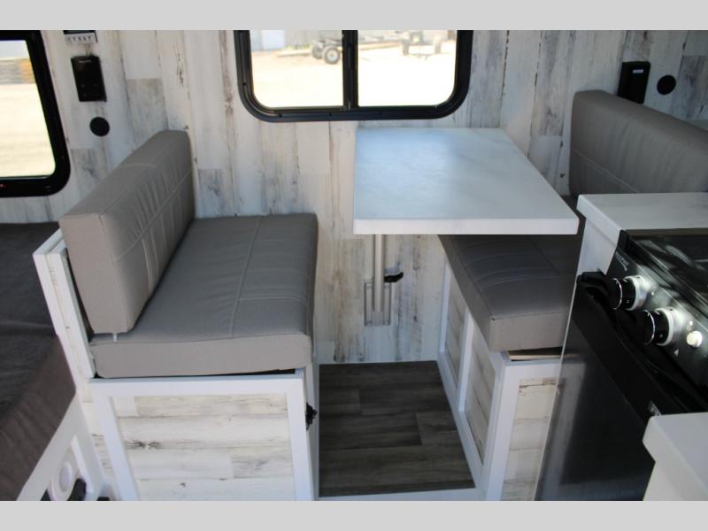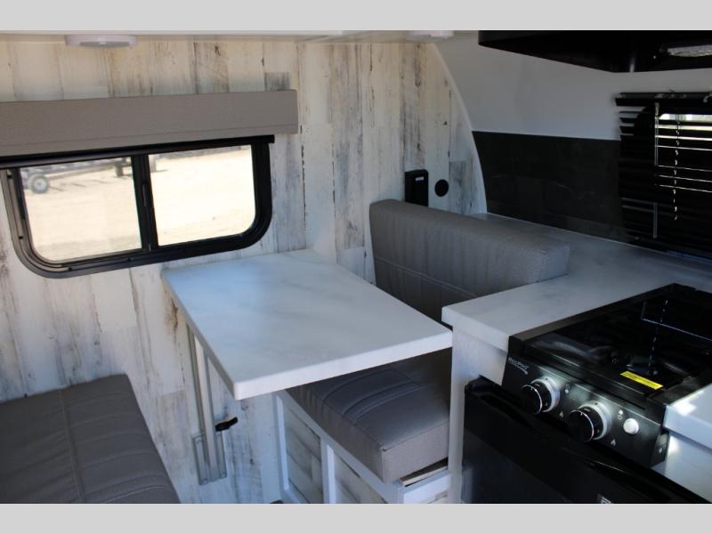 If you're looking for a lightweight trailer with a little more comfort, take a look at this one! There is a booth dinette that converts to a queen-size bed for a great night's rest, and the cassette toilet adds convenience so you don't' have to leave your trailer in the middle of the night. The kitchen includes a two burner stove, countertop and 12V refrigerator to keep food fresh. The front window with a black roller shade plus side windows will provide great outdoor views, and the storage organizer will keep your valuables tucked away. And an optional griddle/slide tray can be added if you want the option to cook meals outdoors!