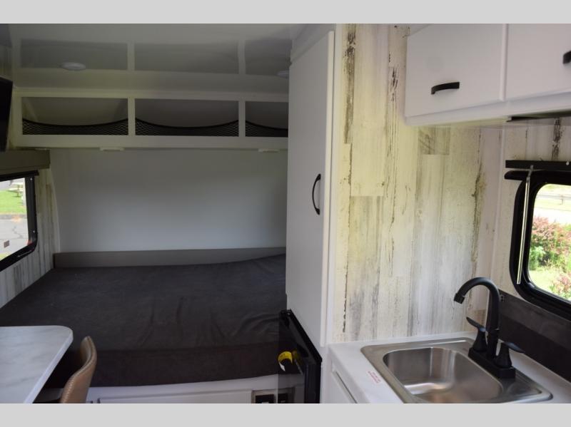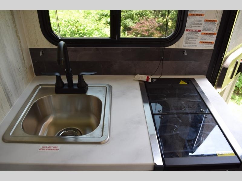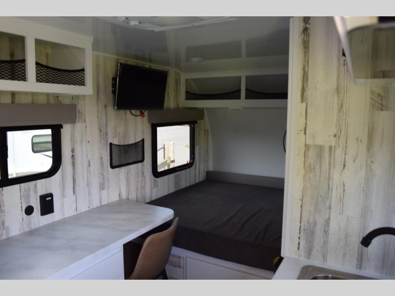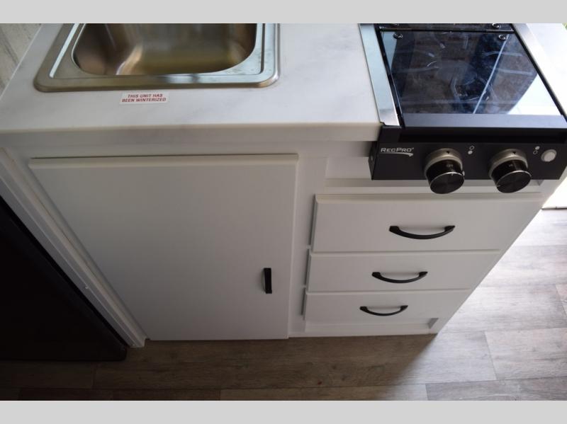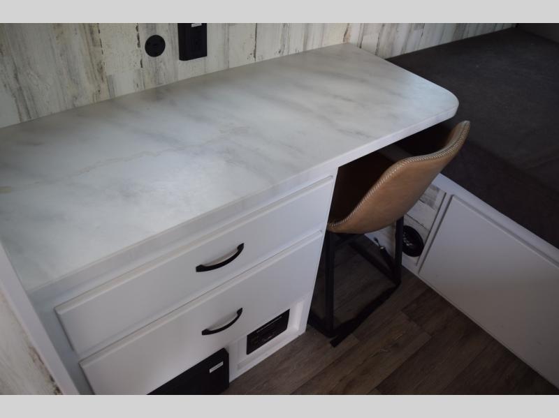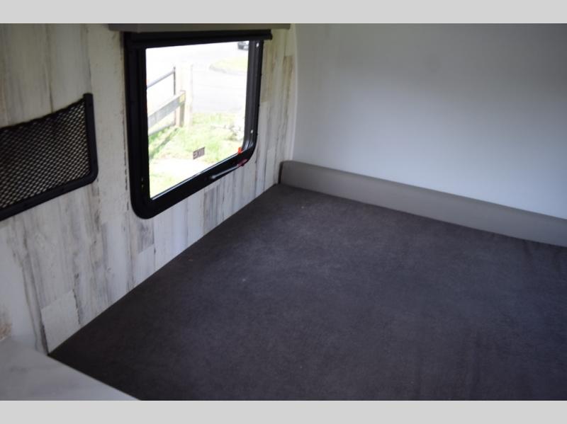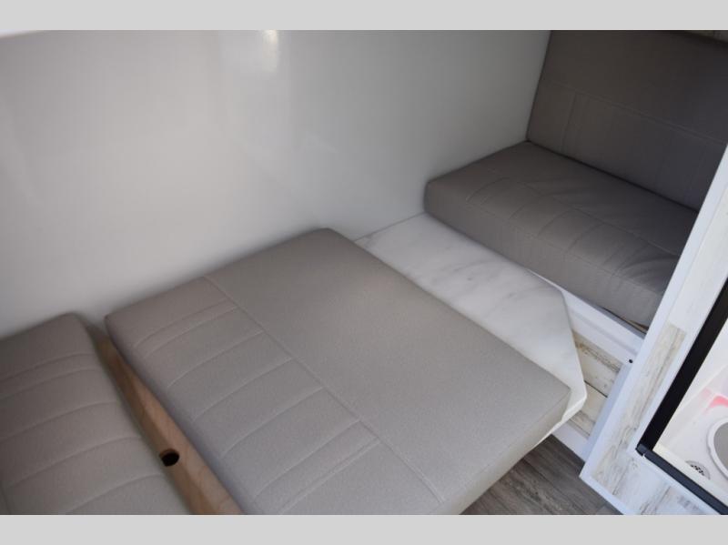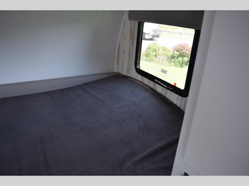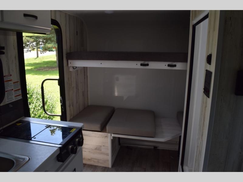 If you're looking for a lightweight trailer with a little more comfort, take a look at this one! There is a 60" x 77" bed to sleep on each night, along with a booth dinette that converts to a 78" x 30" bed and an upper 78" x 27" bunk, allowing you to sleep up to five! The kitchen includes a two burner stove, countertop and 12V refrigerator to keep food fresh. This unit also features four side windows, black roller shades, and a desk with desk drawers if you need to get some work done.
