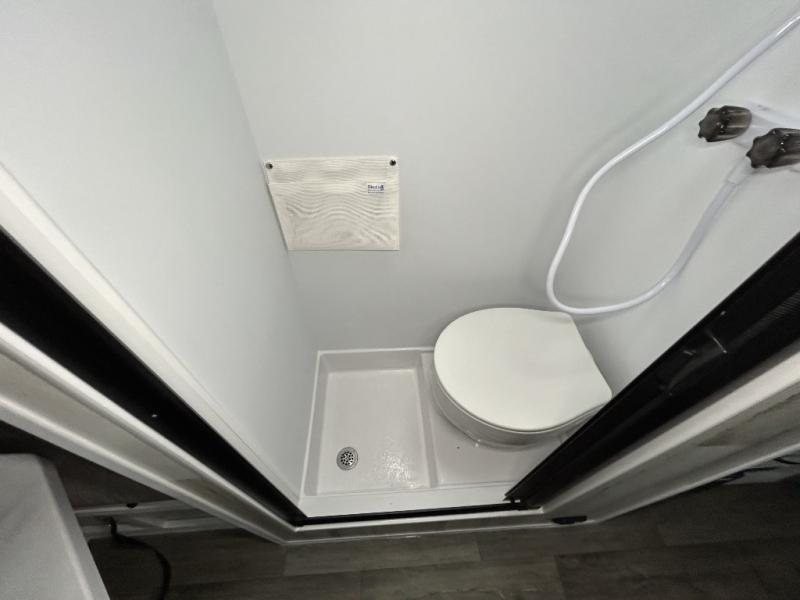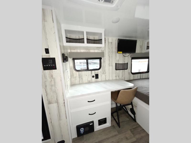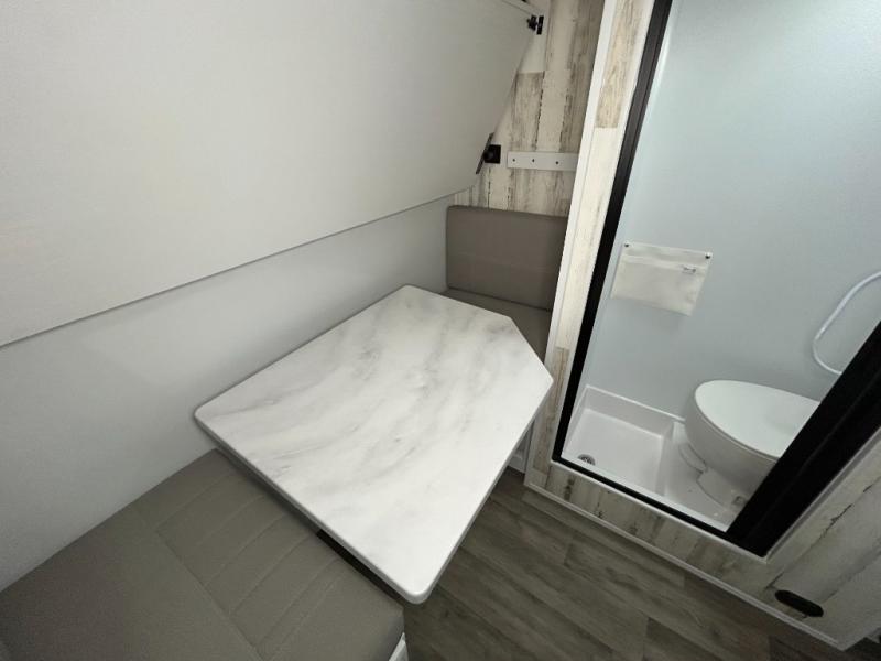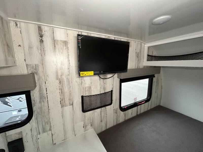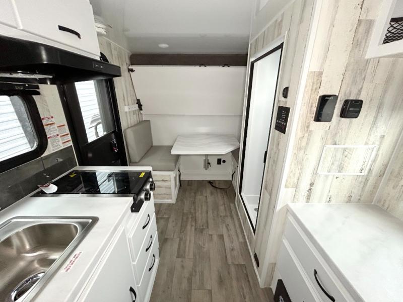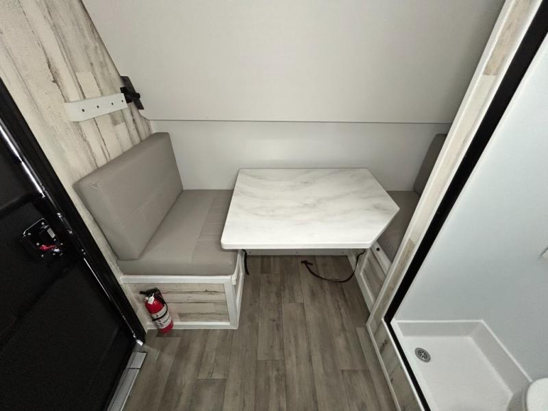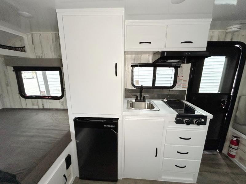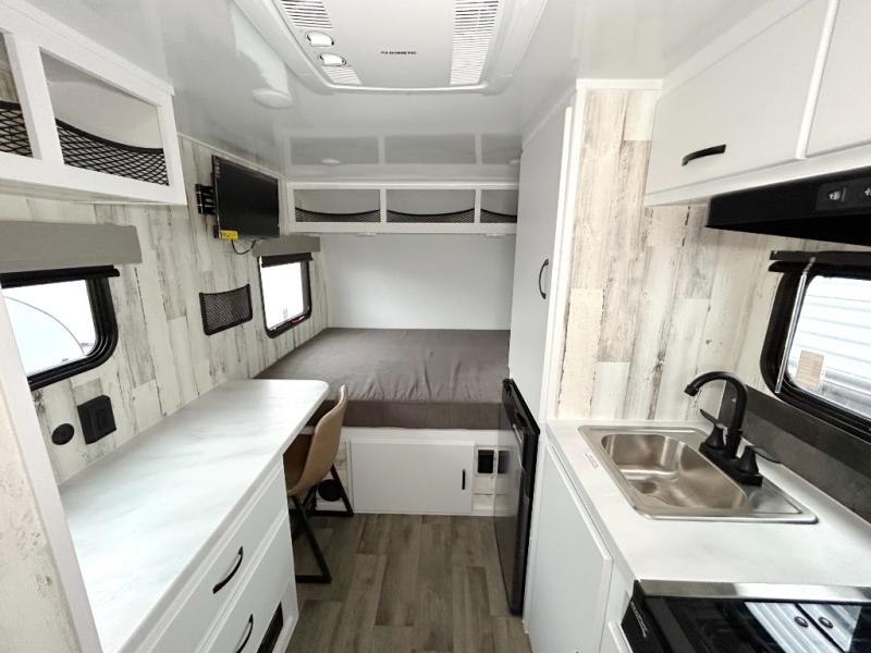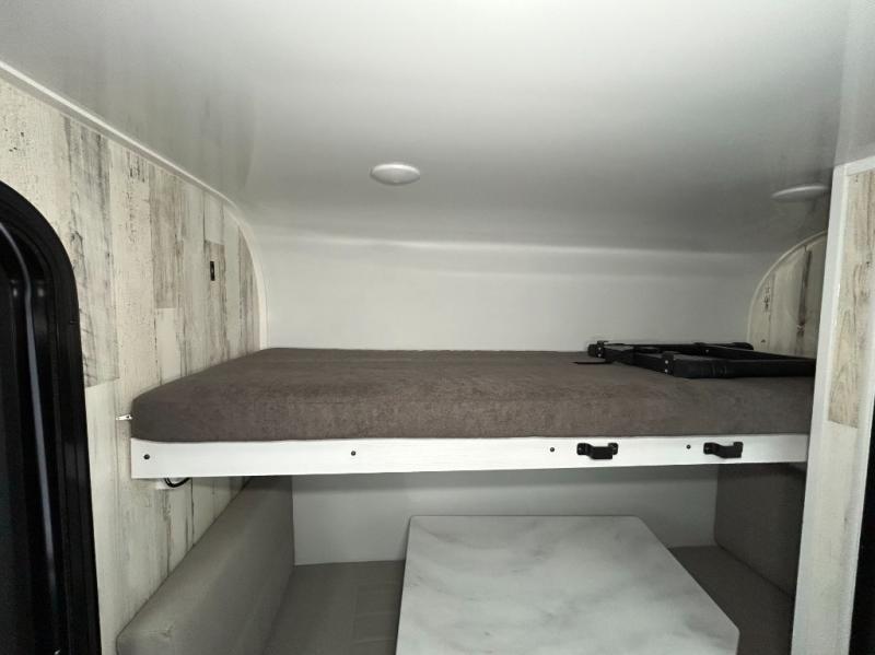 If you're looking for a lightweight trailer with a little more comfort, take a look at this one! There is a 60" x 77" bed to sleep on each night, along with a booth dinette that converts to a 78" x 30" bed and an upper 78" x 27" bunk, allowing you to sleep up to five! The kitchen includes a two burner stove, countertop and 12V refrigerator to keep food fresh. This unit also features four side windows, black roller shades, and a desk with desk drawers if you need to get some work done.