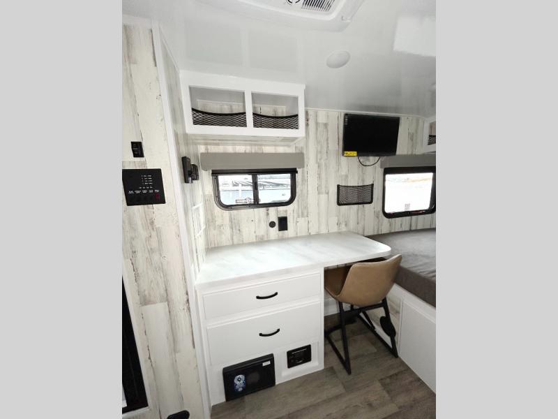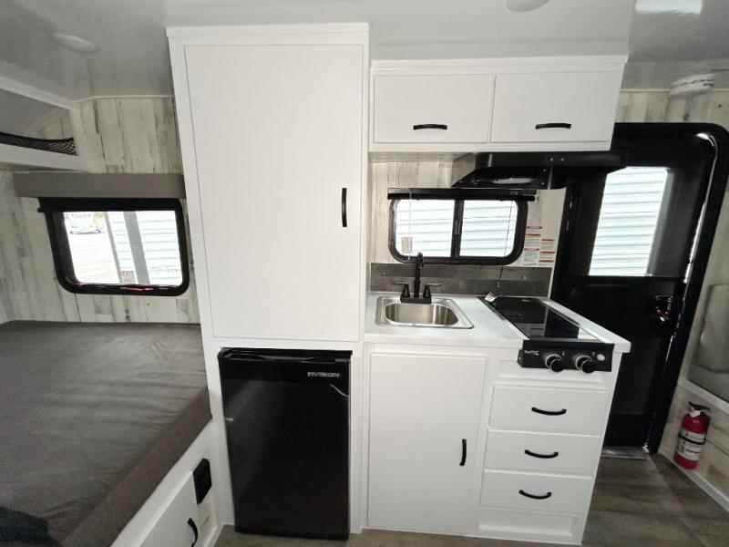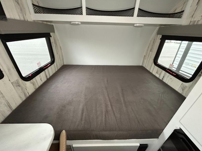 If you're looking for a lightweight trailer with a little more comfort, take a look at this one! There is a 60" x 79" bed to sleep on each night, along with a booth dinette that converts to a 78" x 30" bed and an upper 78" x 27" bunk, allowing you to sleep five to six! The kitchen includes a two burner stove, countertop and 12V refrigerator to keep food fresh. This unit also features four front side windows, black roller shades, a 24" 12V HDTV, and many more comforts!