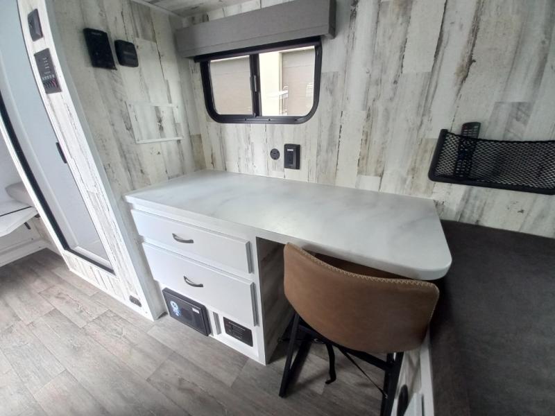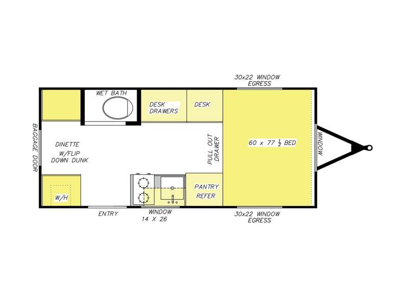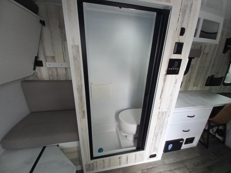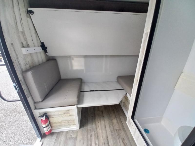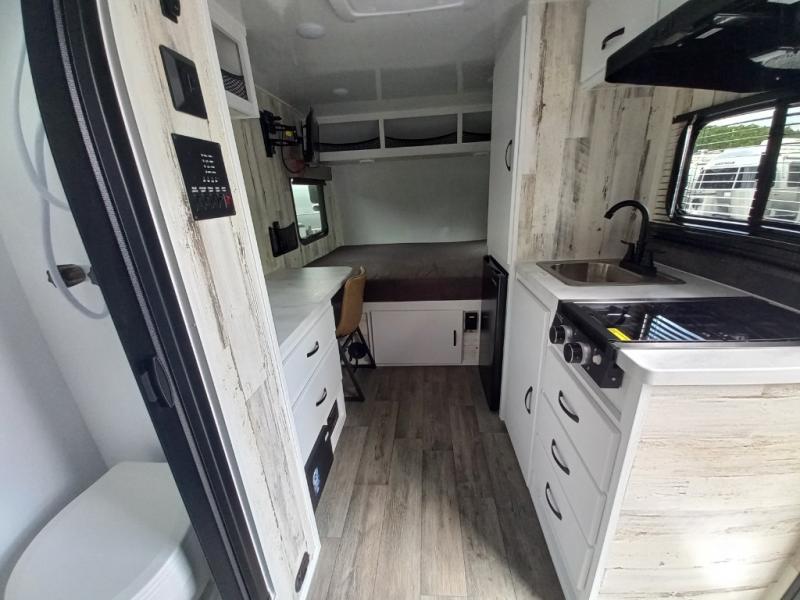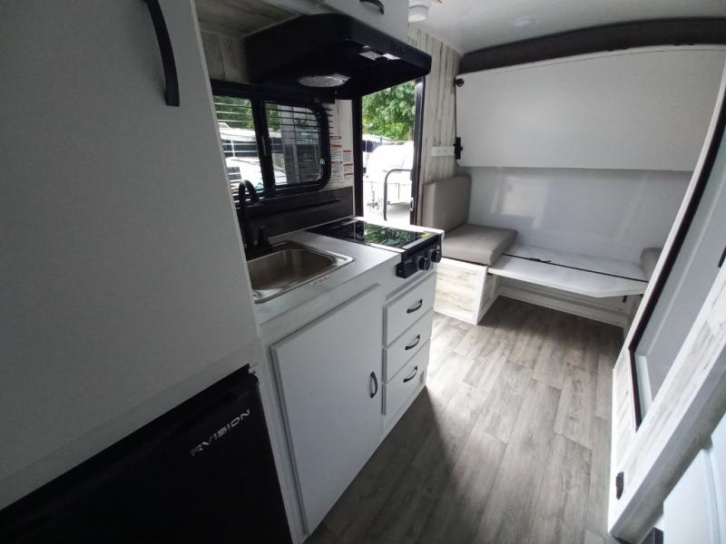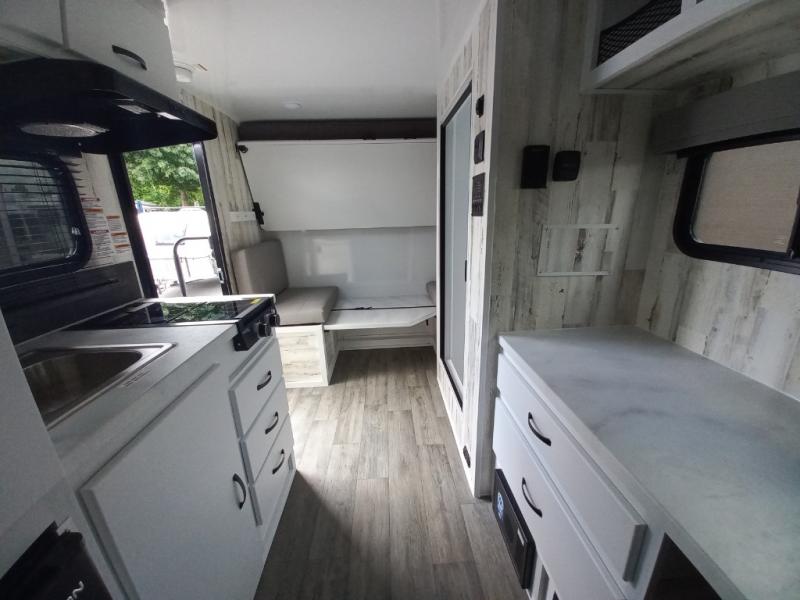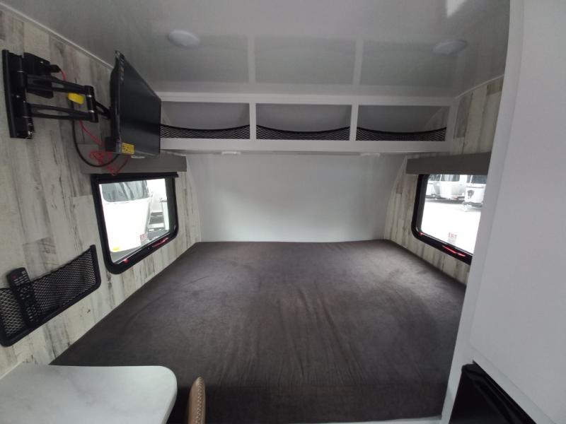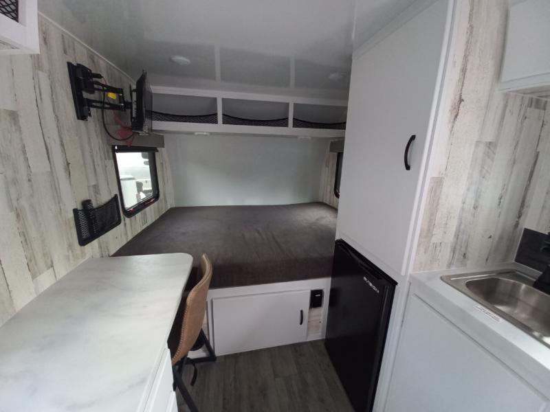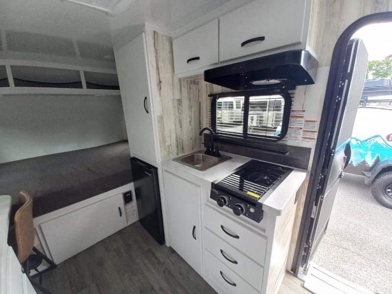If you're looking for a lightweight trailer with a little more comfort, take a look at this one! There is a 60" x 79" bed to sleep on each night, along with a booth dinette that converts to a 78" x 30" bed and an upper 78" x 27" bunk, allowing you to sleep five to six! The kitchen includes a two burner stove, countertop and 12V refrigerator to keep food fresh. This unit also features four front side windows, black roller shades, a 24" 12V HDTV, and many more comforts!