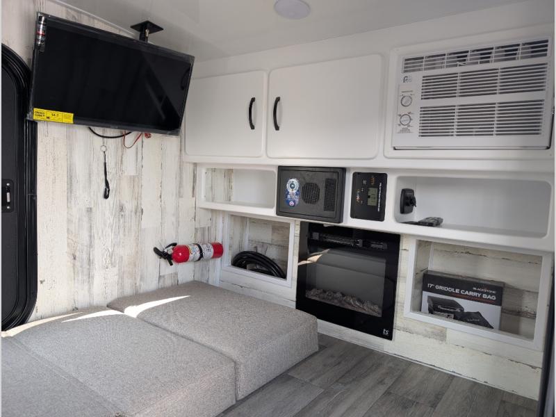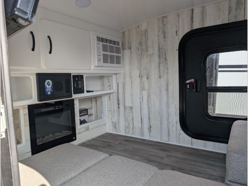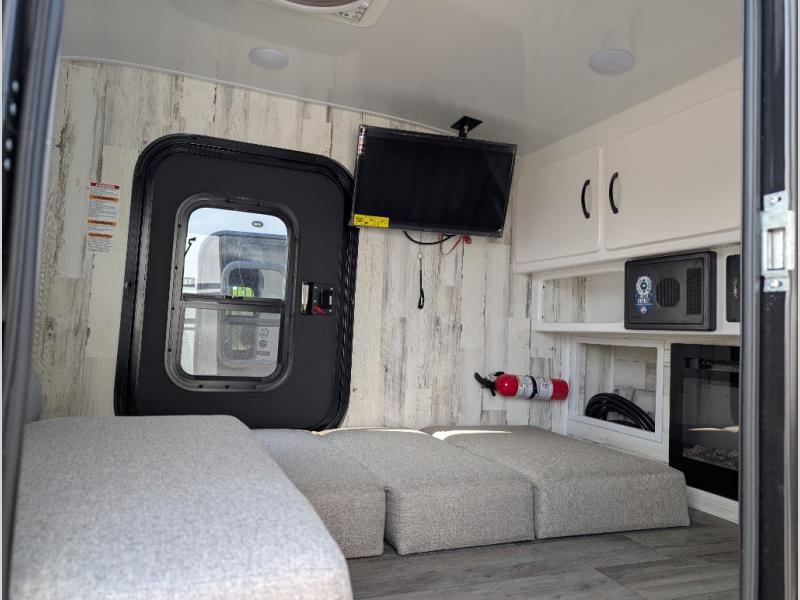 Take this Little Buggy wherever the road leads you! There is sleeping space for two adults on a comfy 6" memory foam mattress, and storage for your necessities with three cubbies and four enclosed cabinets inside, all built with premium birch wood. More storage can be found in the front exterior box made of steel for either your clothing, dry food, or gear. The mattress easily converts to a sofa which is perfect for daytime relaxing. Also inside, you will enjoy a fireplace to warm you right up on those cool summer evenings or crisp, fall mornings, and the HD TV will entertain you when the weather keeps you indoors. The roof top carriage rack allows you to carry your paddle boards, bikes, or more camping gear, or you can add the optional rooftop tent which will allow you to sleep two more!