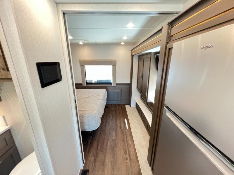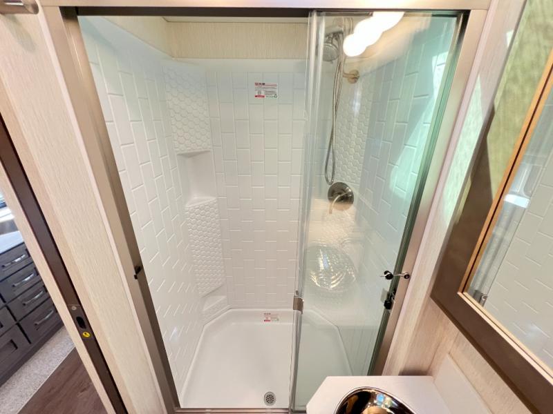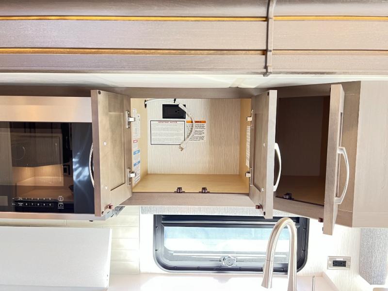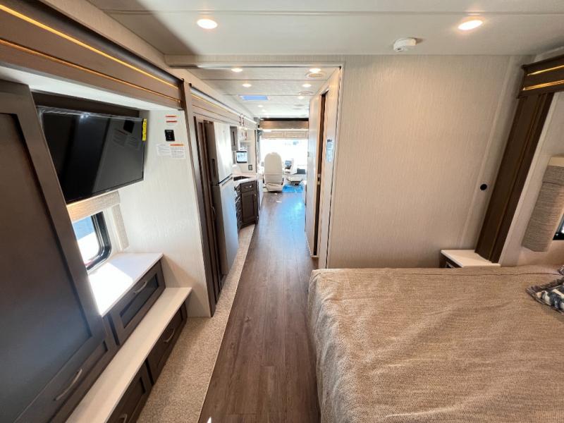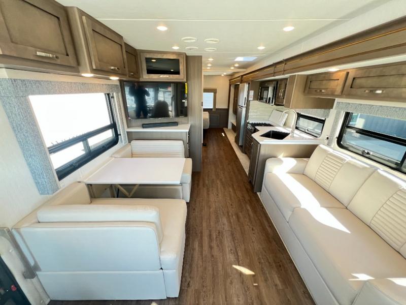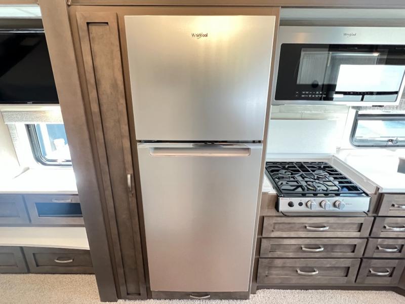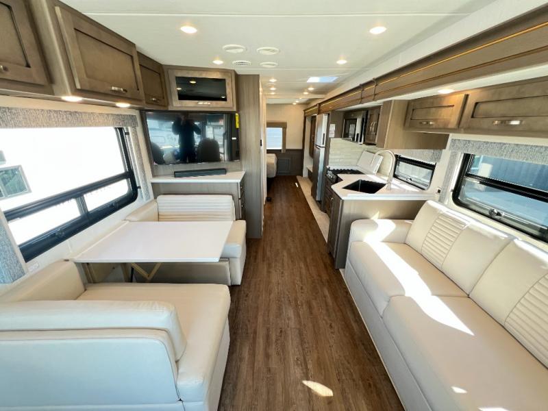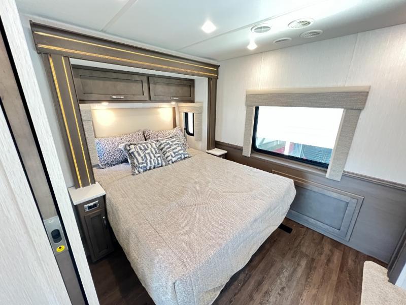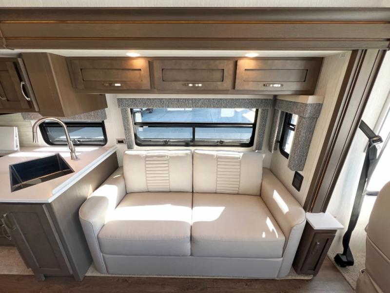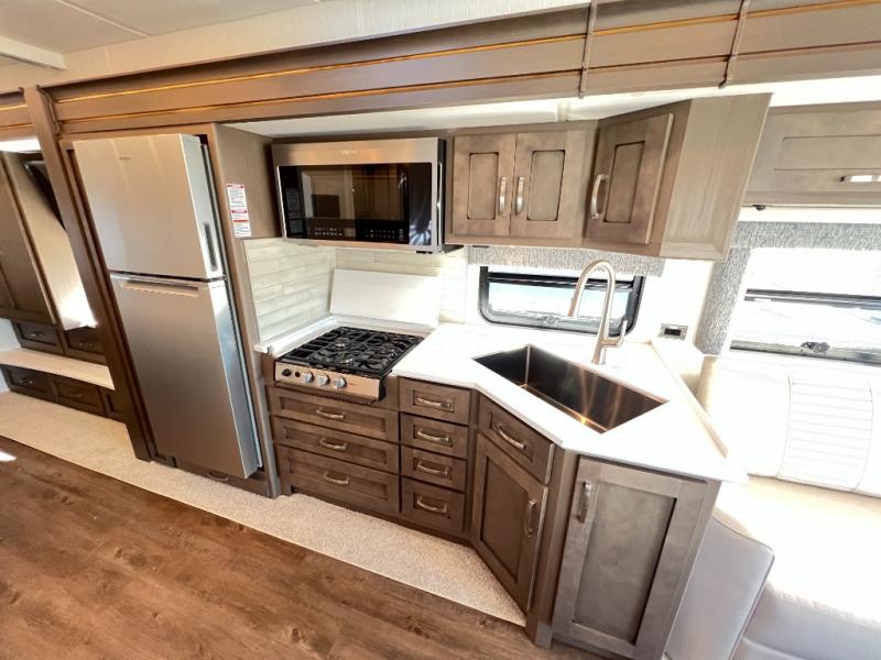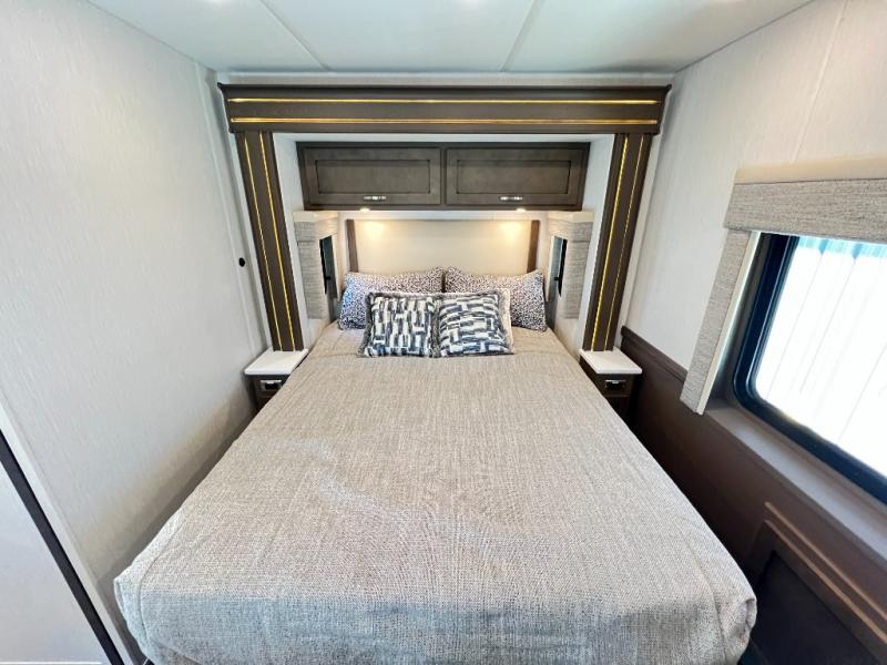Enjoy luxury at every turn in this Bay Star motorhome. The full-wall slide provides added space, along with the queen bed slide out in the rear private bedroom. You can easily prepare meals on the recessed three burner cooktop, or use the stainless steel convection microwave, and the pantry will be perfect for dry goods or snacks. This model includes a comfort lounge sofa and a booth dinette for seating and sleeping space, plus there is a Samsung LED TV in the living room and bedroom so you can watch your favorite shows. You'll find storage space up front, plenty of overhead compartments, plus lit basement storage.