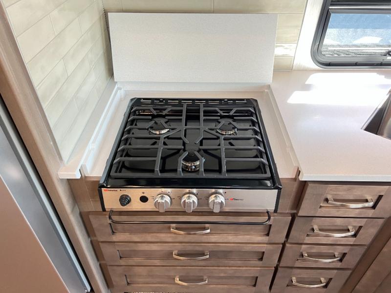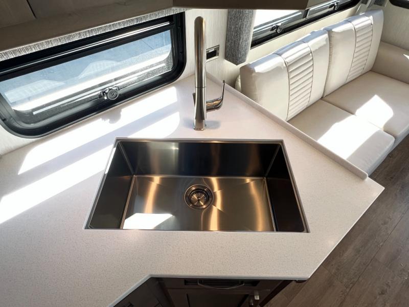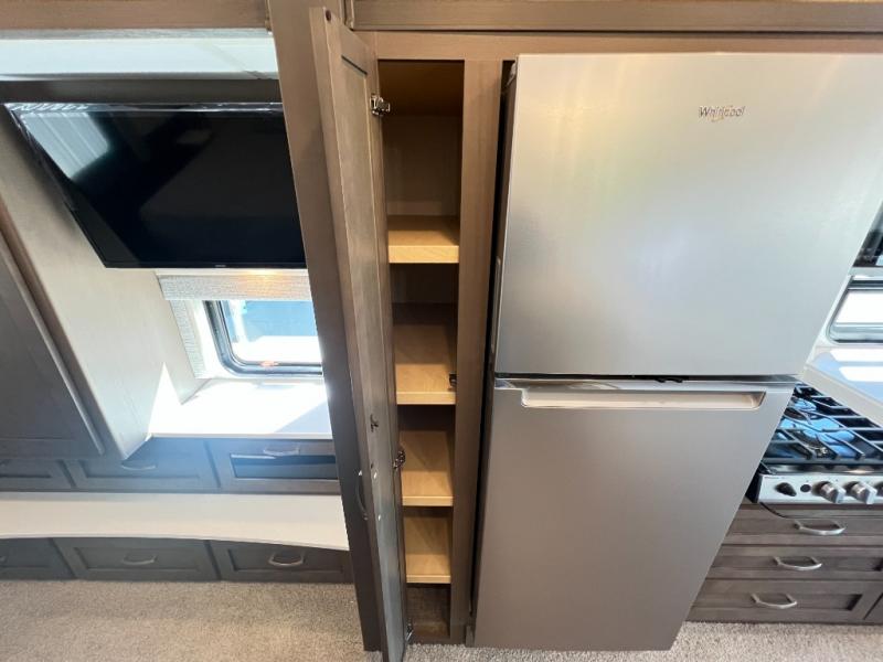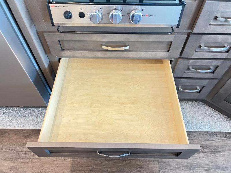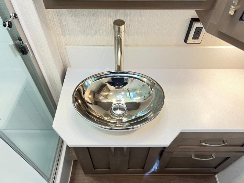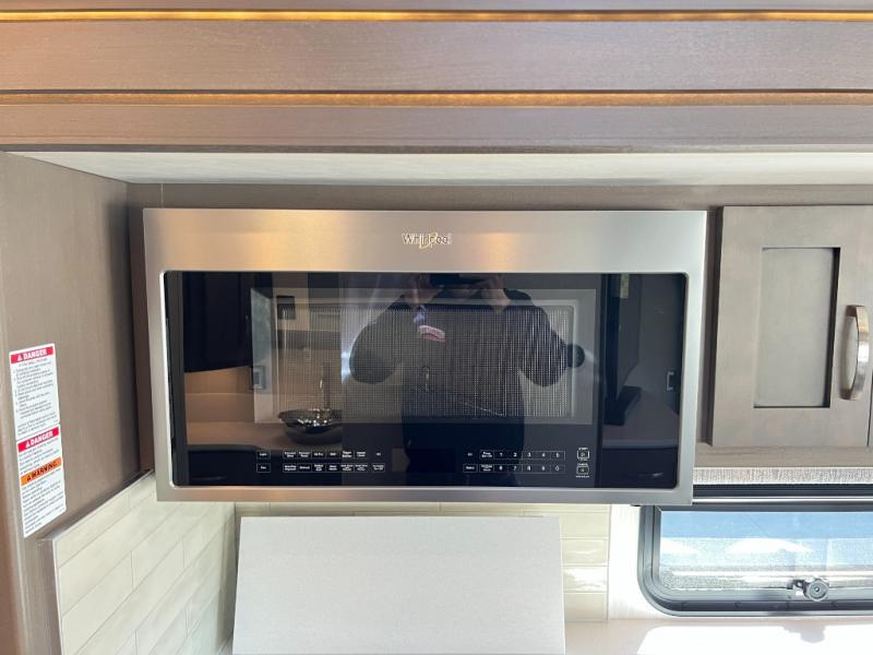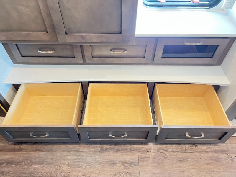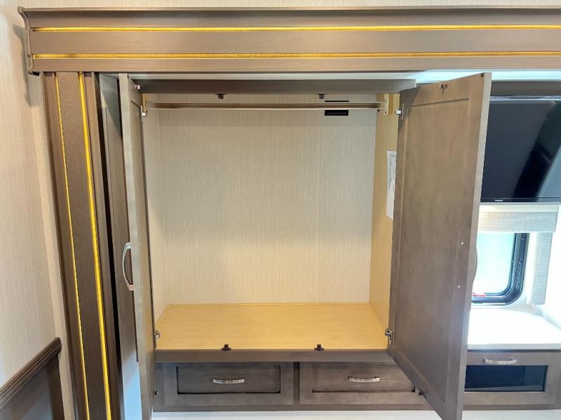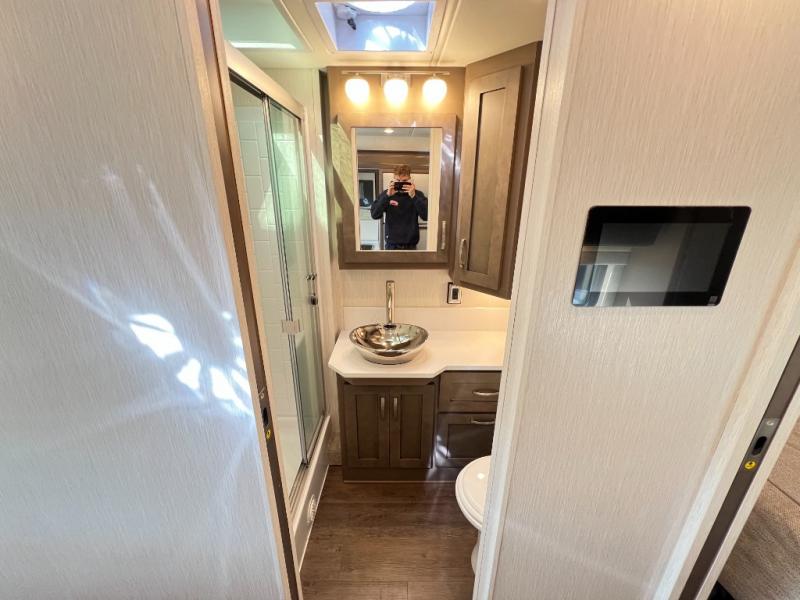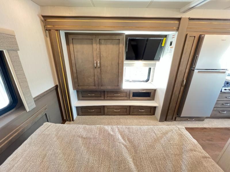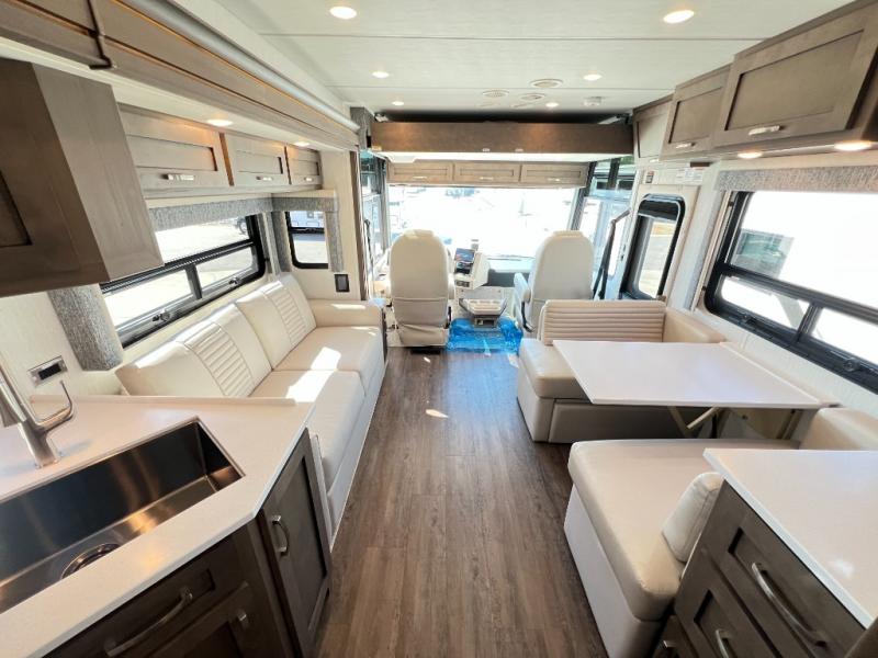 Enjoy luxury at every turn in this Bay Star motorhome. The full-wall slide provides added space, along with the queen bed slide out in the rear private bedroom. You can easily prepare meals on the recessed three burner cooktop, or use the stainless steel convection microwave, and the pantry will be perfect for dry goods or snacks. This model includes a comfort lounge sofa and a booth dinette for seating and sleeping space, plus there is a Samsung LED TV in the living room and bedroom so you can watch your favorite shows. You'll find storage space up front, plenty of overhead compartments, plus lit basement storage.