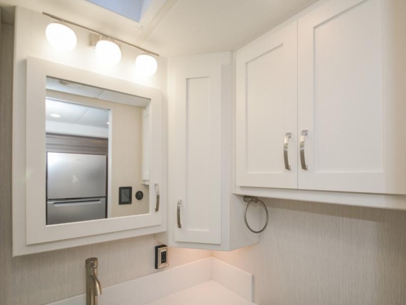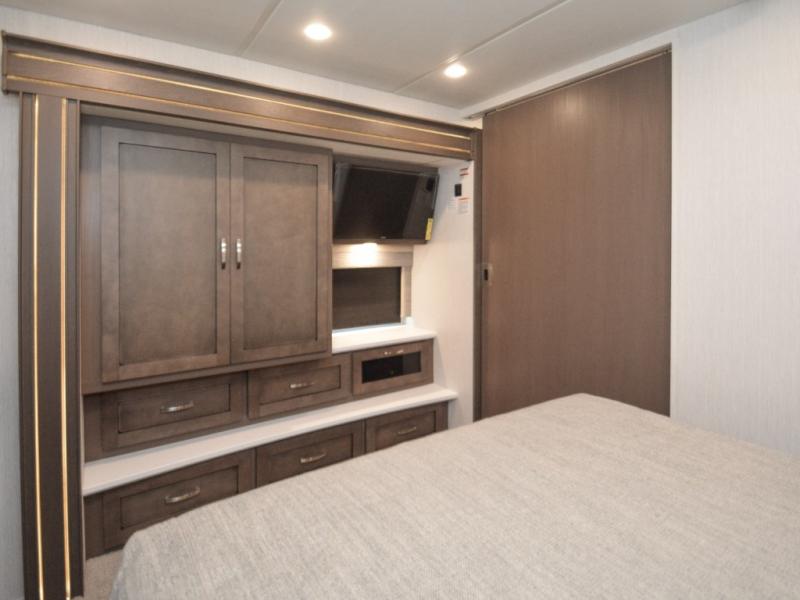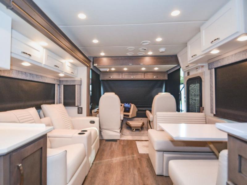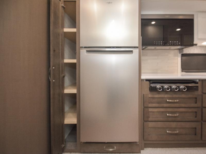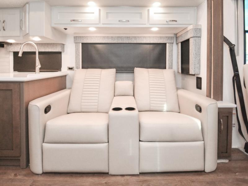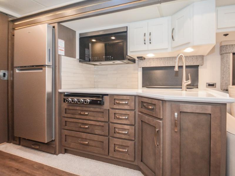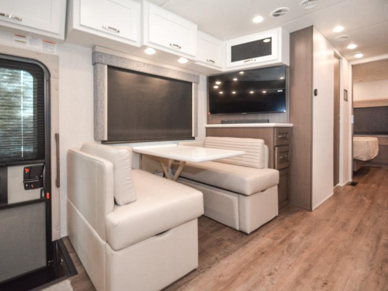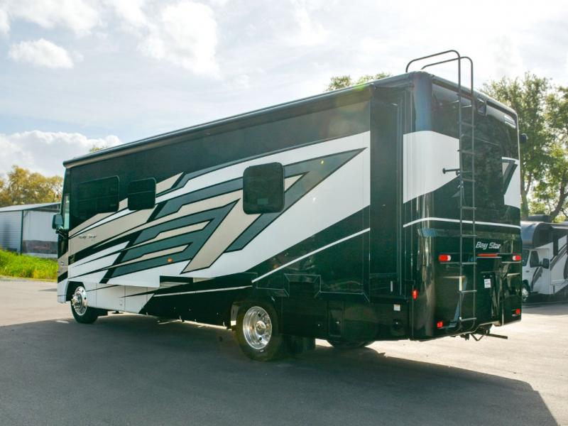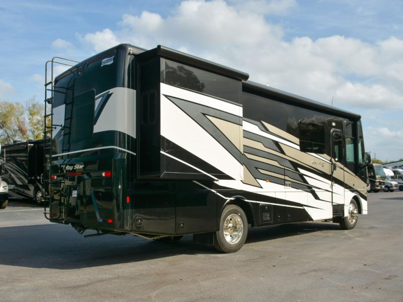 Enjoy luxury at every turn in this Bay Star motorhome. The full-wall slide provides added space, along with the bed slide out in the rear private bedroom. You can easily prepare meals on the recessed three burner cooktop, or use the stainless steel convection microwave, and the pantry will be perfect for dry goods or snacks. This model includes a comfort lounge sofa and a booth dinette for seating and sleeping space, plus there is a Samsung LED TV in the living room and bedroom so you can watch your favorite shows. You'll find storage space up front, plenty of overhead compartments, plus lit basement storage.